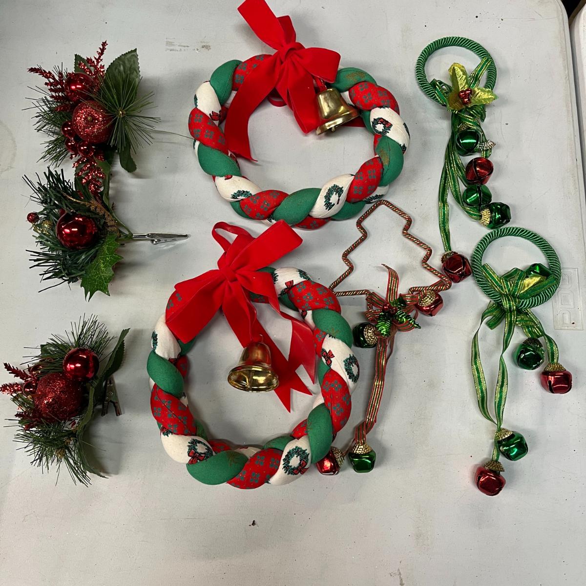 Ornaments, braided wreaths, bells, crocheted Santa band.