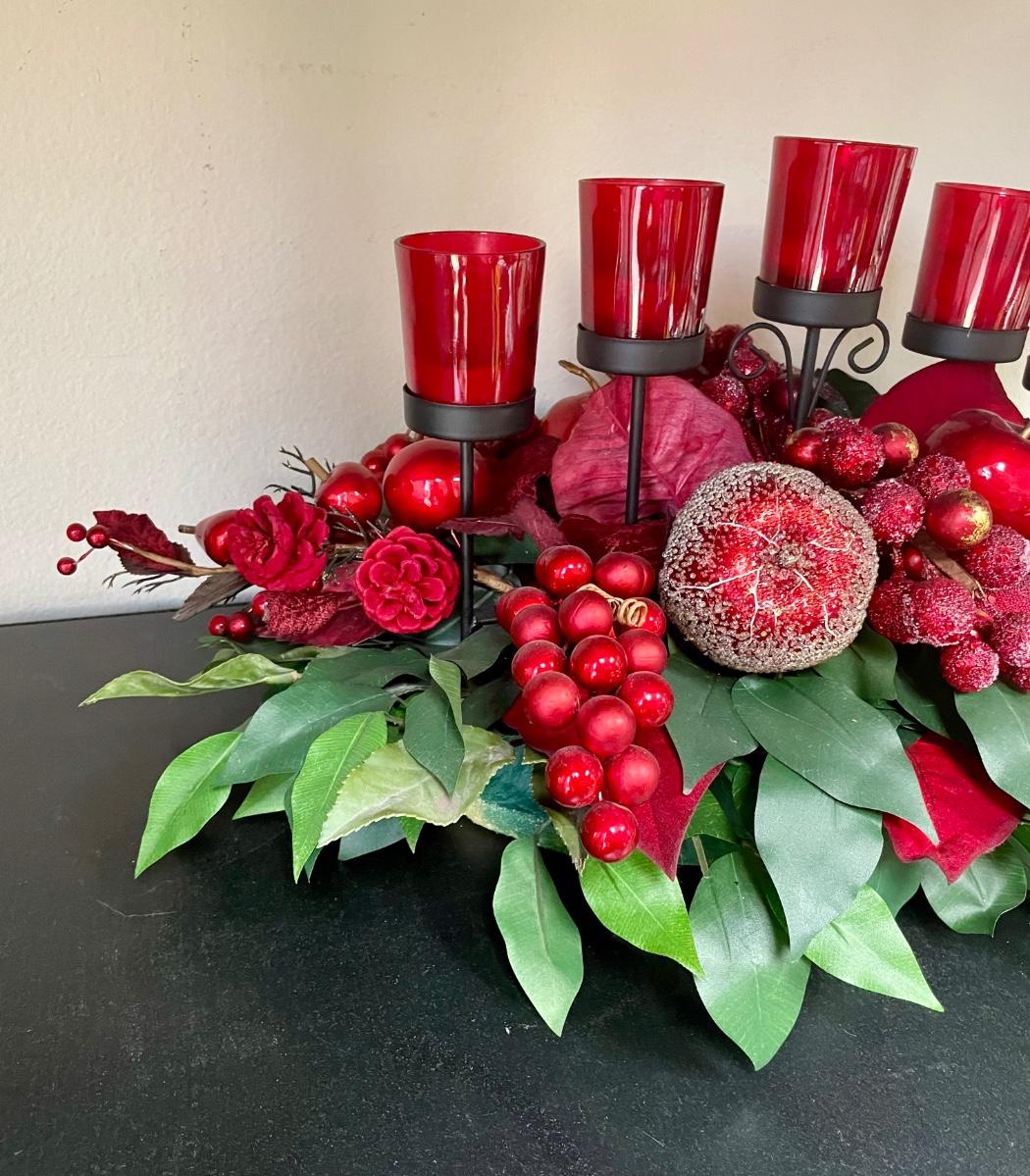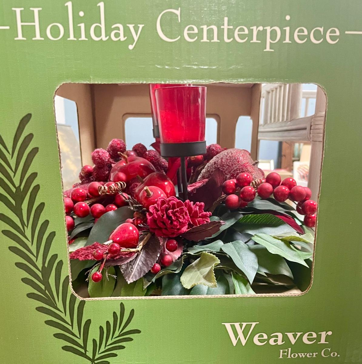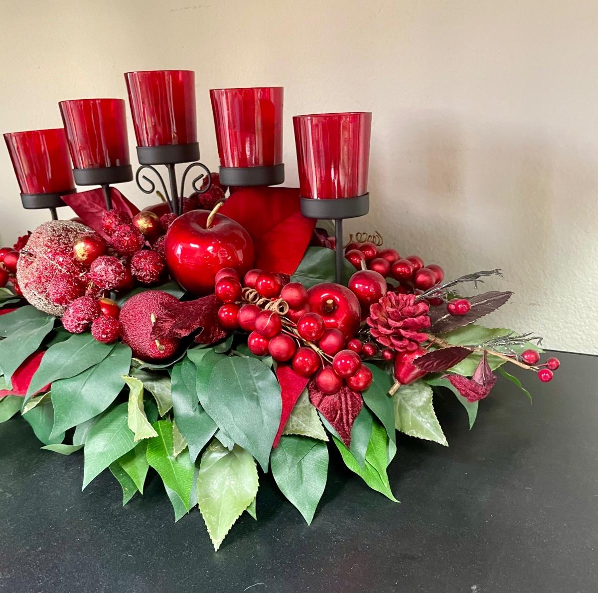 Holiday table centerpiece by Weaver. Bright red and green colors, has 5 red candle holders. Approx. 24” long.