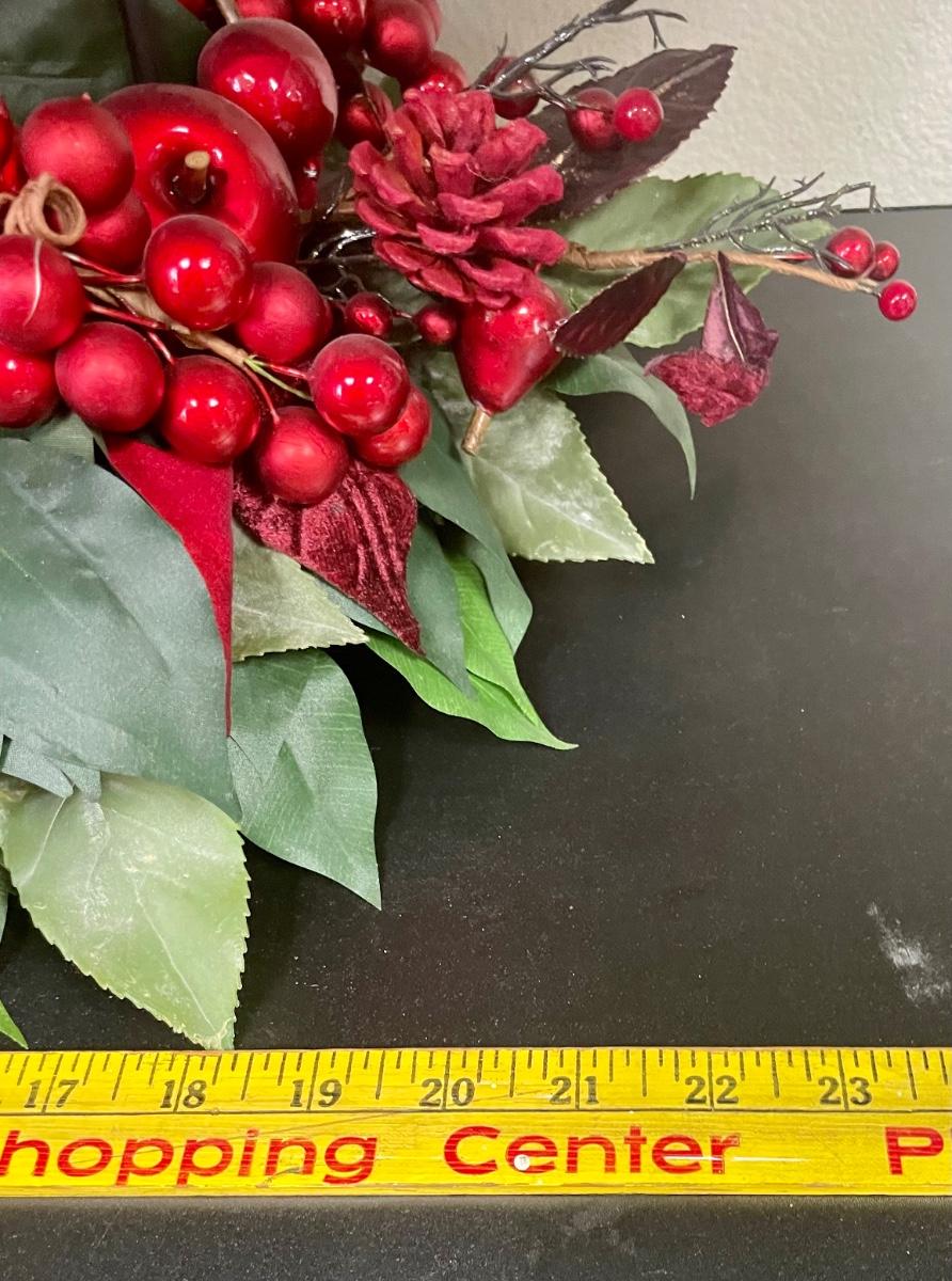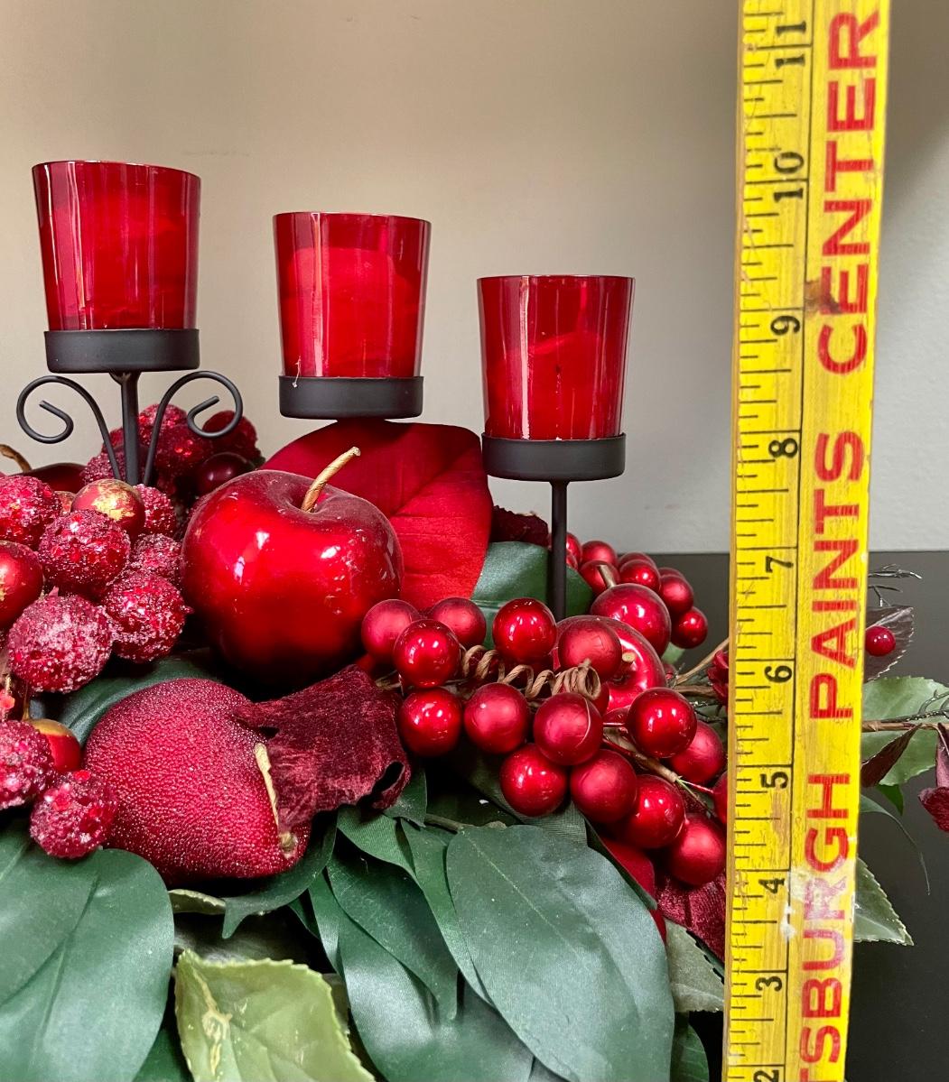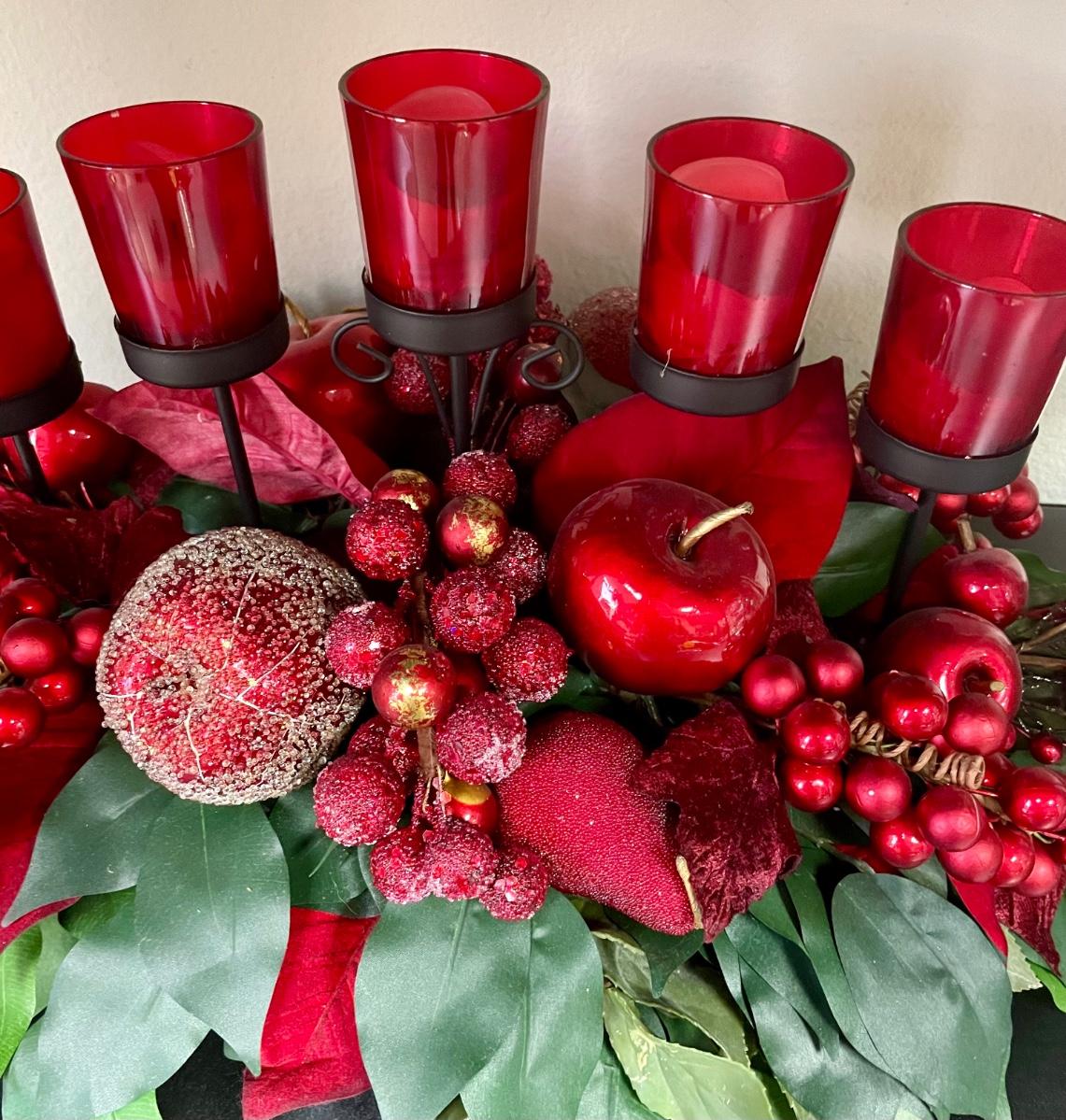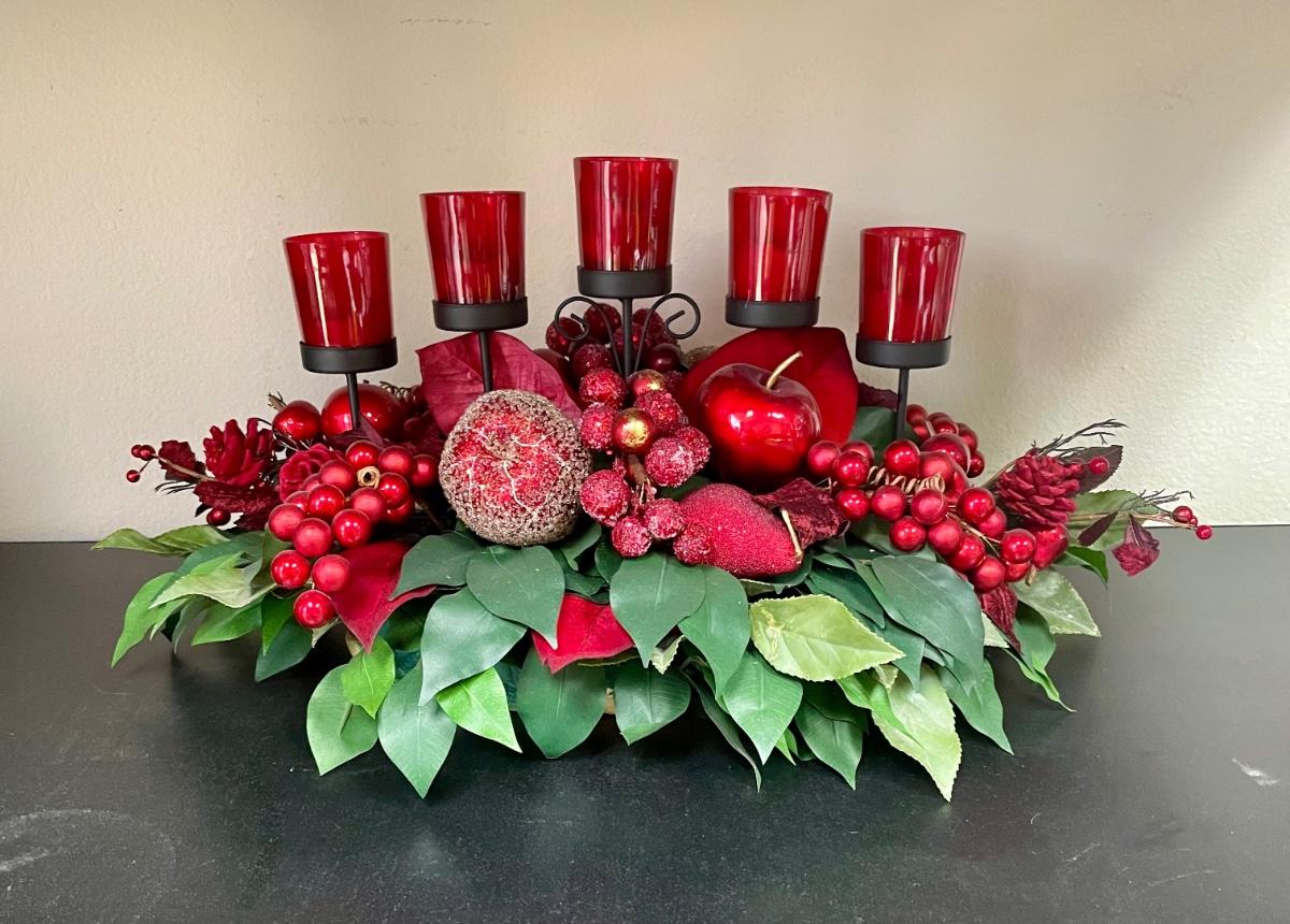 Holiday table centerpiece by Weaver. Bright red and green colors, has 5 red candle holders. Approx. 24” long.