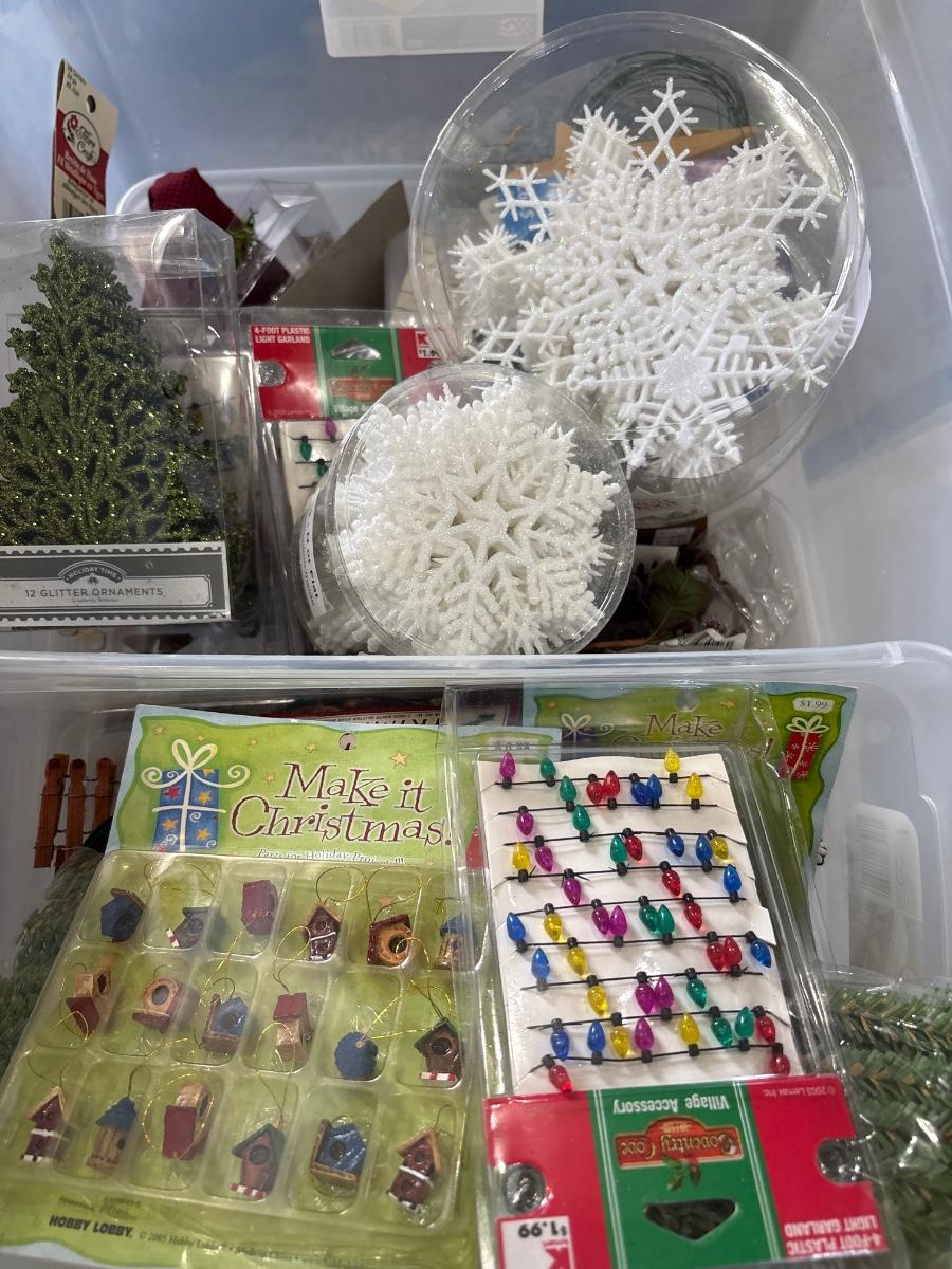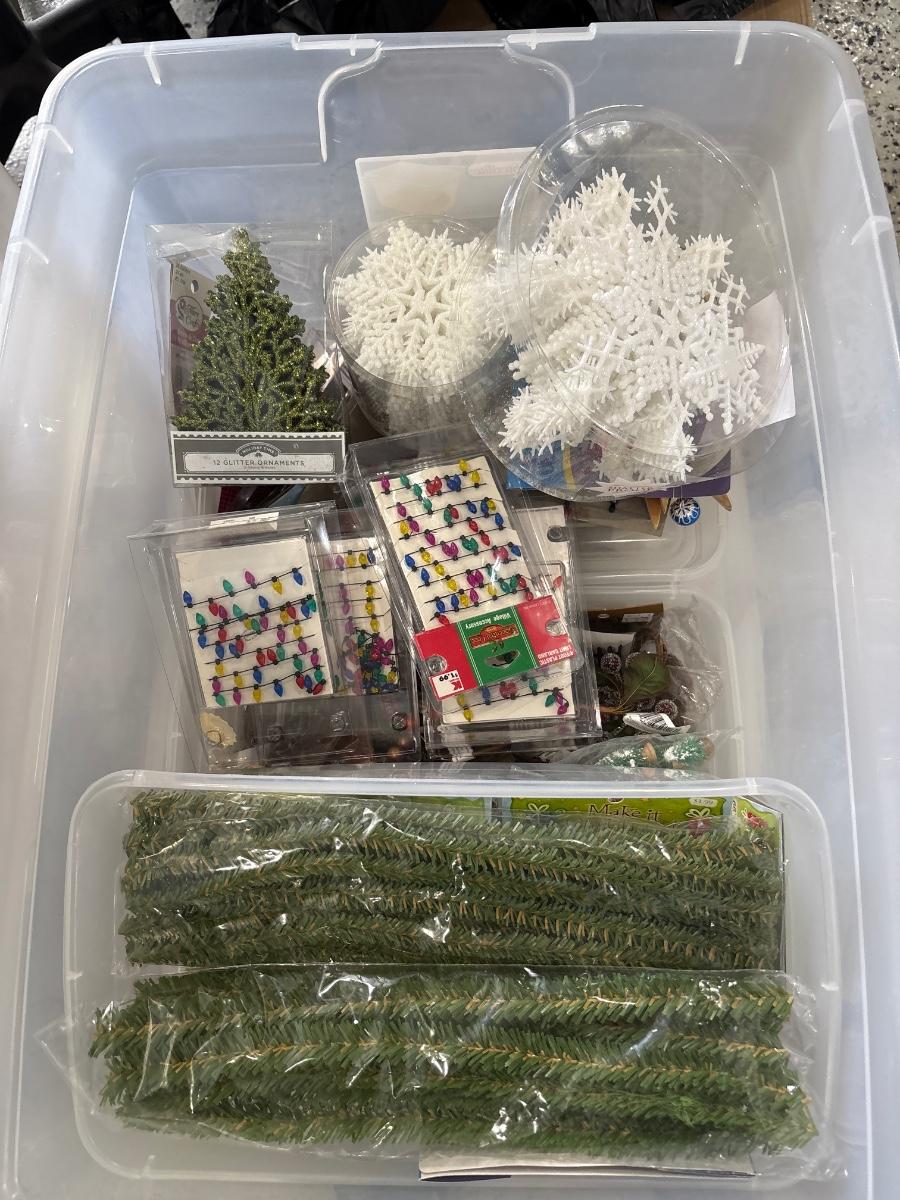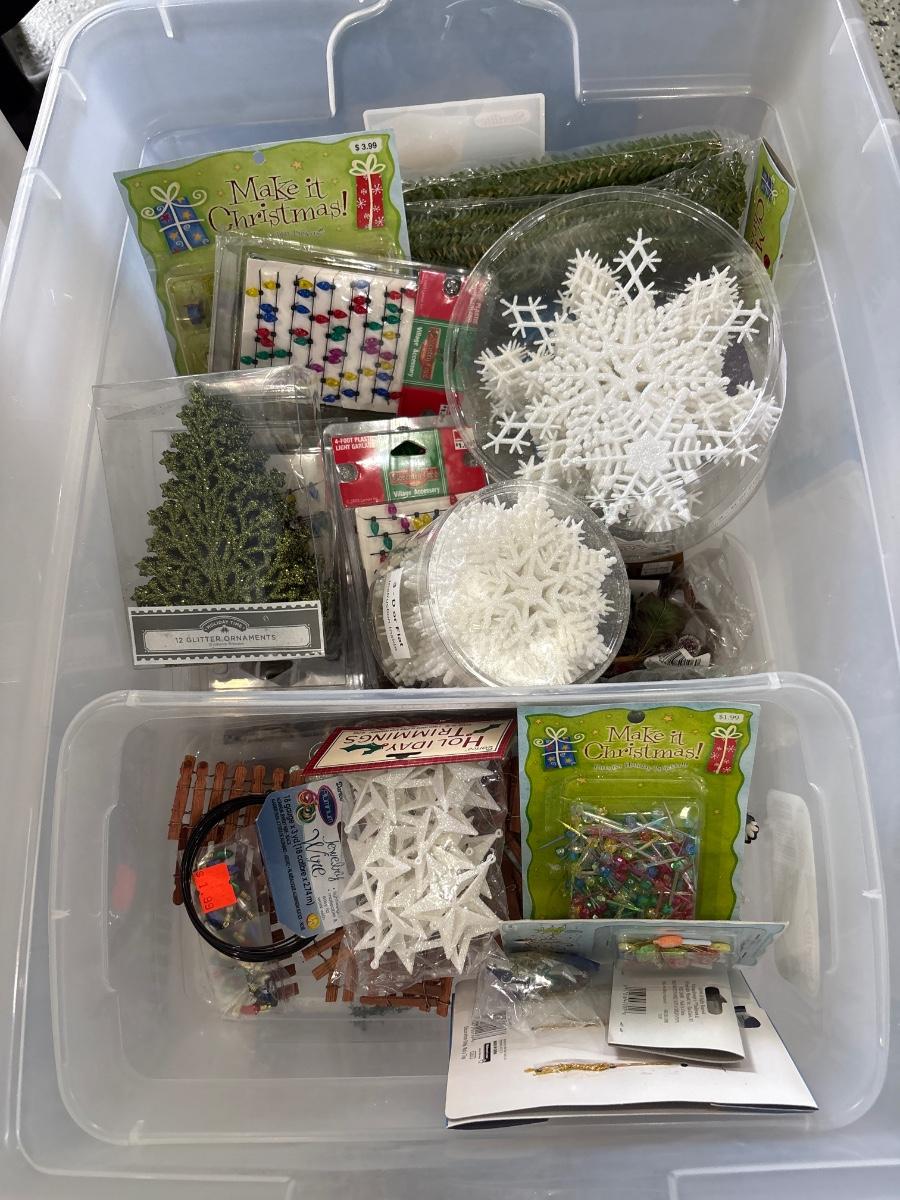 Tote full of holiday crafting items. Includes snowflake forms, glitter, ornaments, and more.