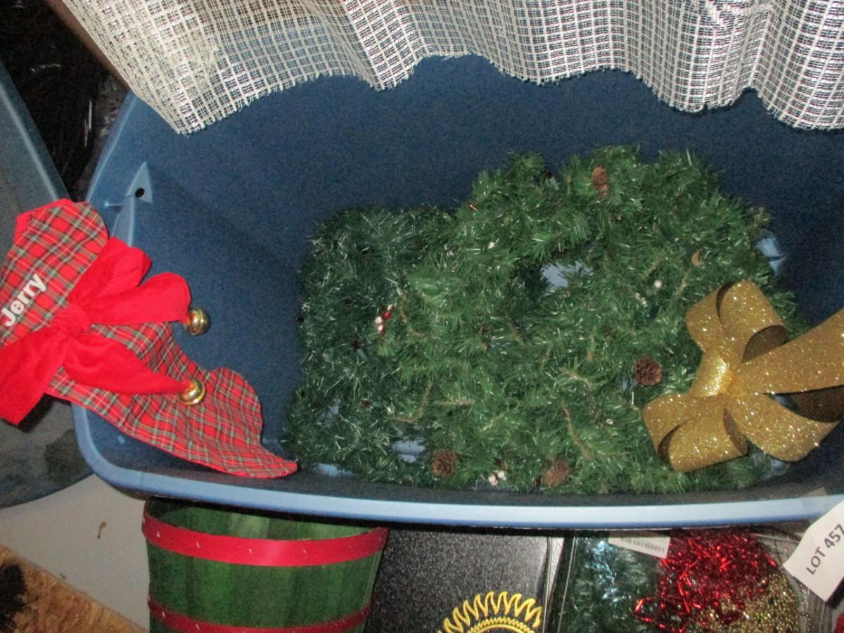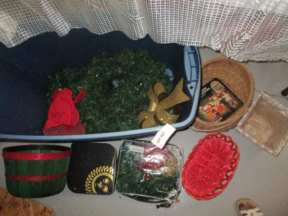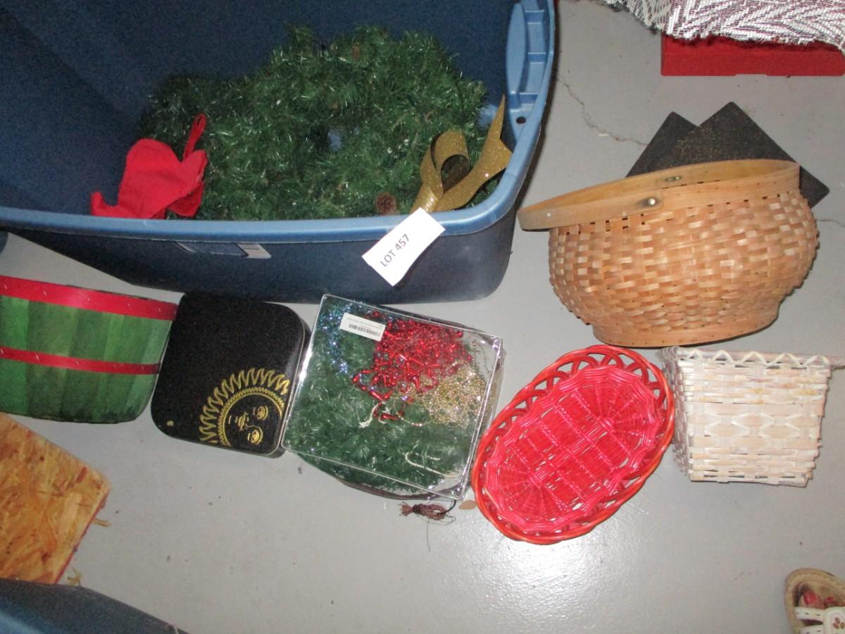 Holiday Decor, baskets, garland, gold glitter bow