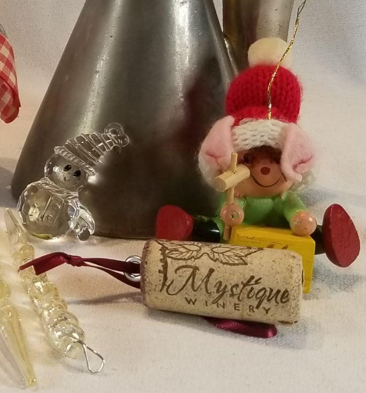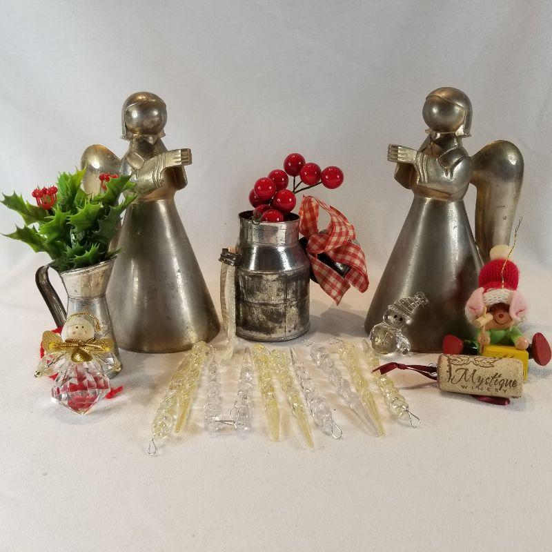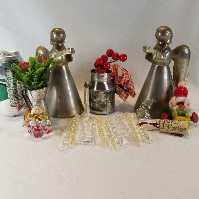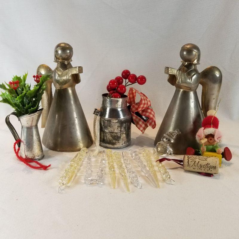 Nice collection of metal holiday decor, Two metal angels, 2 small tin ornaments, an acrylic mini snowman, and an elf and wine stopper ornament with plastic ice cycles. All in very good condition.