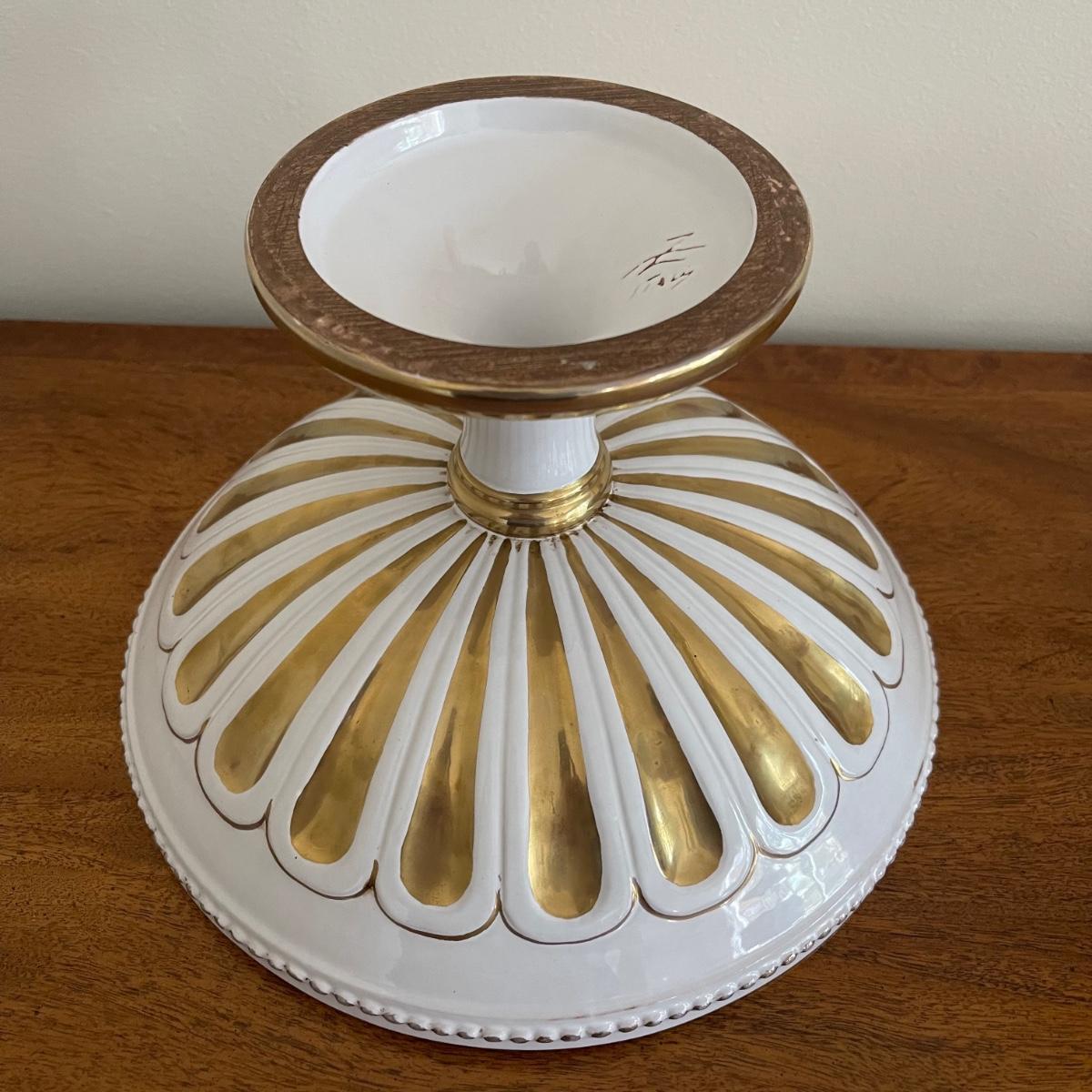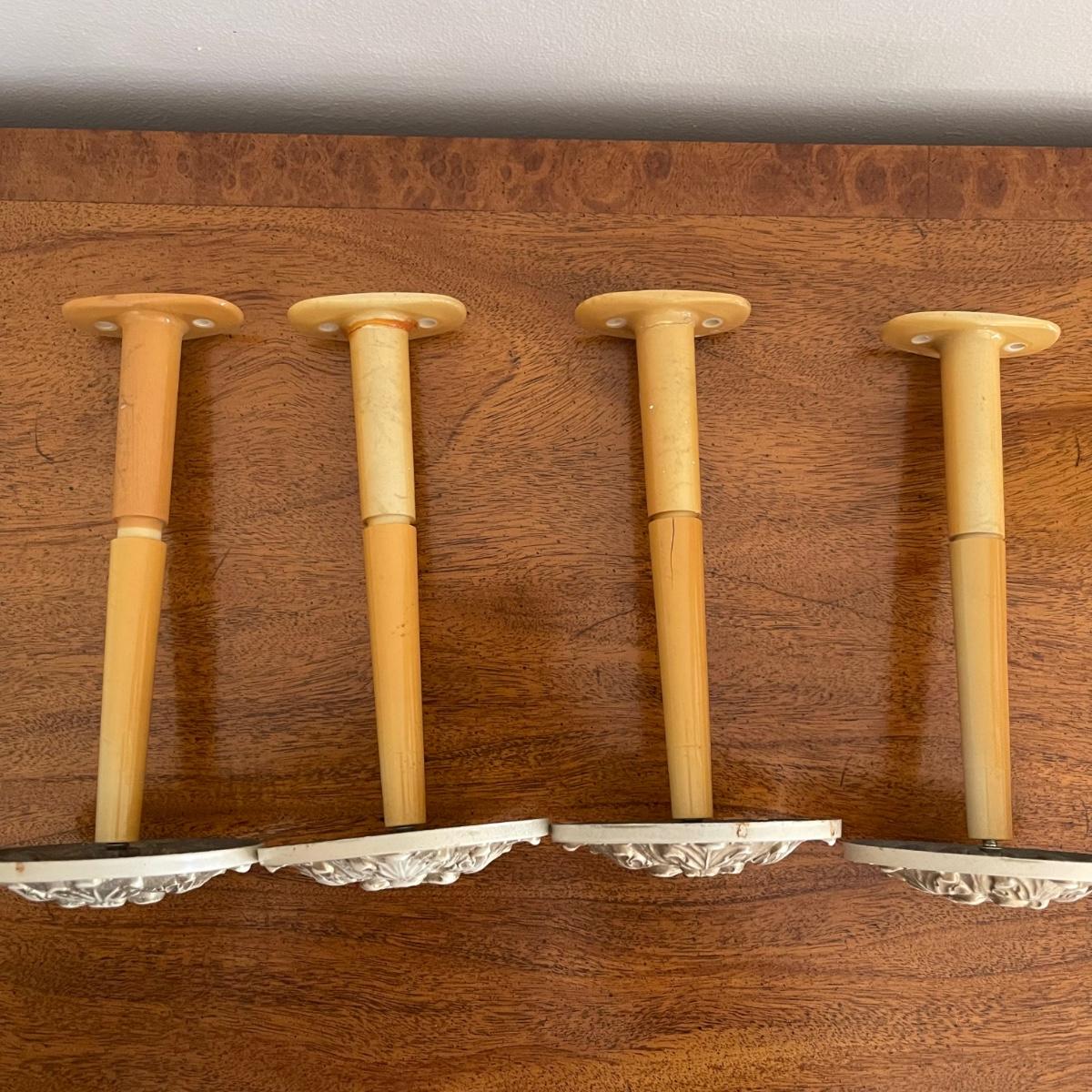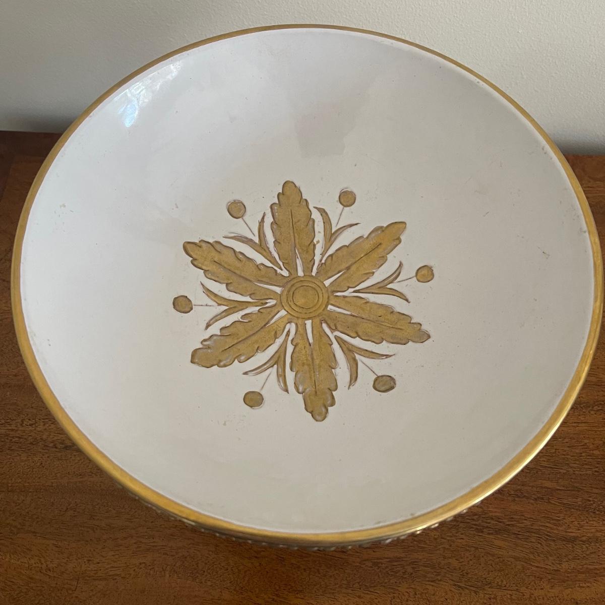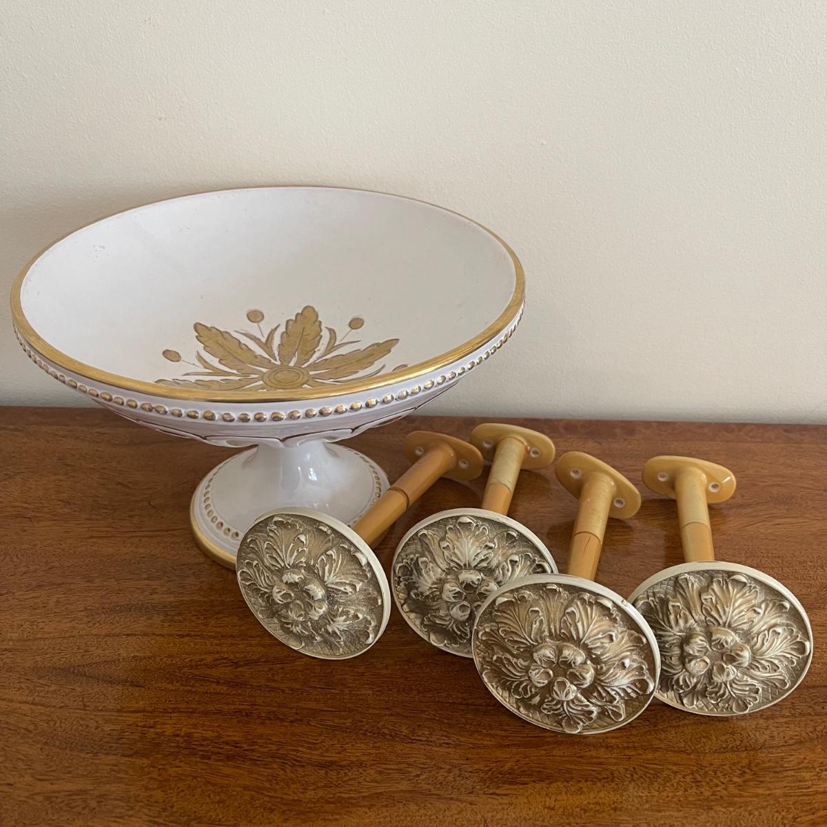 This lot includes a beautiful white Italian pedestal bowl with gold detailing and designs. and four curtain pull backs ((heads are almost 3.5” in diameter) that mount to the wall. These are plastic based with metal accent pieces on the ends. They look vintage. The bowl measures 10” in diameter and stands 6.5” tall. Shipping available