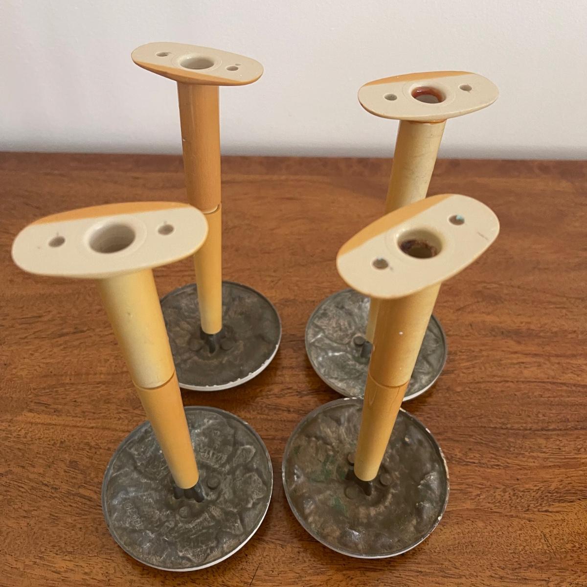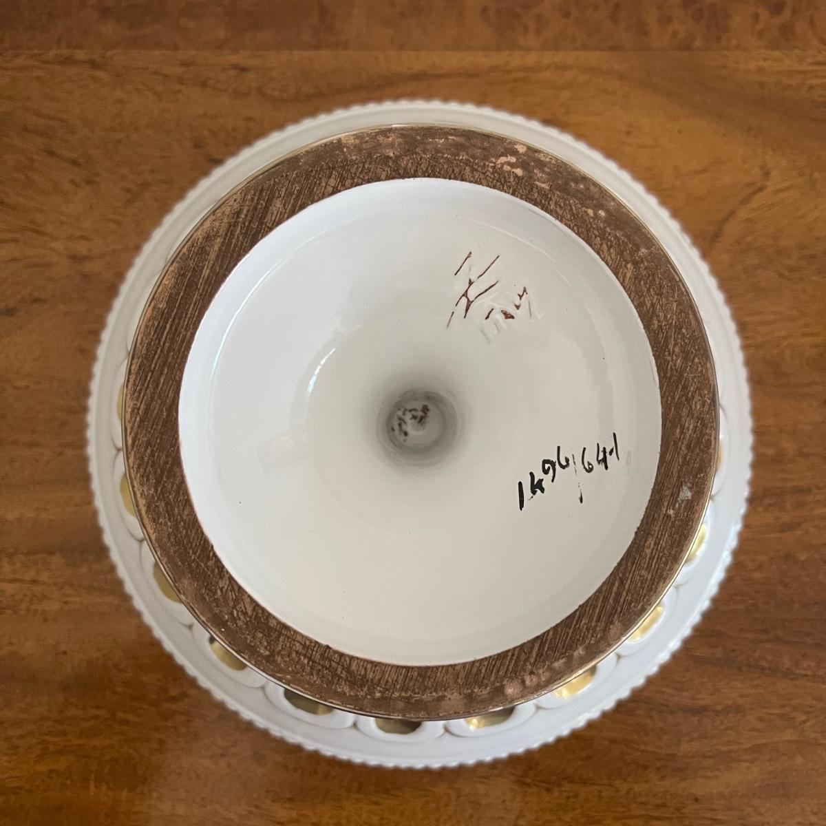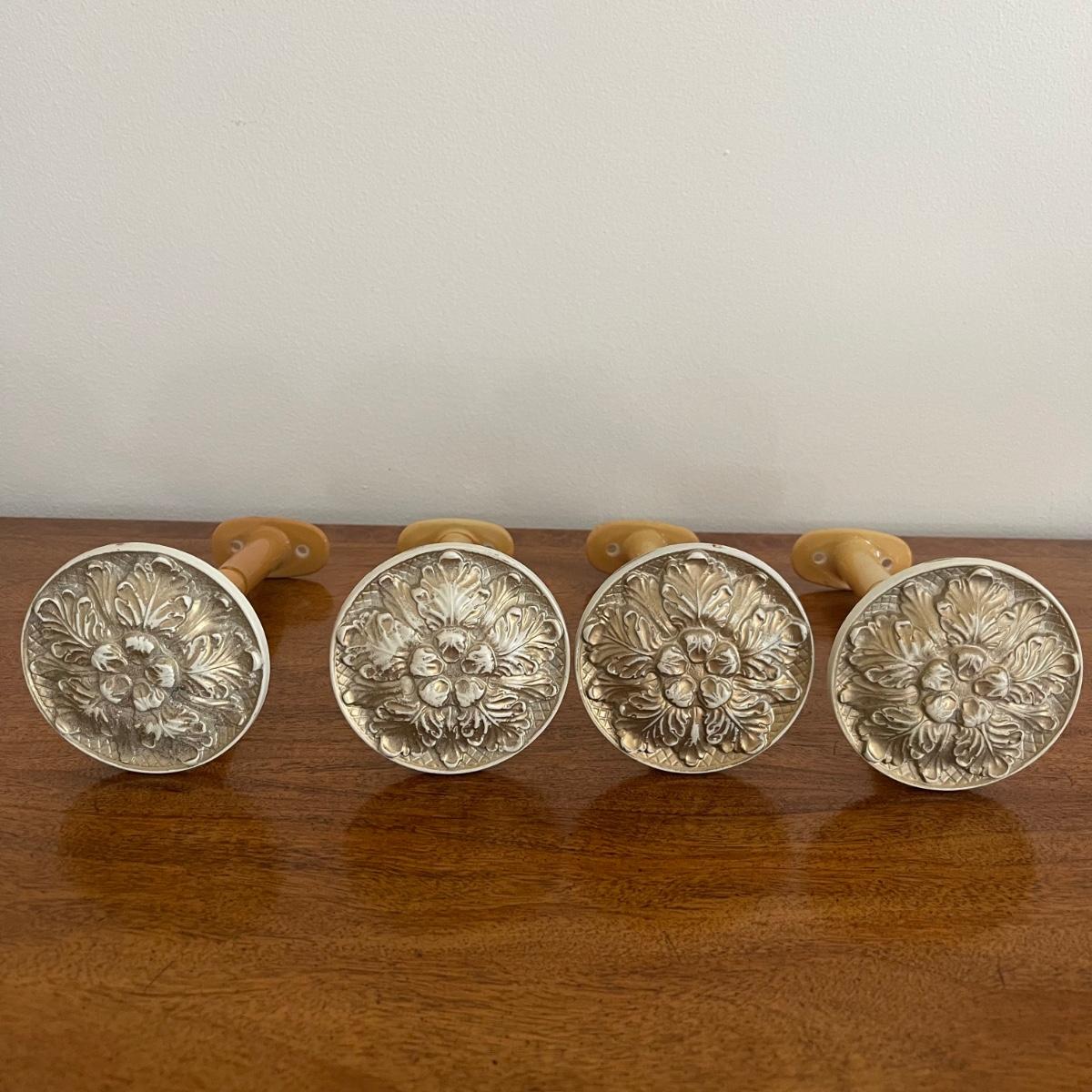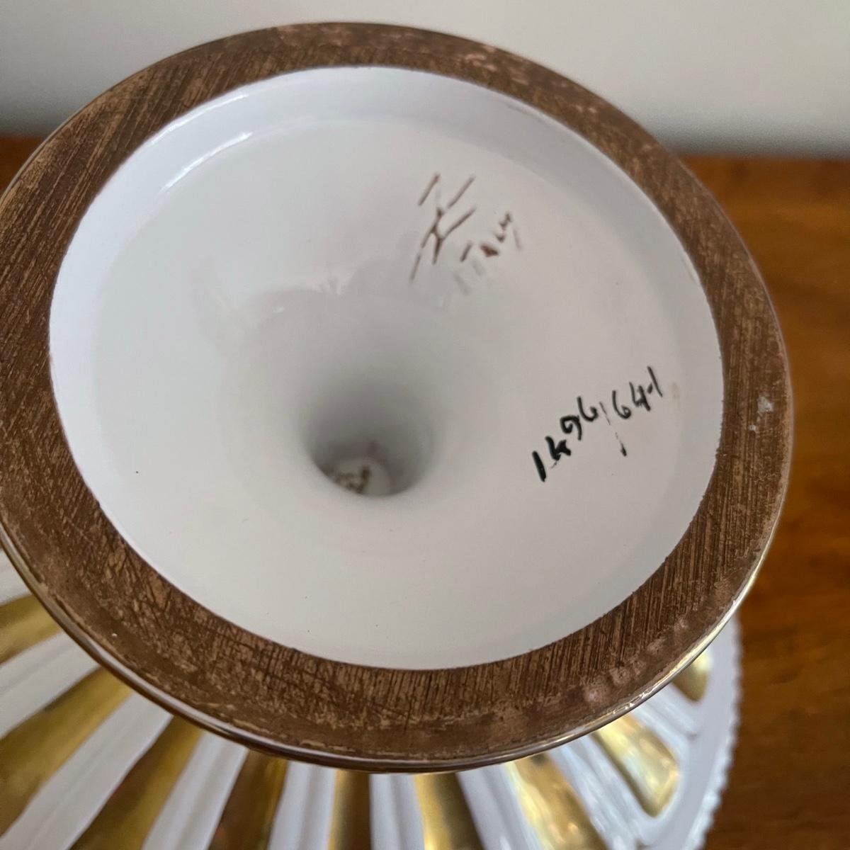 This lot includes a beautiful white Italian pedestal bowl with gold detailing and designs. and four curtain pull backs ((heads are almost 3.5” in diameter) that mount to the wall. These are plastic based with metal accent pieces on the ends. They look vintage. The bowl measures 10” in diameter and stands 6.5” tall. Shipping available