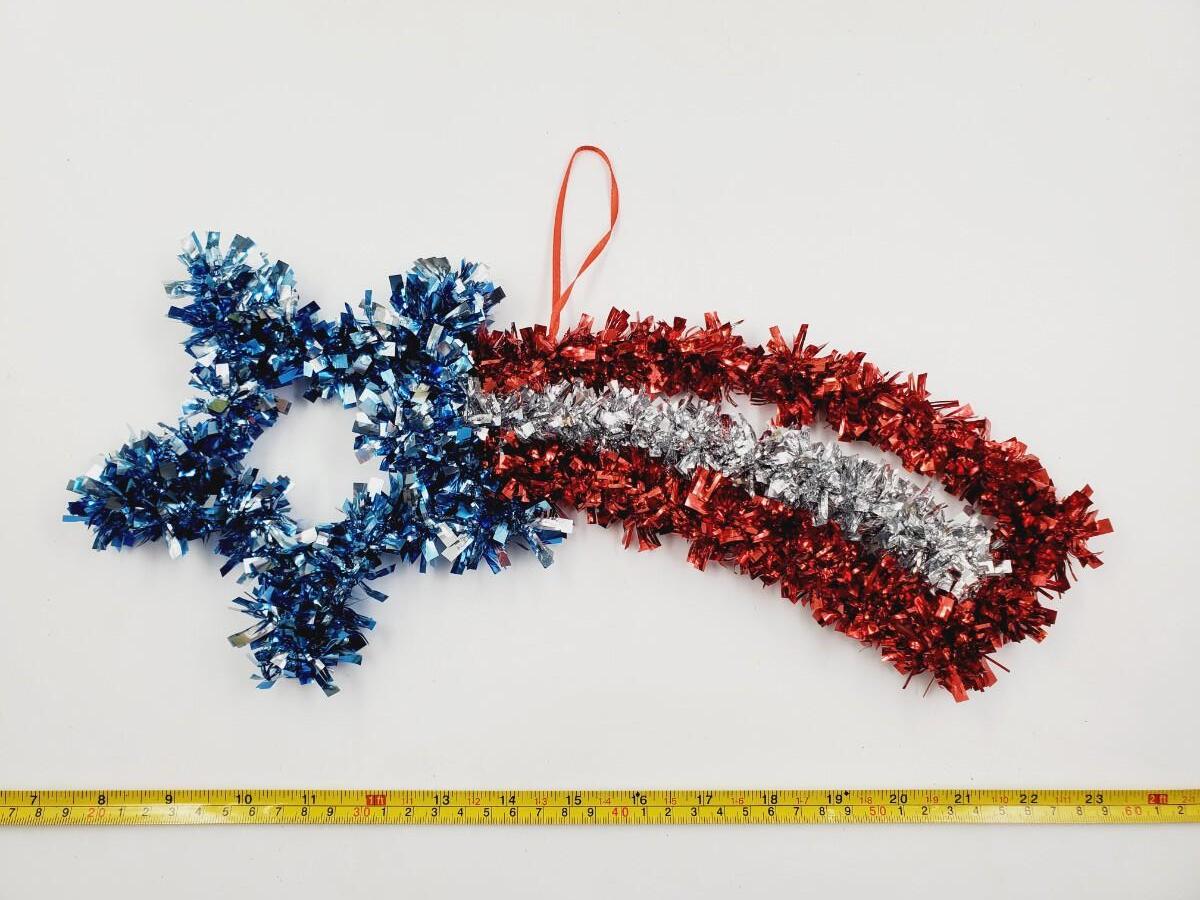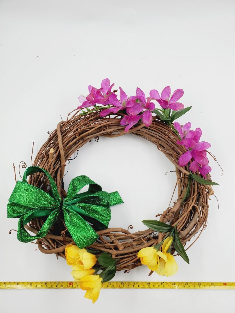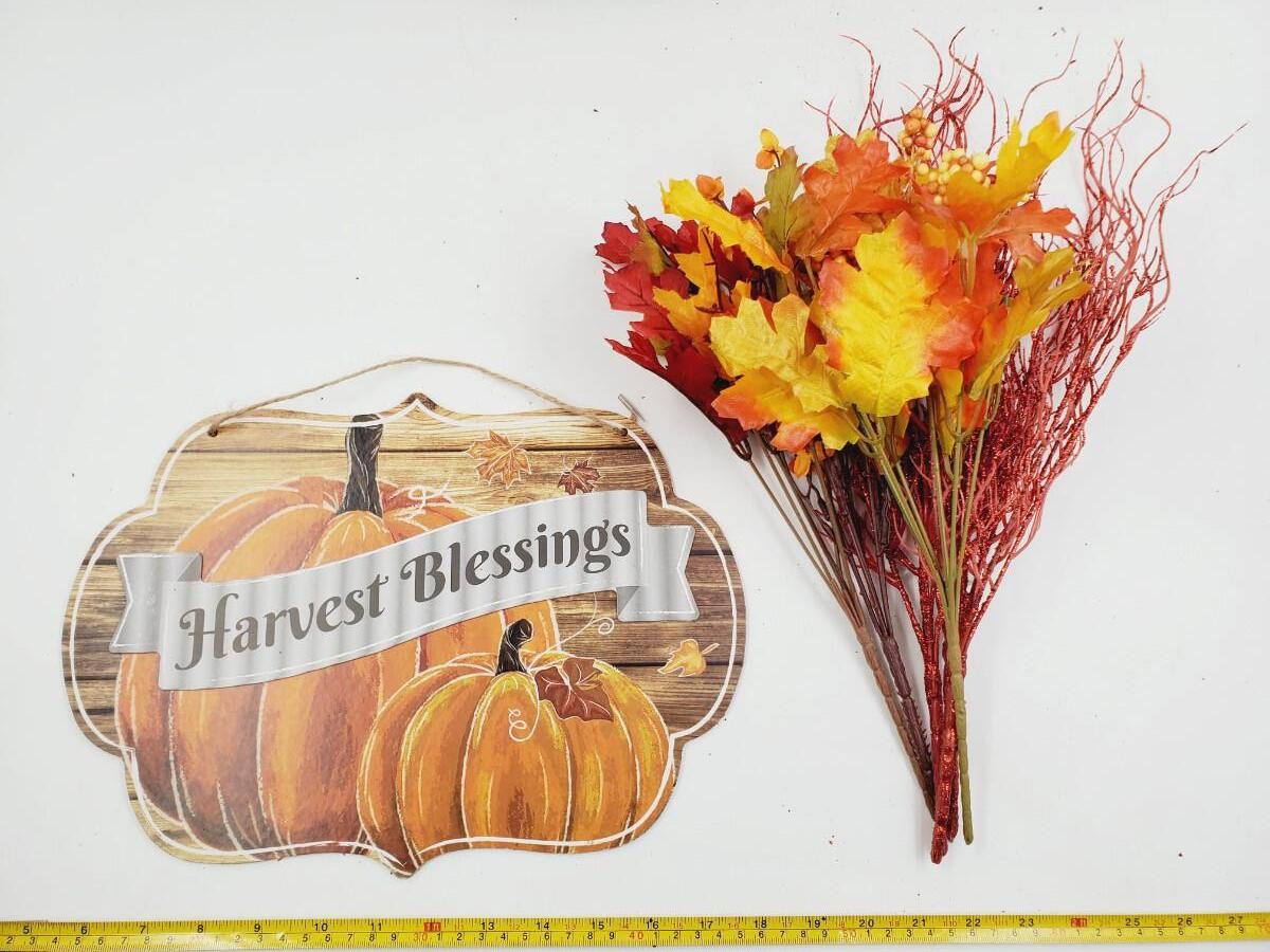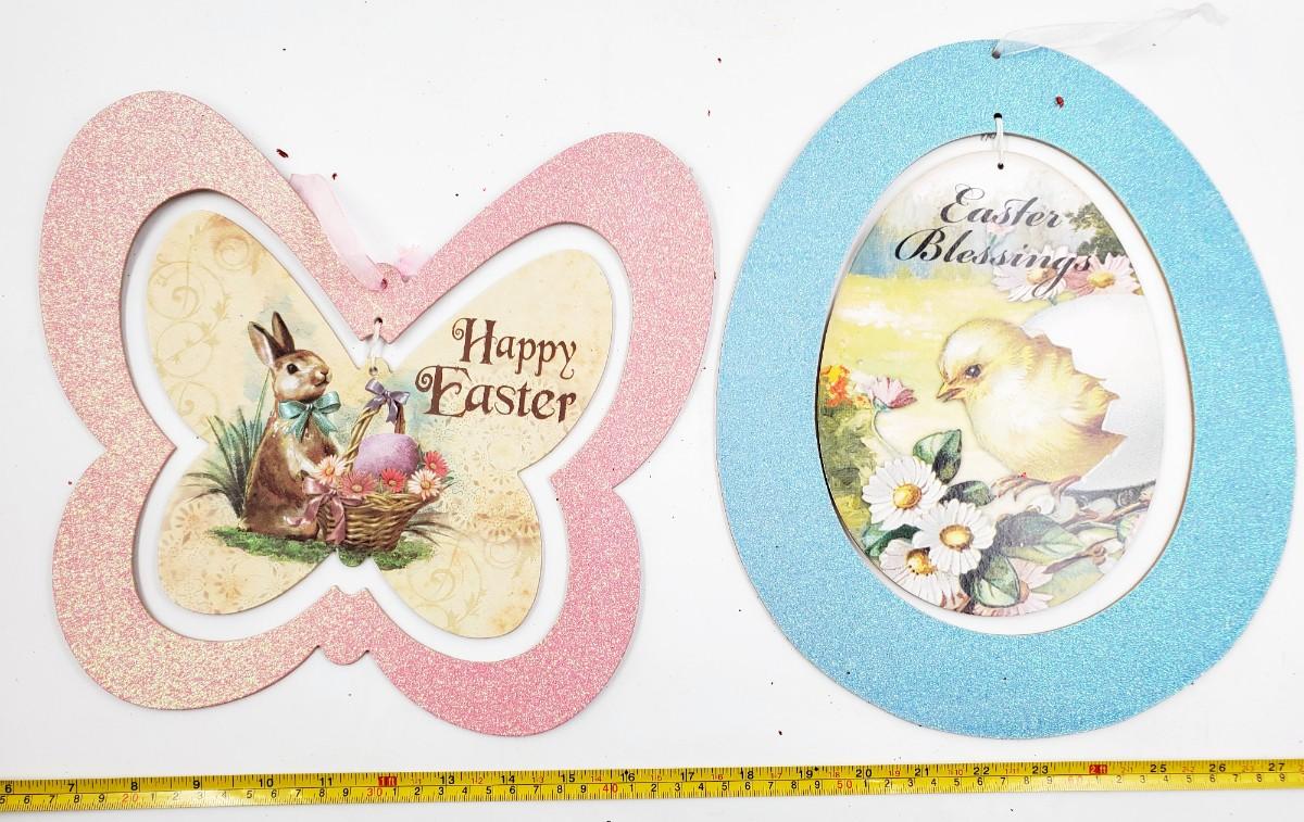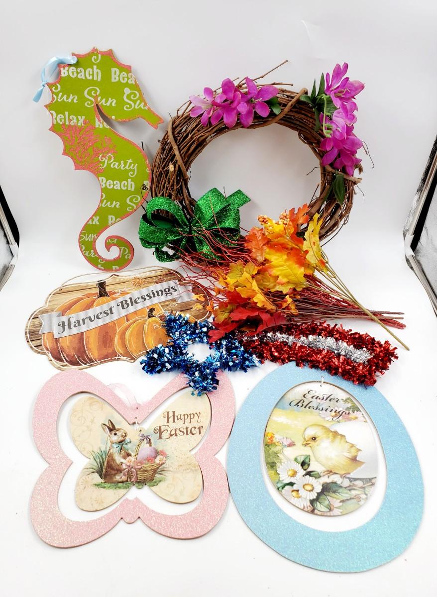 2 Easter cardboard decorative cutouts, 1 Halloween decorative cardboard cutout, 1 wire firework garland hanging ornament, 1 rustic spring wreath and 1 bunch of autumn artificial floral arrangement, all in good condition.