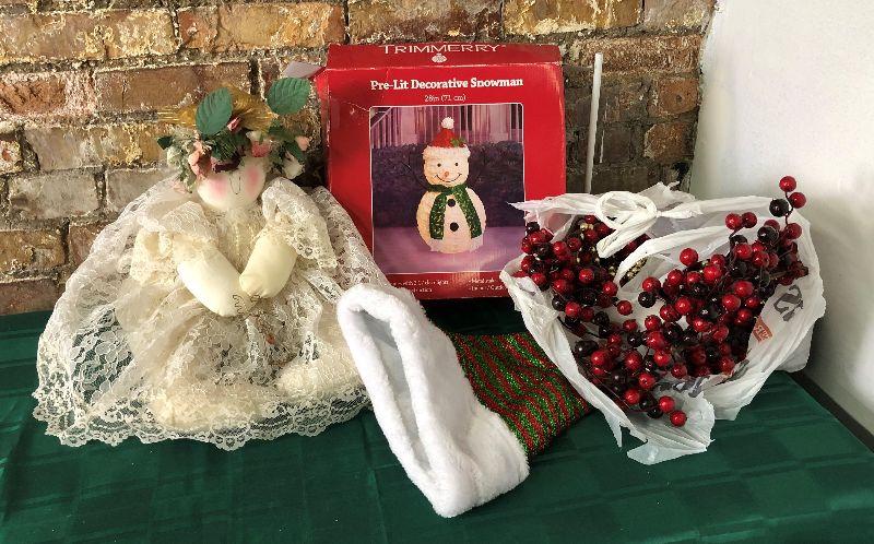 This lot of seasonal holiday decorations includes a Christmas Angel..Lighted Snowman and faux cranberries....Excellent condition...