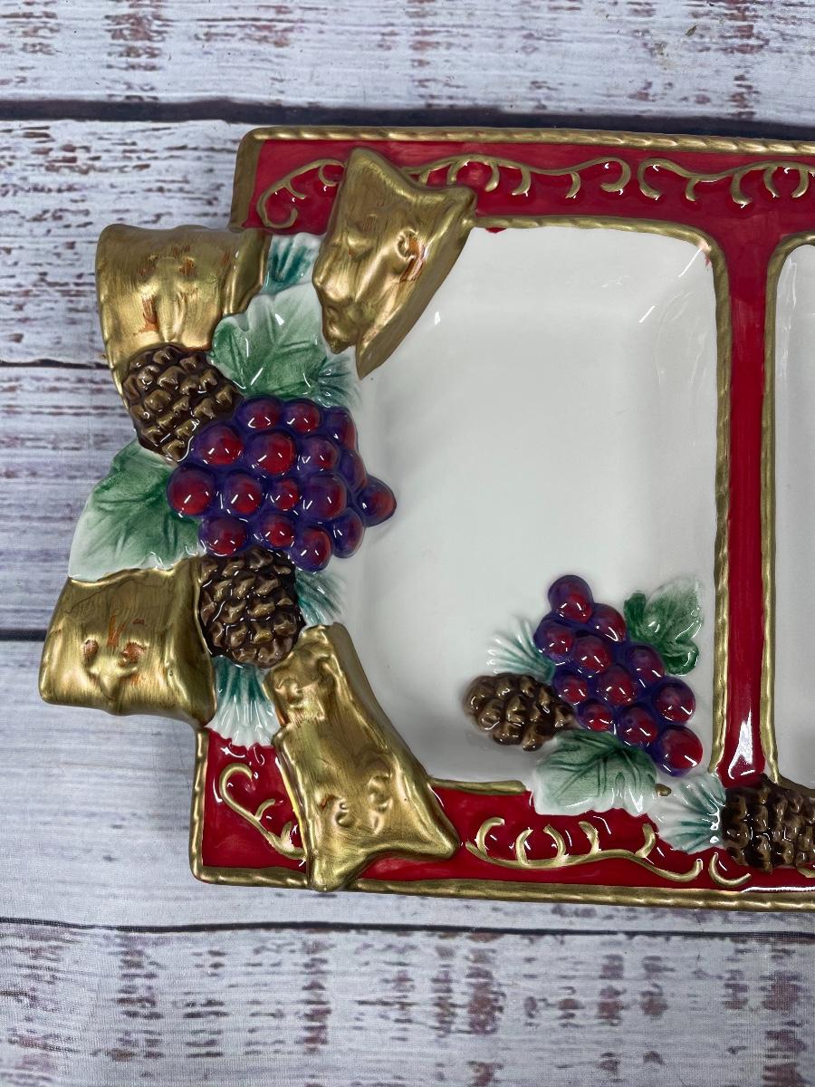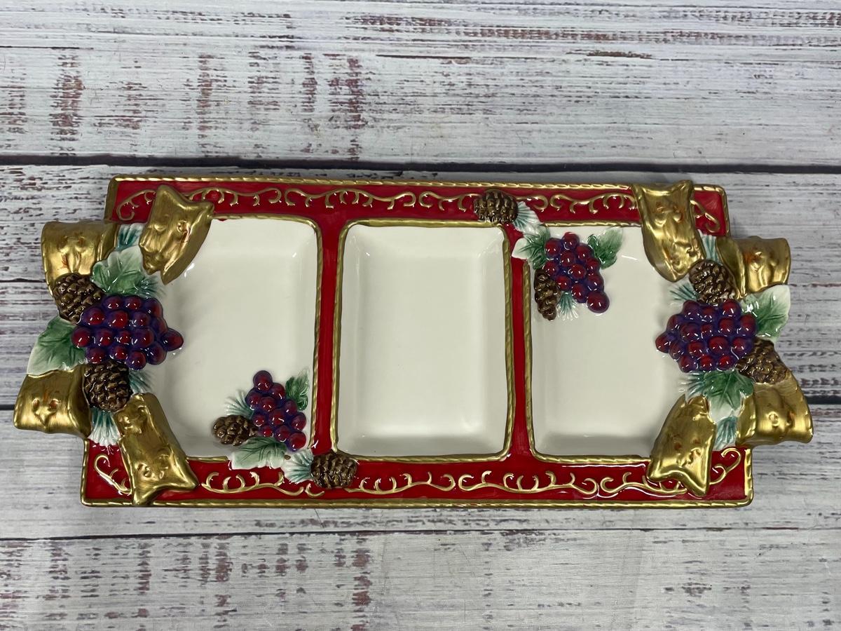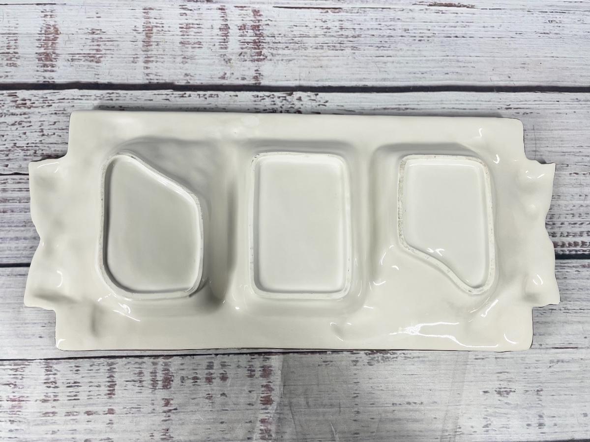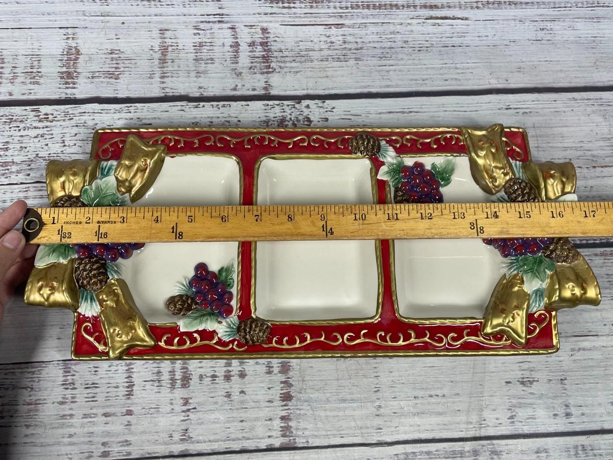 Item is in perfect condition. There is only a little bit of discoloration, but it’s not noticeable. The platter is approximately 17” wide.