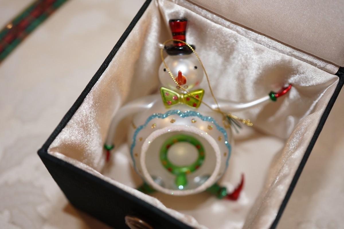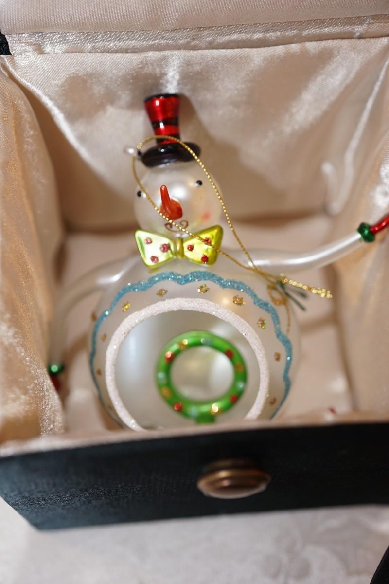 hand blown snowman ornament of fine detail and decoration