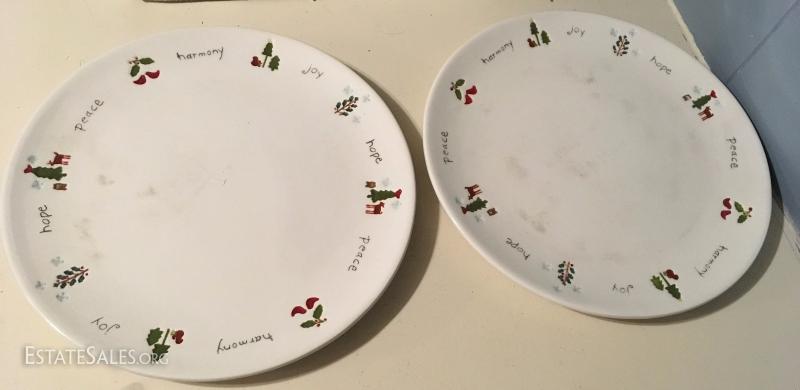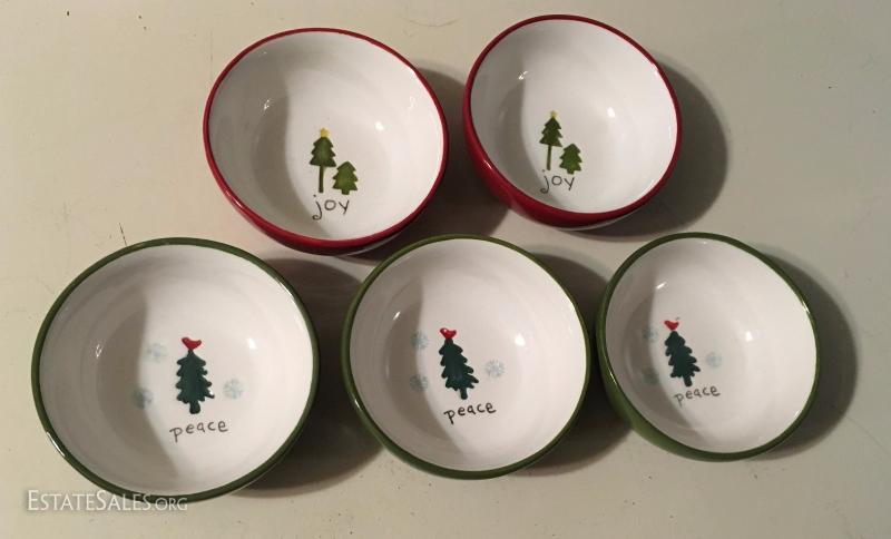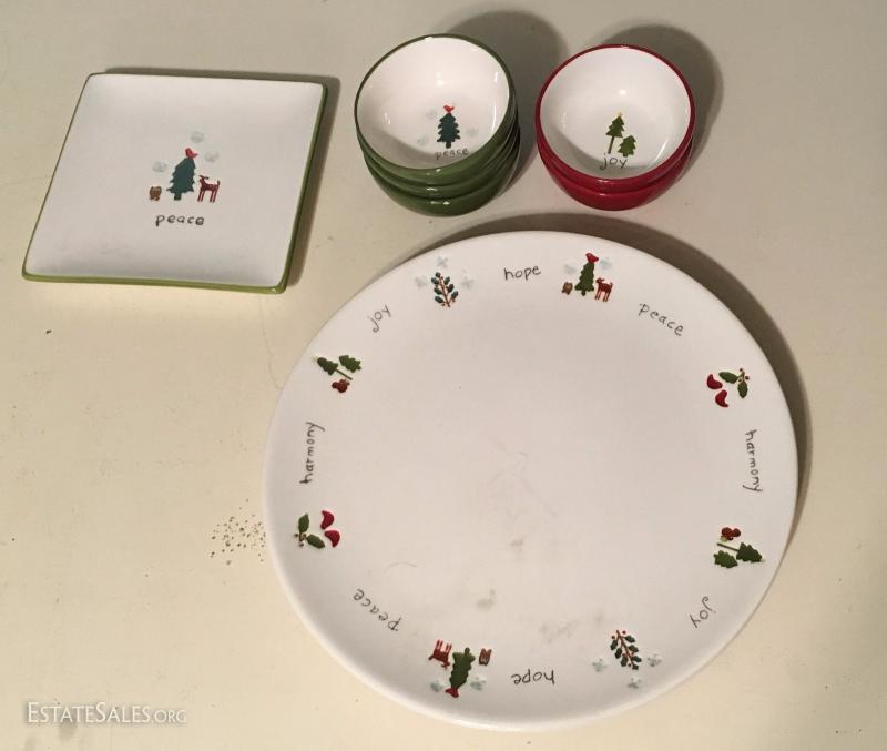 This set comes with two red "joy" ramikins, three green "peace" ramikins, two circle plates and one square "peace" plate. Great for holiday entertaining.