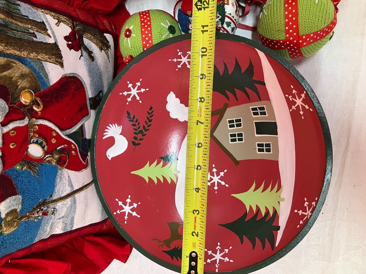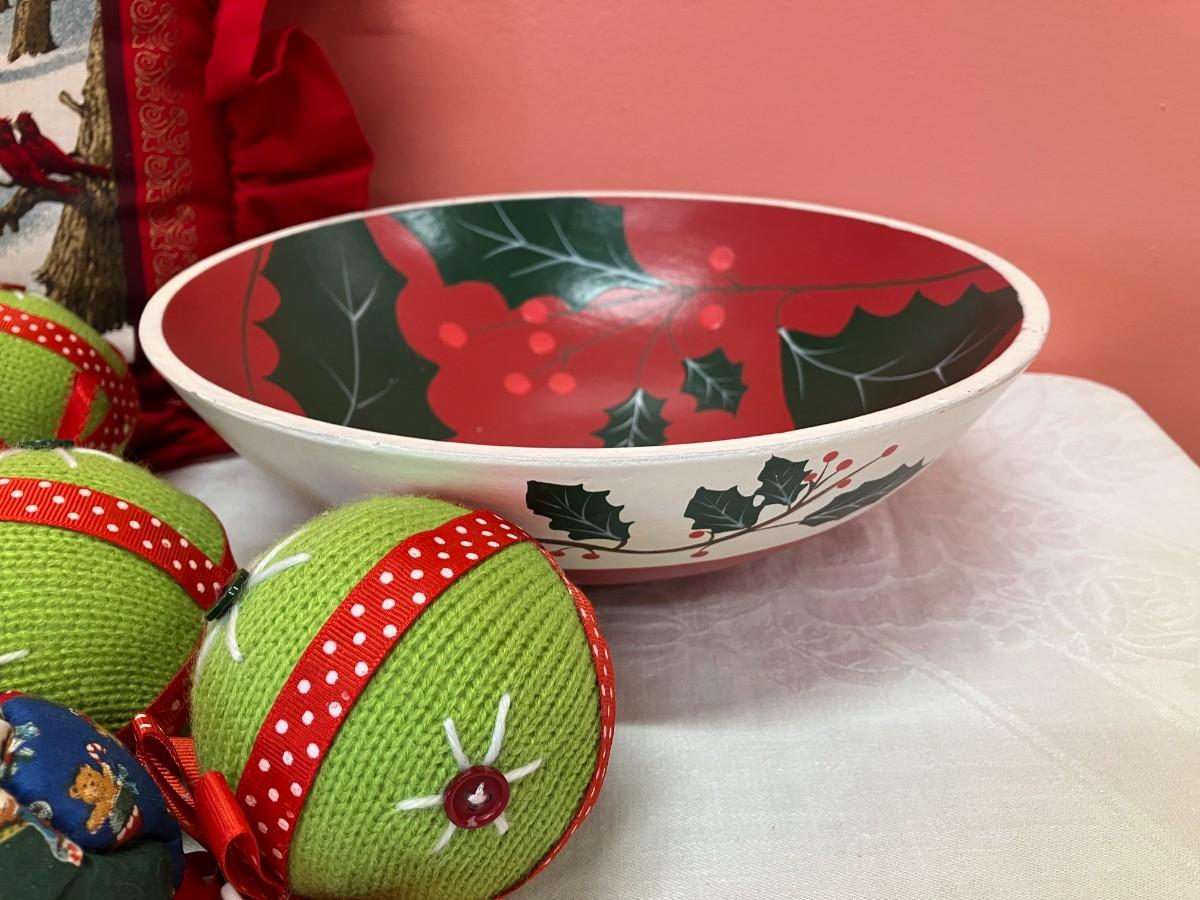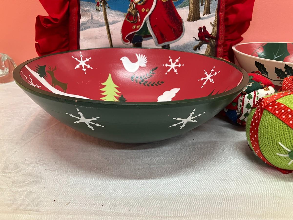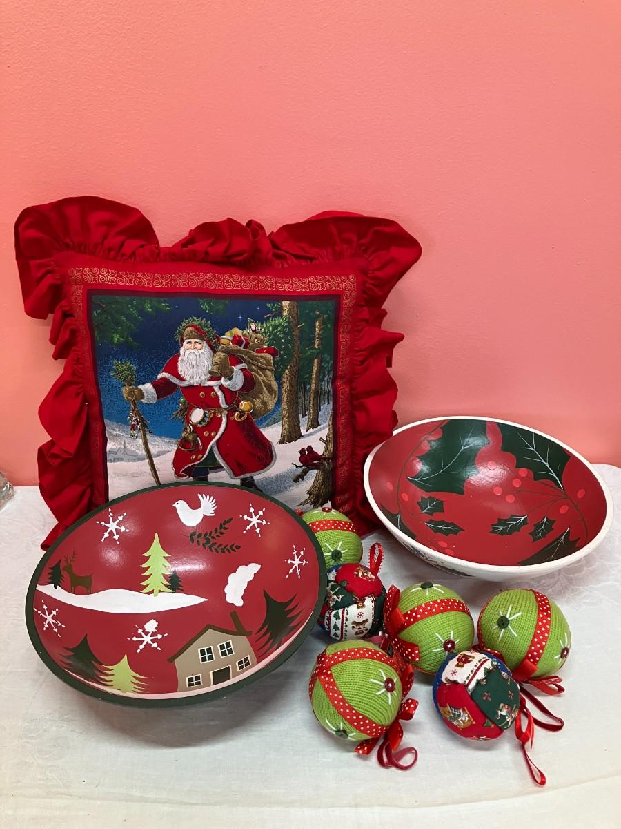Grouping of Christmas items including: a santa pillow, 2 wooden decorative bowls and a set of 6 fabric ornaments