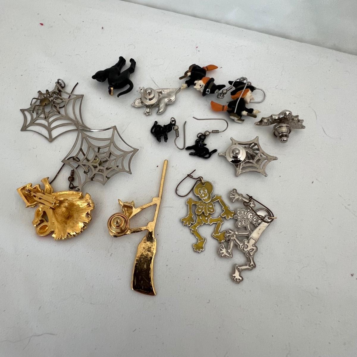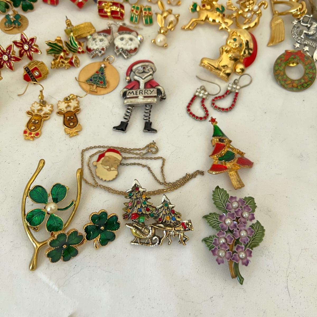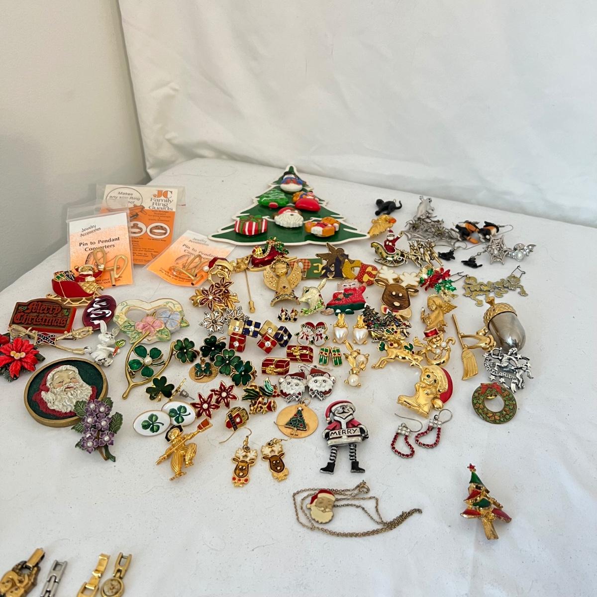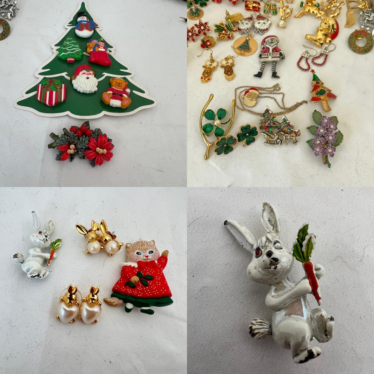 Over 75 items in this assortment of festive themed jewelry. Xmas, Halloween and more holidays featured. Earrings are for pierced ears. The white bunny (missing an eye) appears to be vintage and enameled with the word “˜Gerry’s’ on the back, no other significant markings found. All sales are final, no refunds so please bid accordingly.
