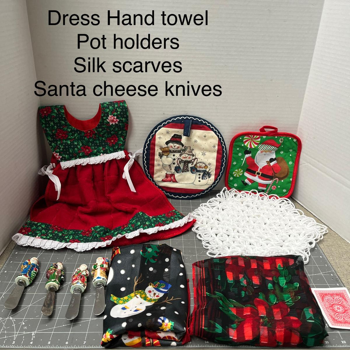 Dress towel, pot holders, scarves, four Santa cheese knives.