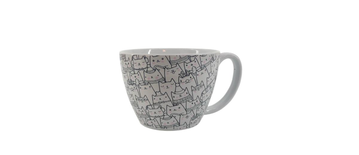 Super cute large mug with holiday kitty cats in different winter outfits. Bottom of inside of mug has hearts. Made by 10 Strawberry street. Rim measures 5” in diameter and mug is 4” in height.
