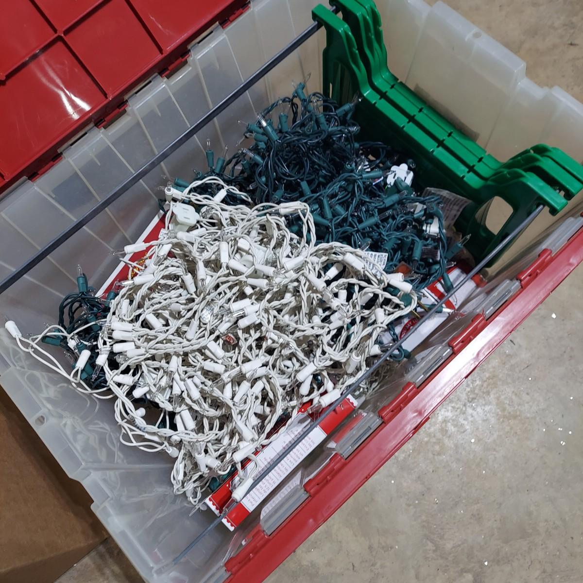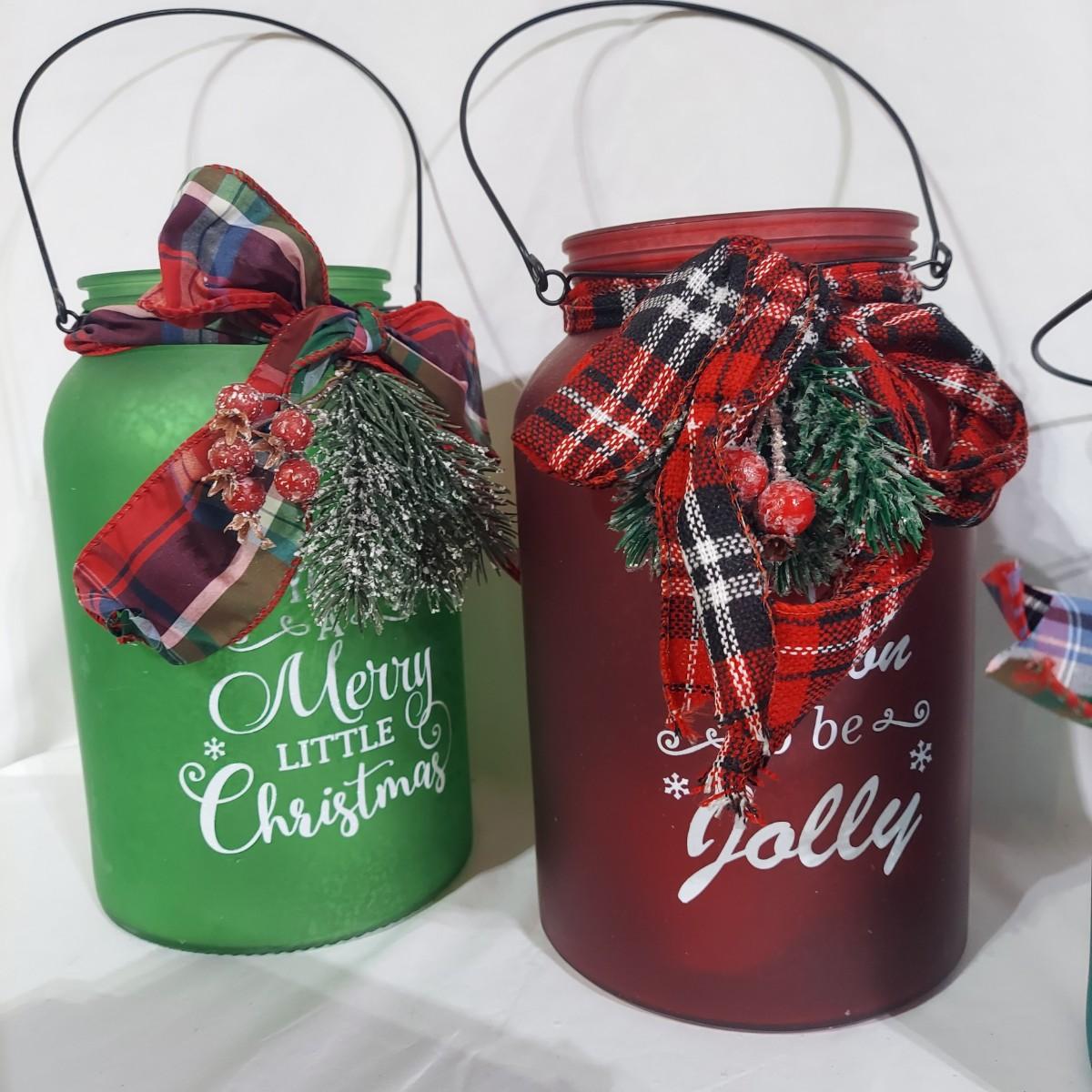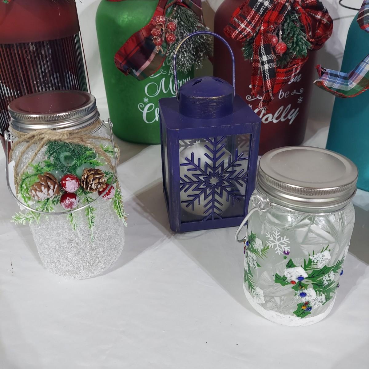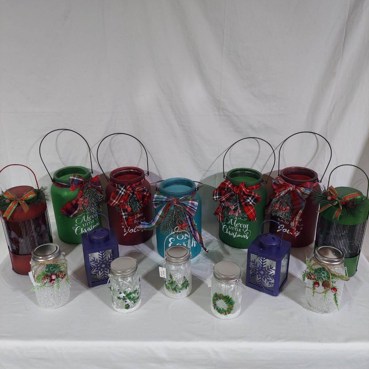Lot includes several glass jar style lanterns in varying sizes. Most have led twinkle packs inside. Also included are many strands of led twinkle lights and standard holiday strand lights. There are two boxes of lanterns, one box of led lights and one bin of string lights. String lights were plugged in and powered on. Please see photos for details. Local Pickup Only