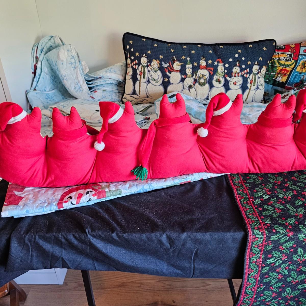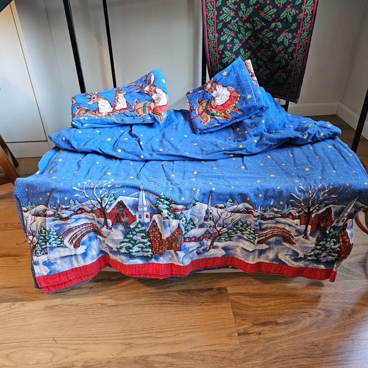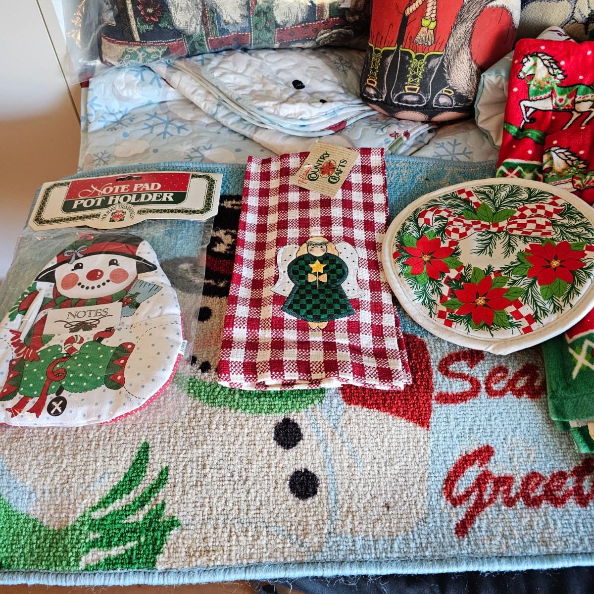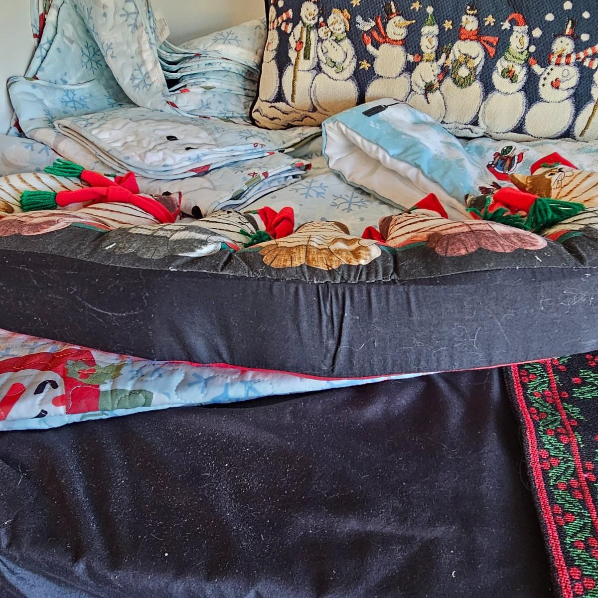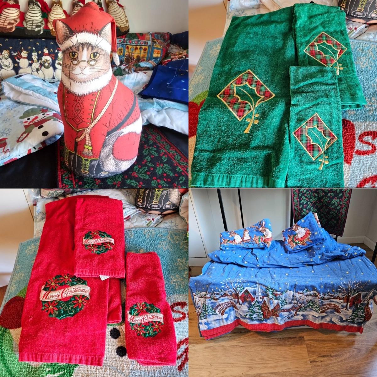 Bedspreads, towels, stockings and more. Fun snowman king size quilt, 86" x 101", with two pillow shams. Kids with reindeer, full size with topper, dust ruffle and two pillowcases. Cotton flannel set with stars on blue background has flat/fitted with two pillowcases, 54" x 92". Runner is 13" x 66". Snowman pillow is 7" x 25" x 10"H. Cat draft fighter is 35" x 10". Also includes matching towel sets, potholders, stockings and some kind of Santa hangup. See photos for details. Tub included. Local pickup only.