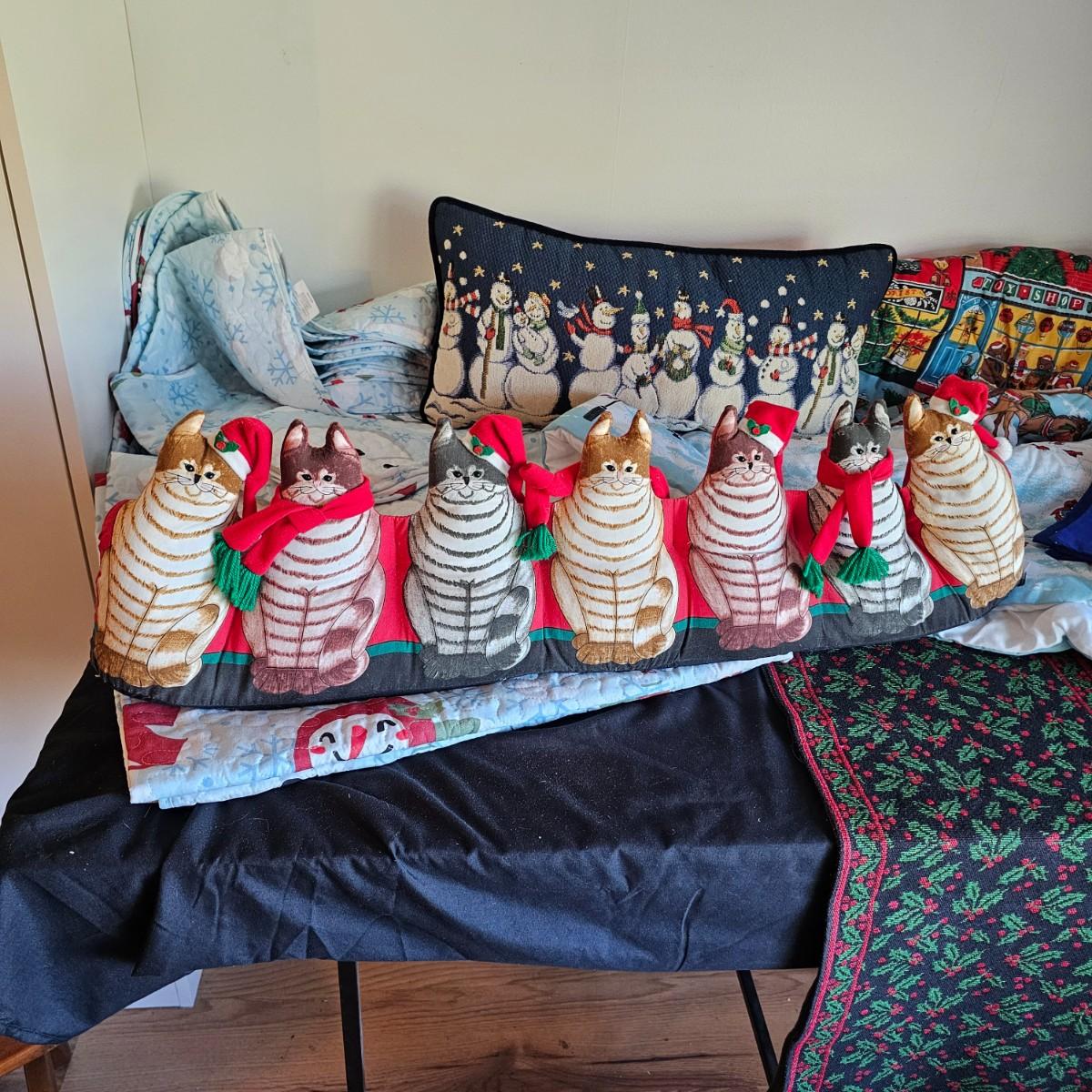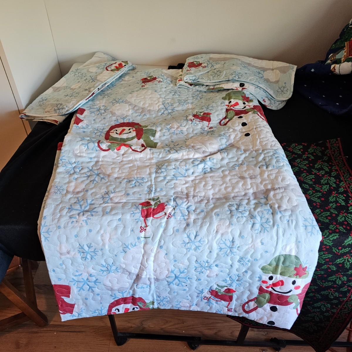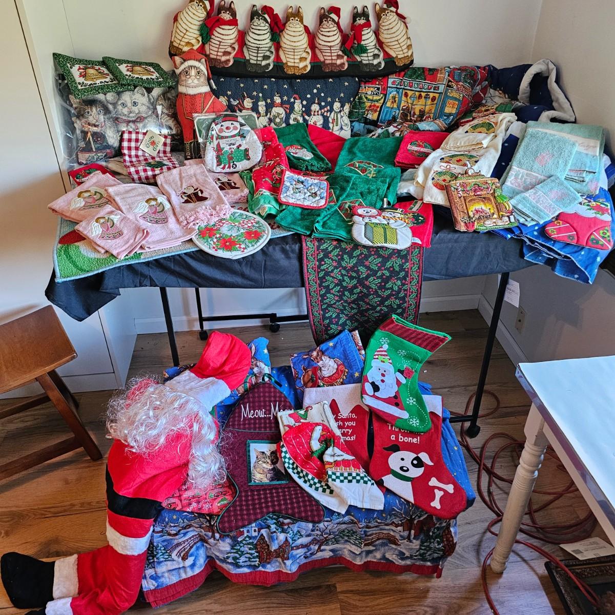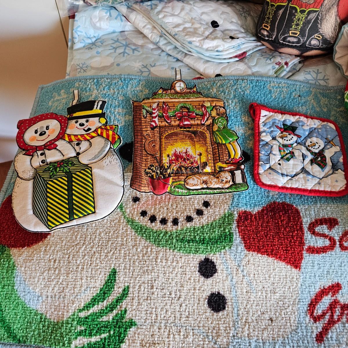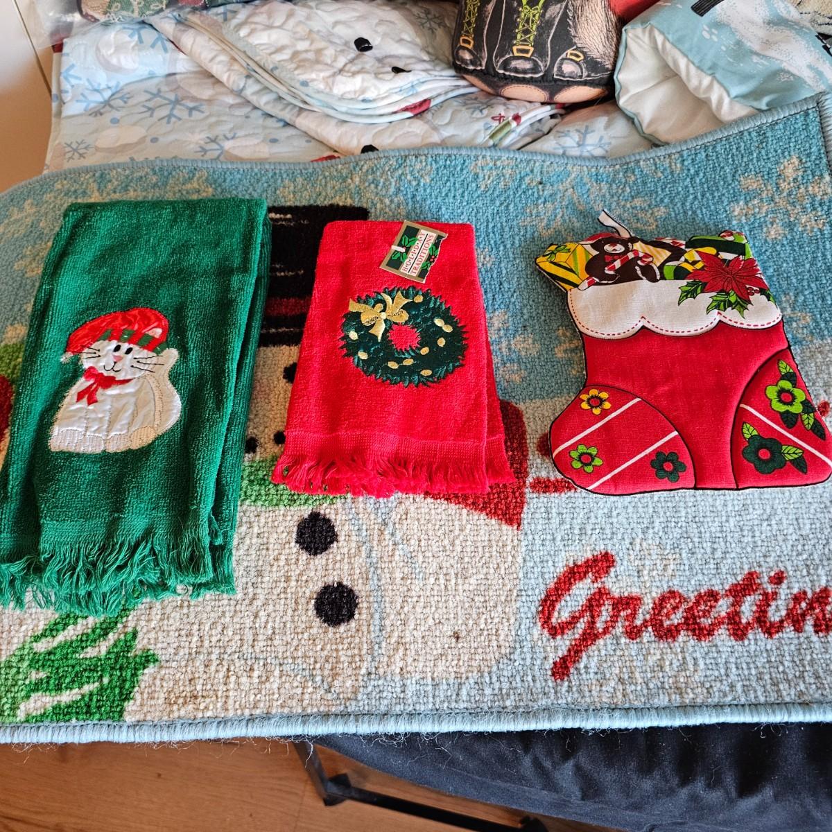 Bedspreads, towels, stockings and more. Fun snowman king size quilt, 86" x 101", with two pillow shams. Kids with reindeer, full size with topper, dust ruffle and two pillowcases. Cotton flannel set with stars on blue background has flat/fitted with two pillowcases, 54" x 92". Runner is 13" x 66". Snowman pillow is 7" x 25" x 10"H. Cat draft fighter is 35" x 10". Also includes matching towel sets, potholders, stockings and some kind of Santa hangup. See photos for details. Tub included. Local pickup only.