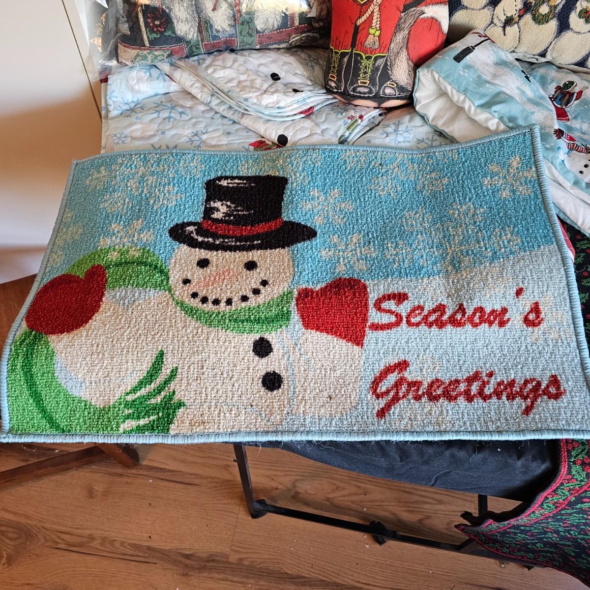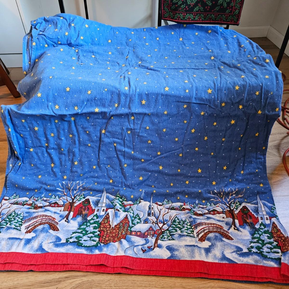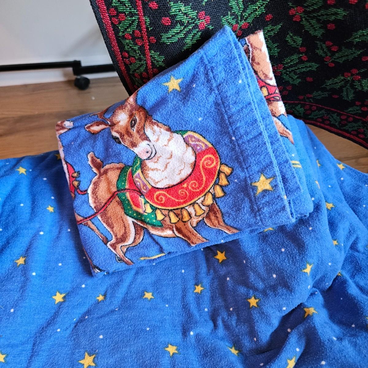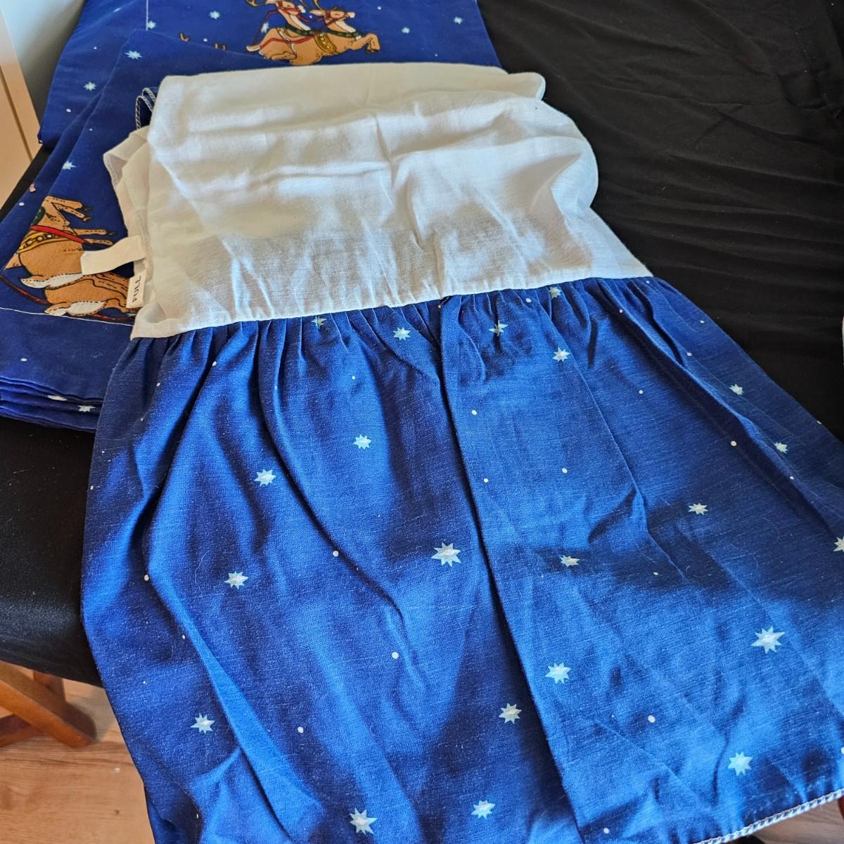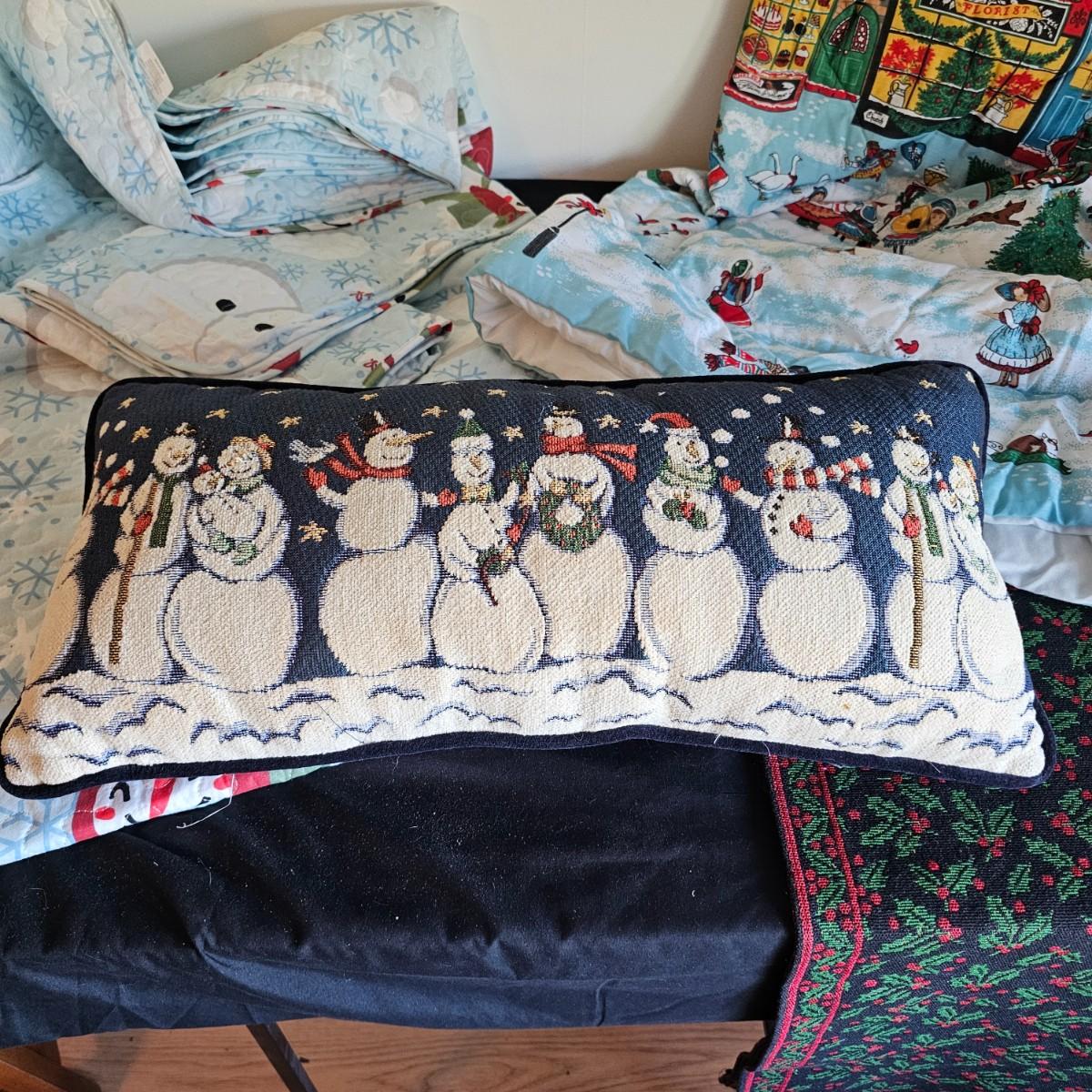 Bedspreads, towels, stockings and more. Fun snowman king size quilt, 86" x 101", with two pillow shams. Kids with reindeer, full size with topper, dust ruffle and two pillowcases. Cotton flannel set with stars on blue background has flat/fitted with two pillowcases, 54" x 92". Runner is 13" x 66". Snowman pillow is 7" x 25" x 10"H. Cat draft fighter is 35" x 10". Also includes matching towel sets, potholders, stockings and some kind of Santa hangup. See photos for details. Tub included. Local pickup only.