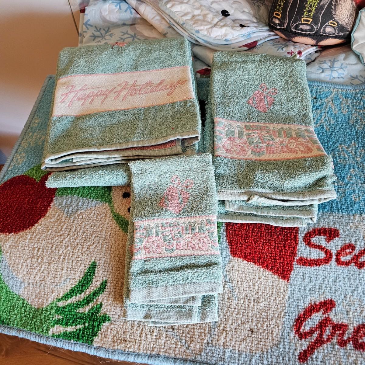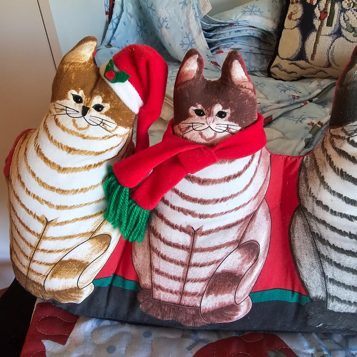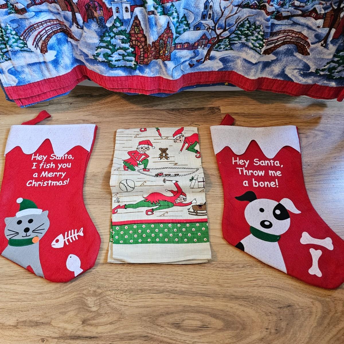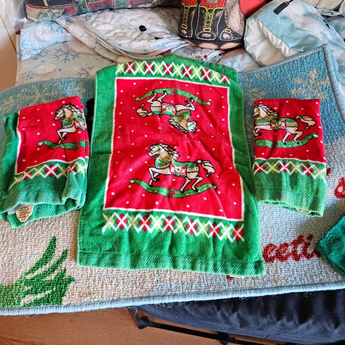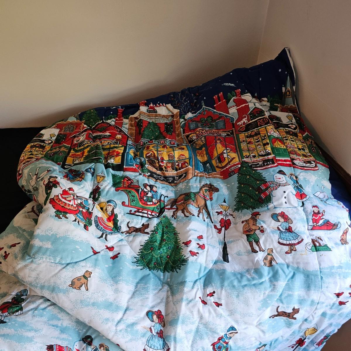 Bedspreads, towels, stockings and more. Fun snowman king size quilt, 86" x 101", with two pillow shams. Kids with reindeer, full size with topper, dust ruffle and two pillowcases. Cotton flannel set with stars on blue background has flat/fitted with two pillowcases, 54" x 92". Runner is 13" x 66". Snowman pillow is 7" x 25" x 10"H. Cat draft fighter is 35" x 10". Also includes matching towel sets, potholders, stockings and some kind of Santa hangup. See photos for details. Tub included. Local pickup only.