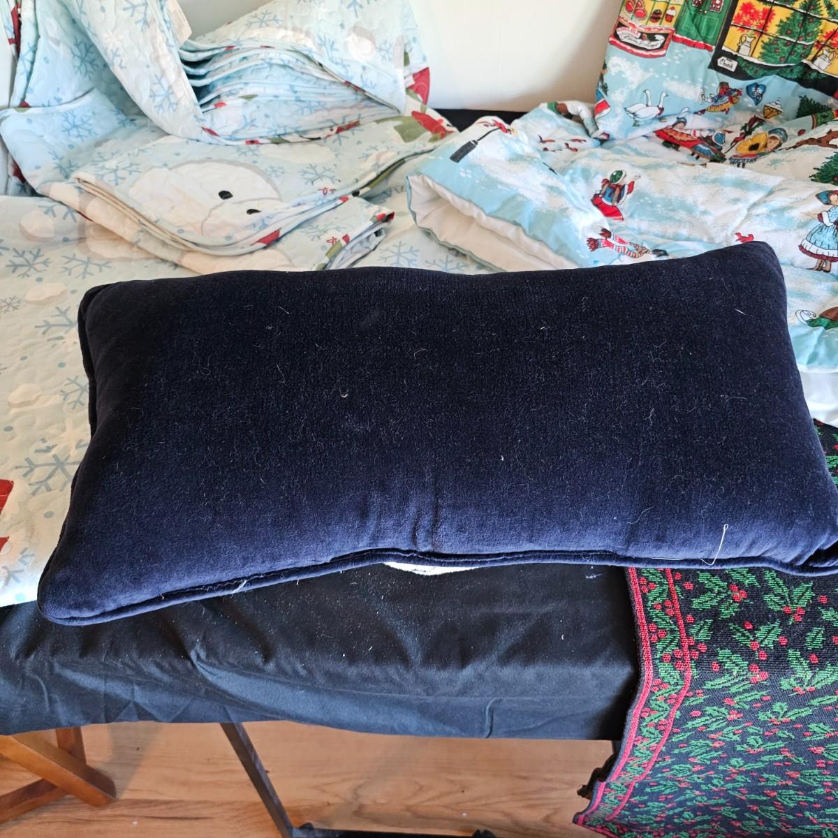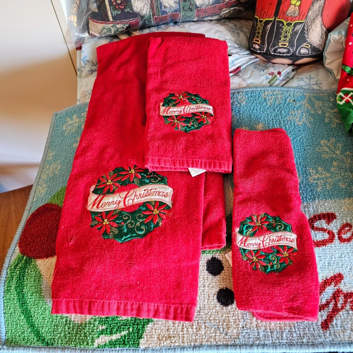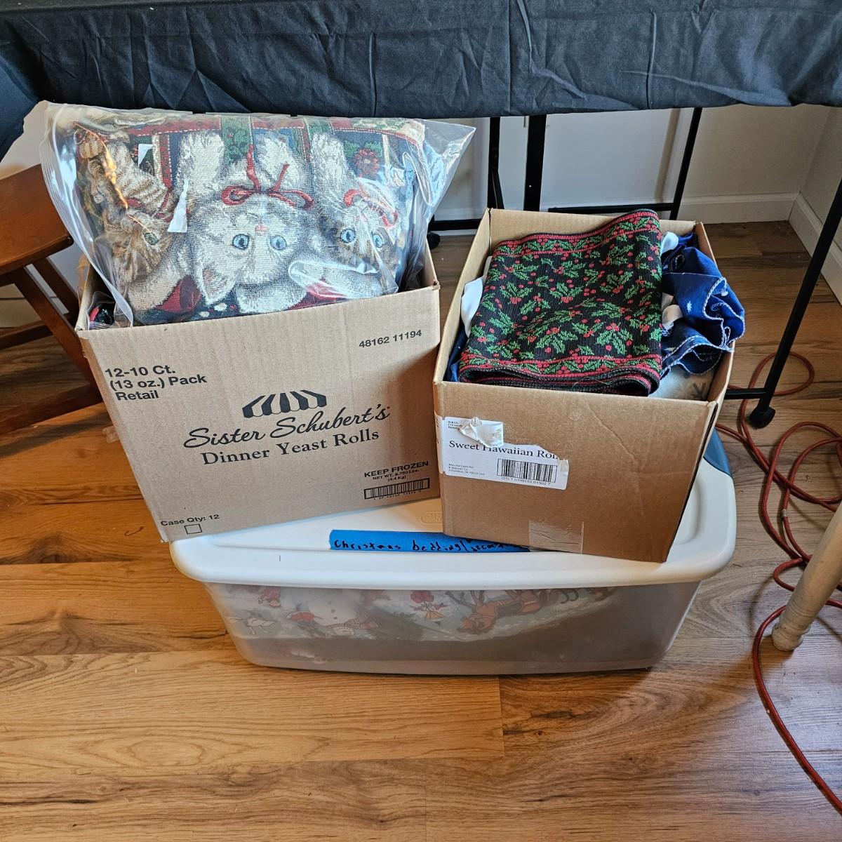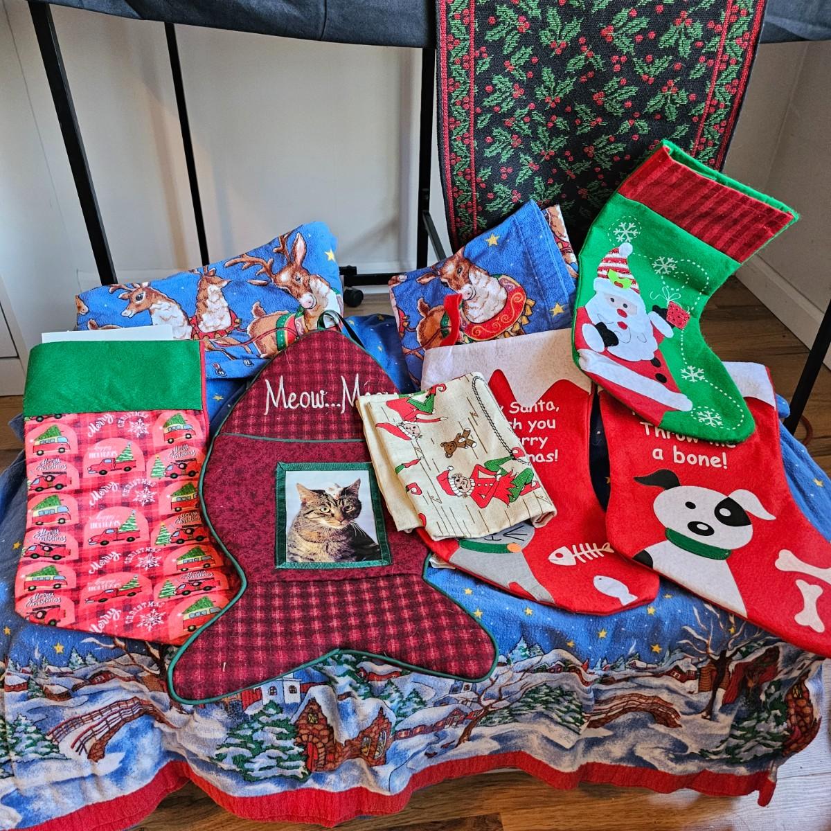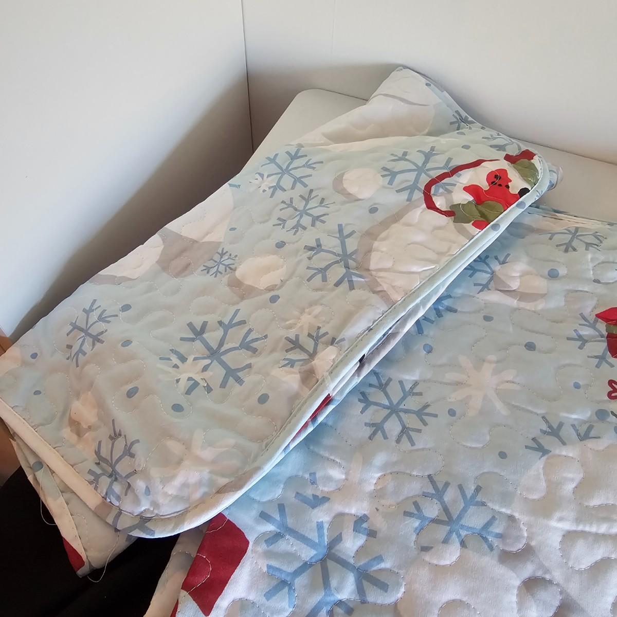 Bedspreads, towels, stockings and more. Fun snowman king size quilt, 86" x 101", with two pillow shams. Kids with reindeer, full size with topper, dust ruffle and two pillowcases. Cotton flannel set with stars on blue background has flat/fitted with two pillowcases, 54" x 92". Runner is 13" x 66". Snowman pillow is 7" x 25" x 10"H. Cat draft fighter is 35" x 10". Also includes matching towel sets, potholders, stockings and some kind of Santa hangup. See photos for details. Tub included. Local pickup only.