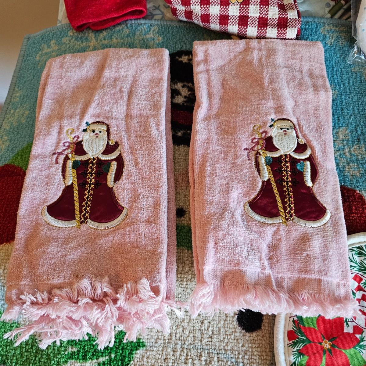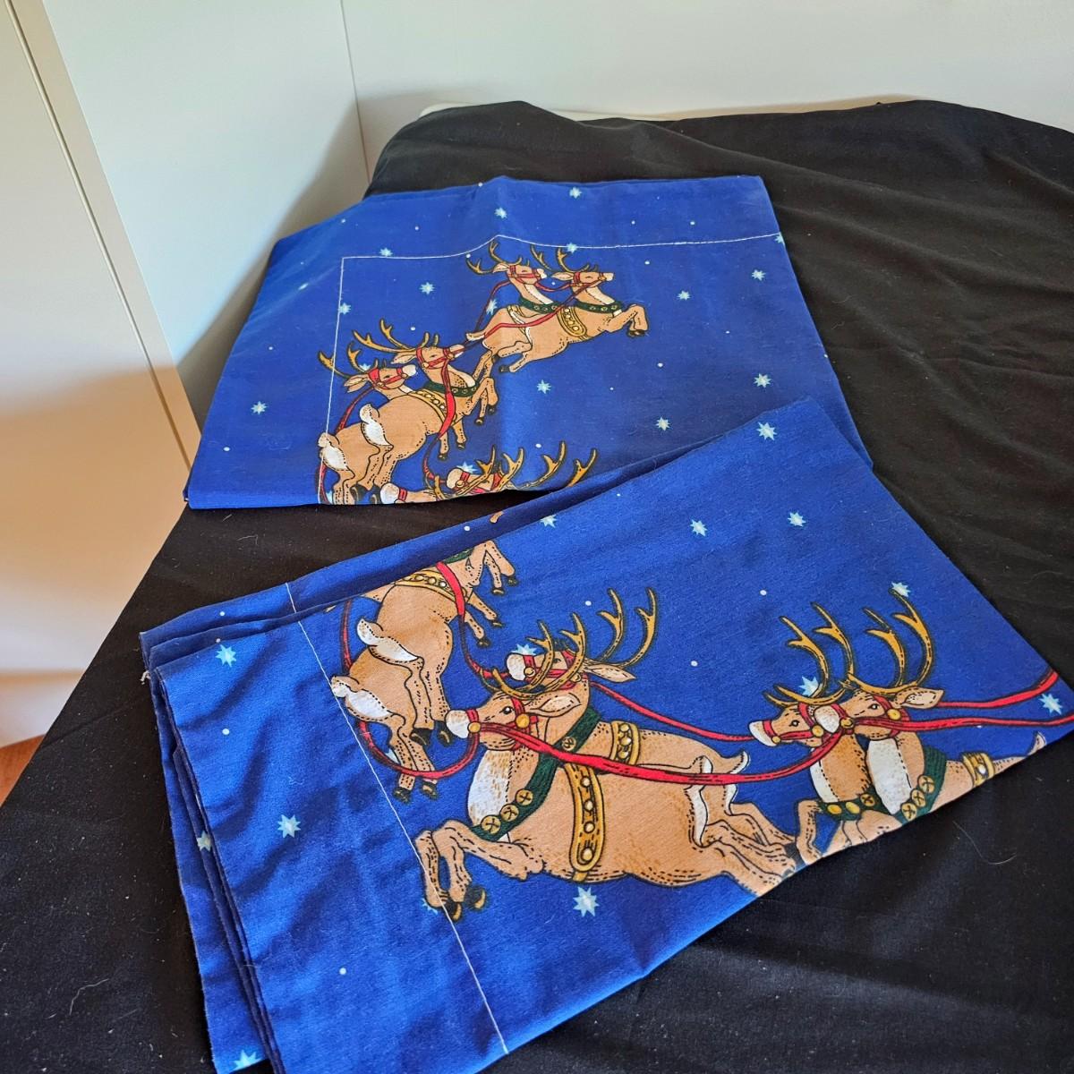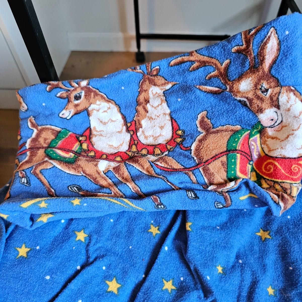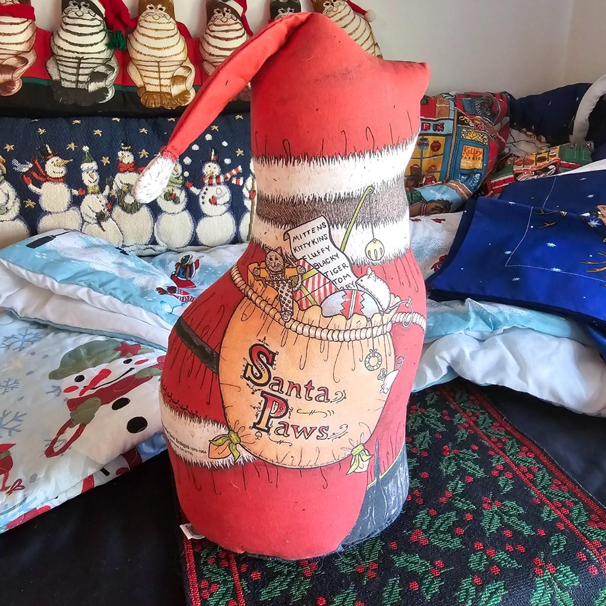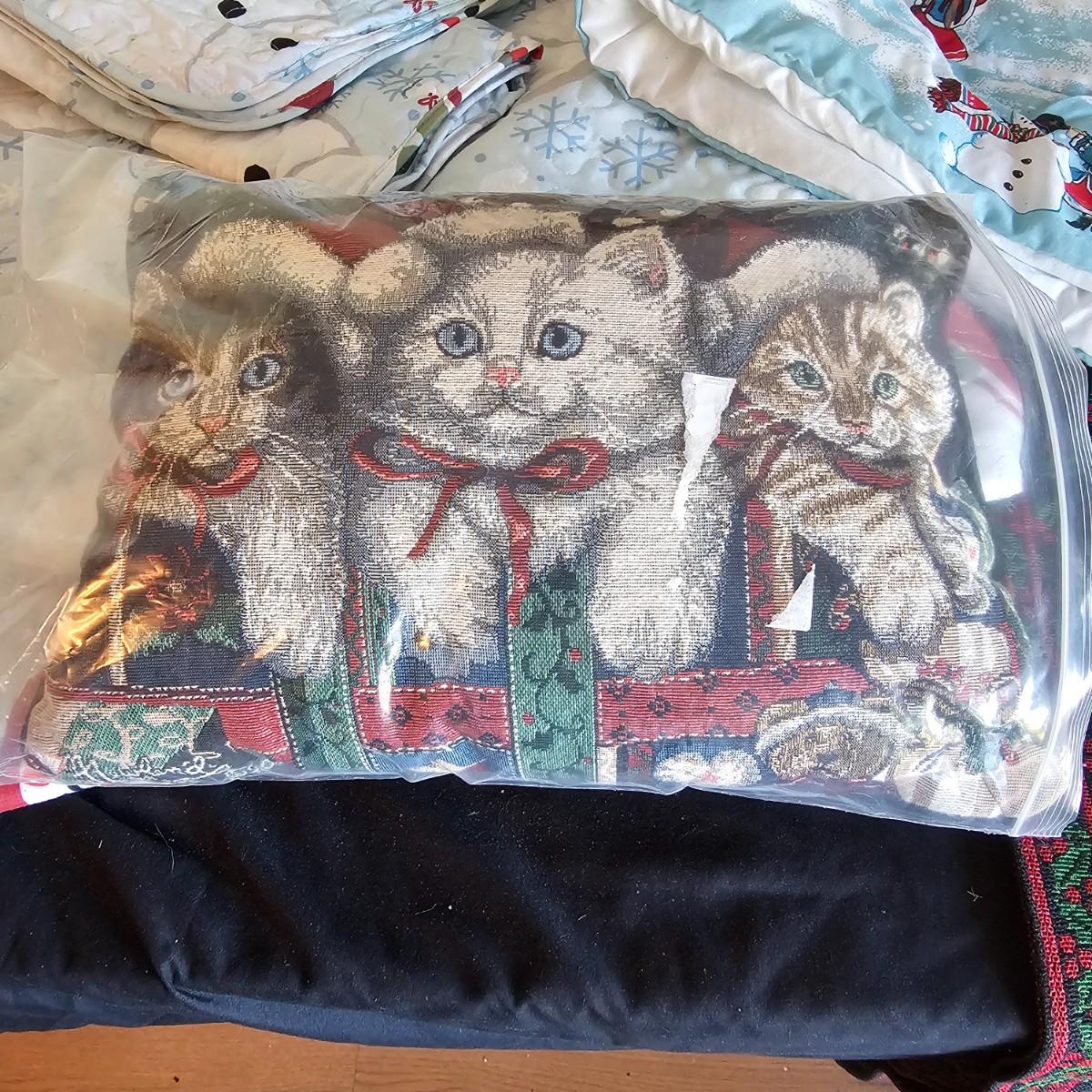 Bedspreads, towels, stockings and more. Fun snowman king size quilt, 86" x 101", with two pillow shams. Kids with reindeer, full size with topper, dust ruffle and two pillowcases. Cotton flannel set with stars on blue background has flat/fitted with two pillowcases, 54" x 92". Runner is 13" x 66". Snowman pillow is 7" x 25" x 10"H. Cat draft fighter is 35" x 10". Also includes matching towel sets, potholders, stockings and some kind of Santa hangup. See photos for details. Tub included. Local pickup only.