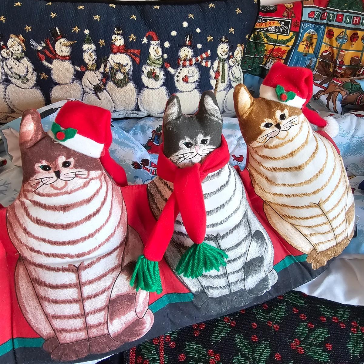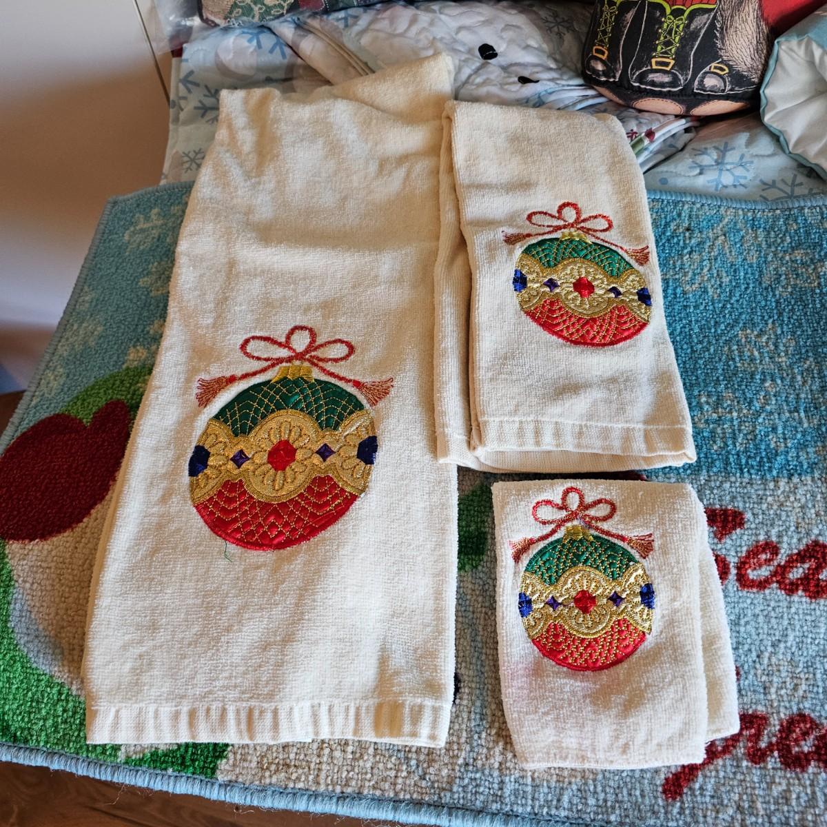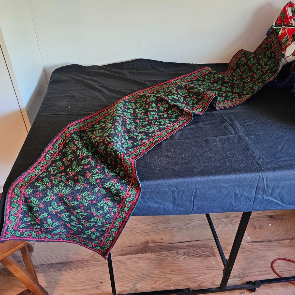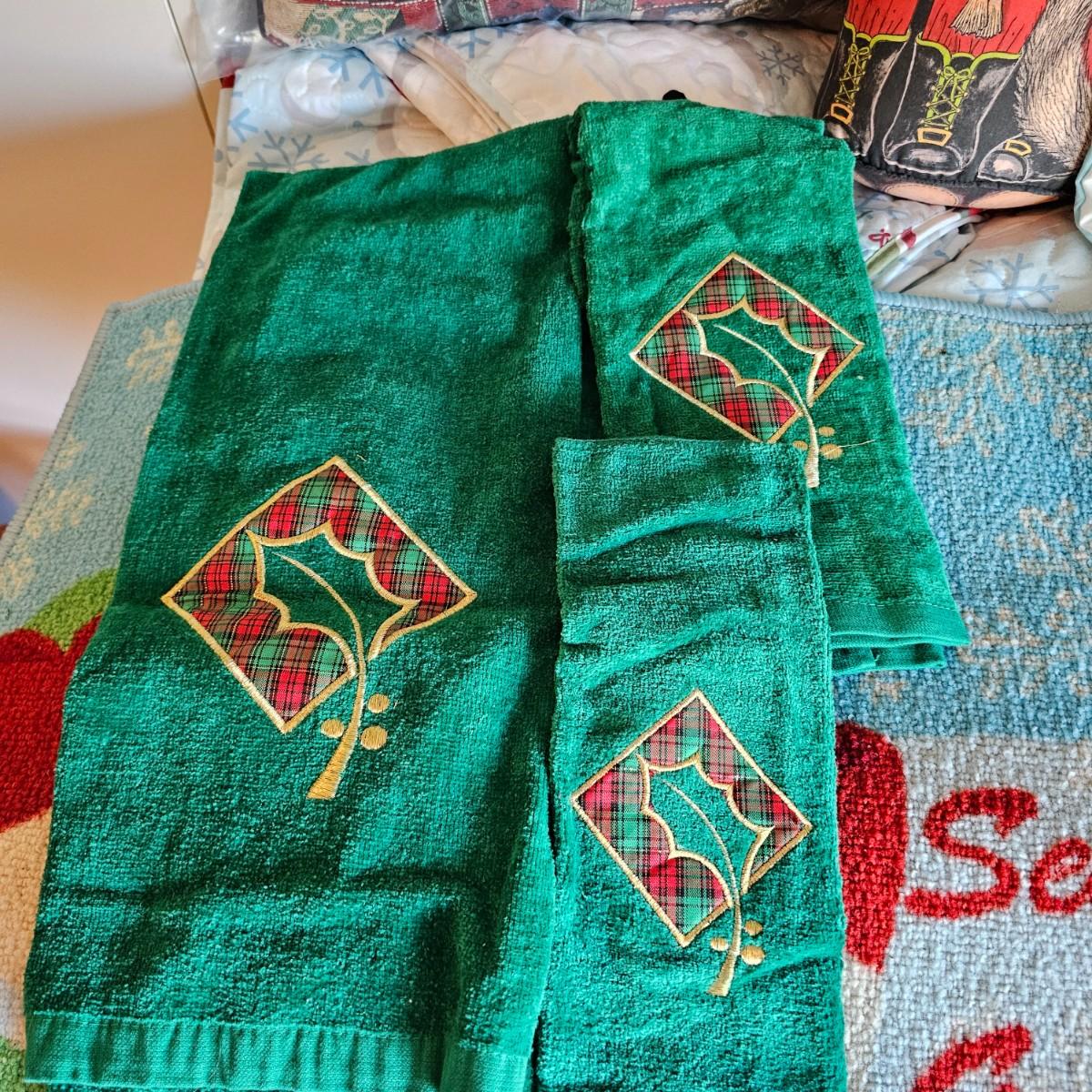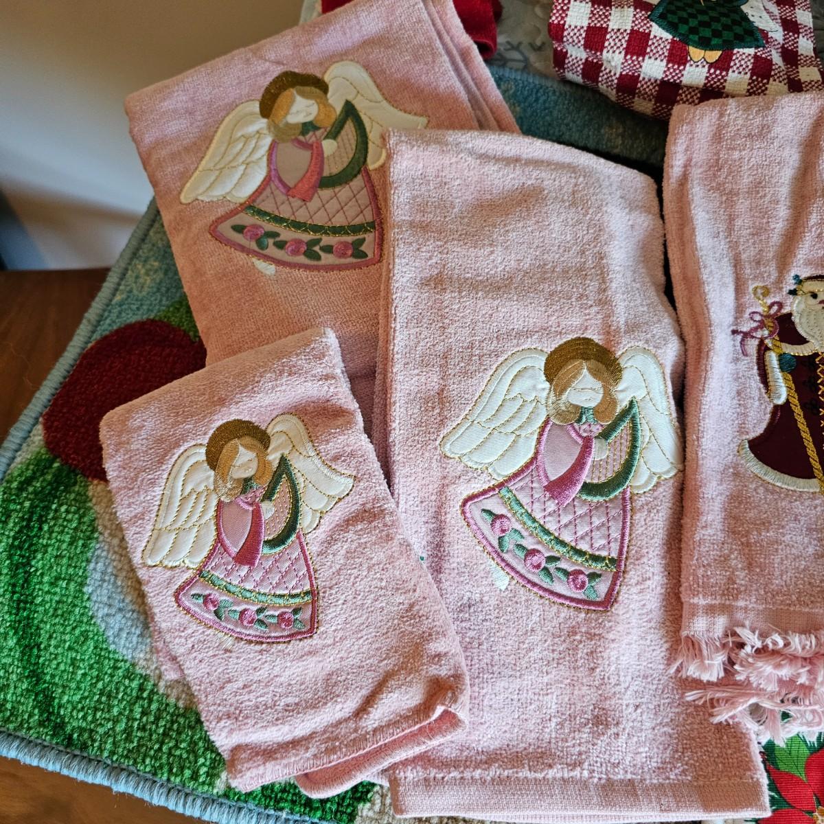 Bedspreads, towels, stockings and more. Fun snowman king size quilt, 86" x 101", with two pillow shams. Kids with reindeer, full size with topper, dust ruffle and two pillowcases. Cotton flannel set with stars on blue background has flat/fitted with two pillowcases, 54" x 92". Runner is 13" x 66". Snowman pillow is 7" x 25" x 10"H. Cat draft fighter is 35" x 10". Also includes matching towel sets, potholders, stockings and some kind of Santa hangup. See photos for details. Tub included. Local pickup only.