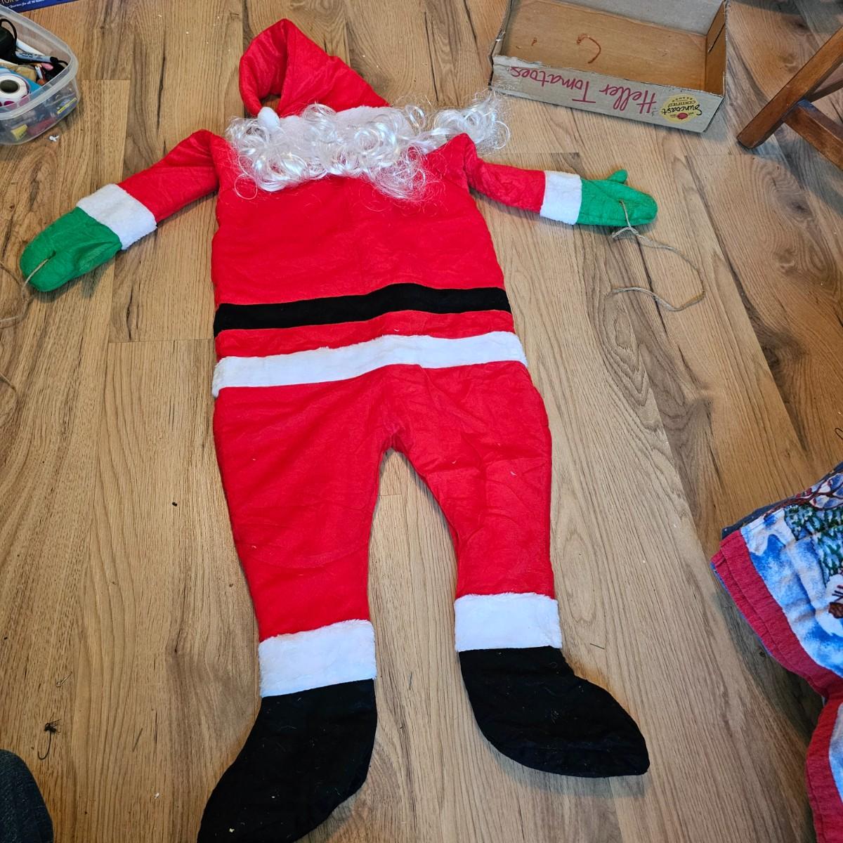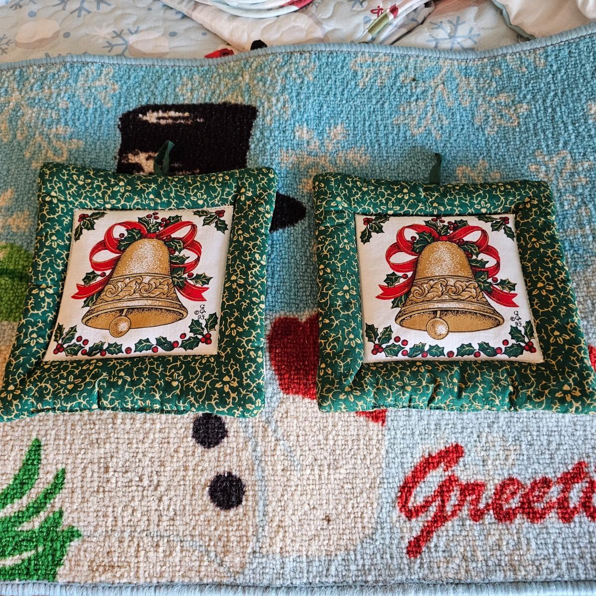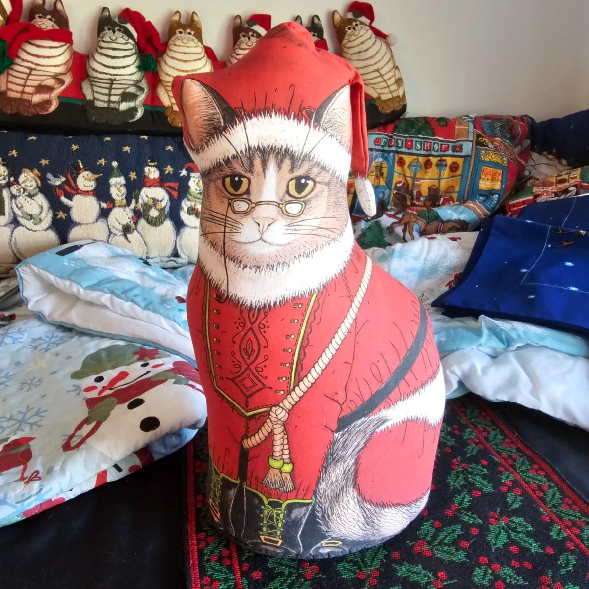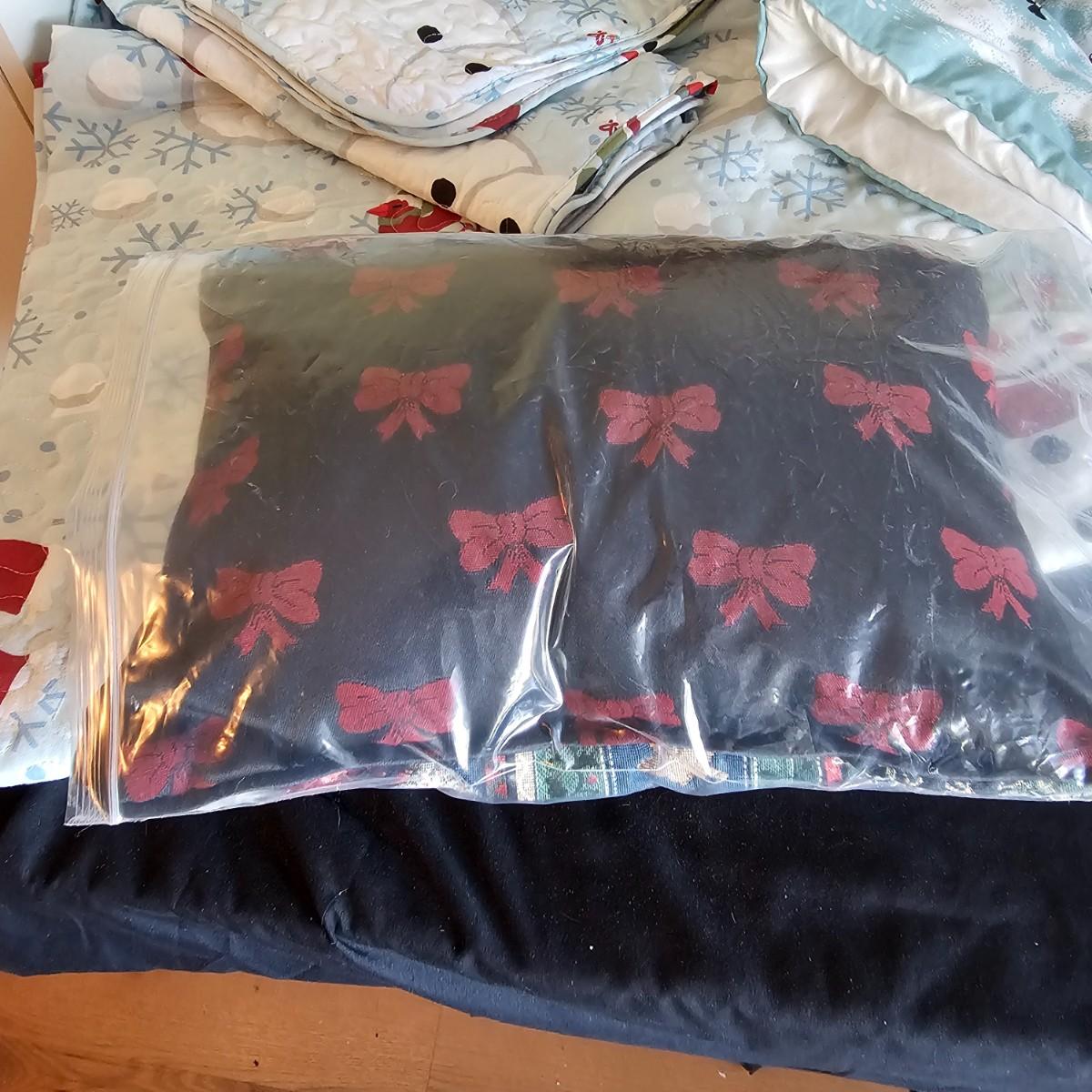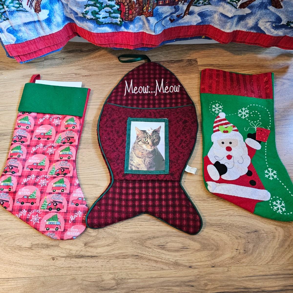 Bedspreads, towels, stockings and more. Fun snowman king size quilt, 86" x 101", with two pillow shams. Kids with reindeer, full size with topper, dust ruffle and two pillowcases. Cotton flannel set with stars on blue background has flat/fitted with two pillowcases, 54" x 92". Runner is 13" x 66". Snowman pillow is 7" x 25" x 10"H. Cat draft fighter is 35" x 10". Also includes matching towel sets, potholders, stockings and some kind of Santa hangup. See photos for details. Tub included. Local pickup only.