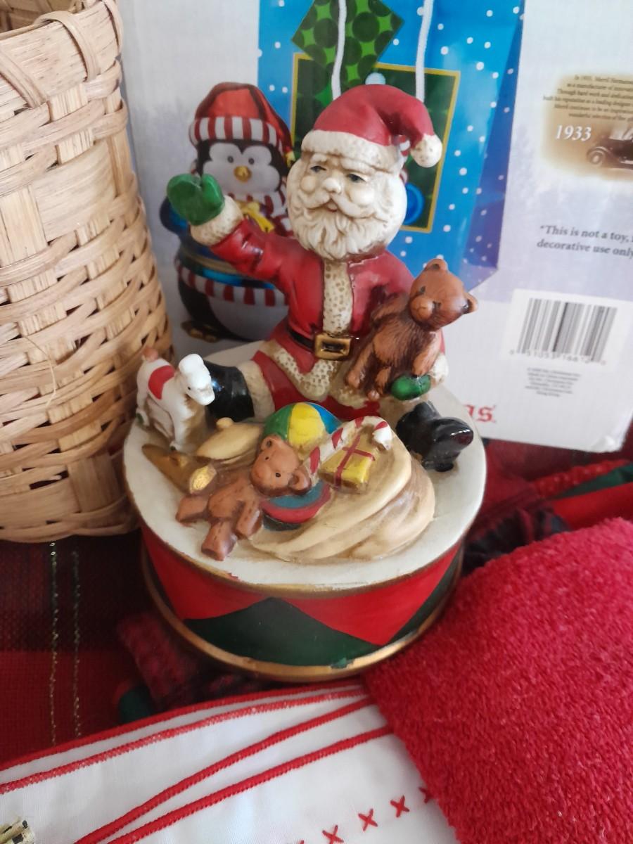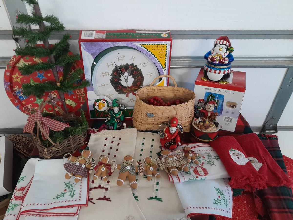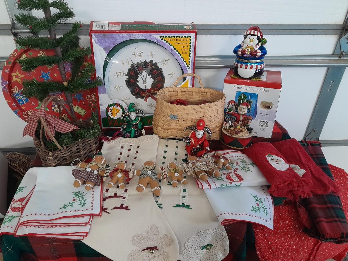 WALL CLOCK THAT PLAYS A CAROL AT THE TOP OF EACH HOUR, GINGERBREAD CHAIN, BASKET, SANTA MUSIC BOX