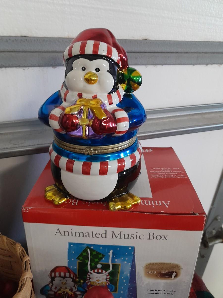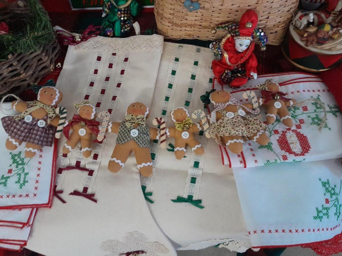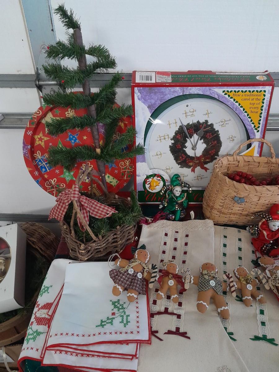 WALL CLOCK THAT PLAYS A CAROL AT THE TOP OF EACH HOUR, GINGERBREAD CHAIN, BASKET, SANTA MUSIC BOX