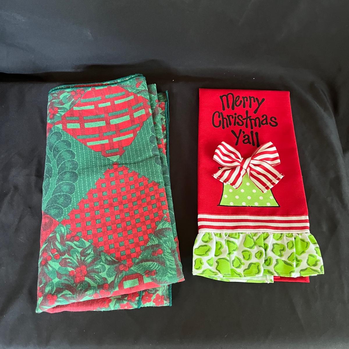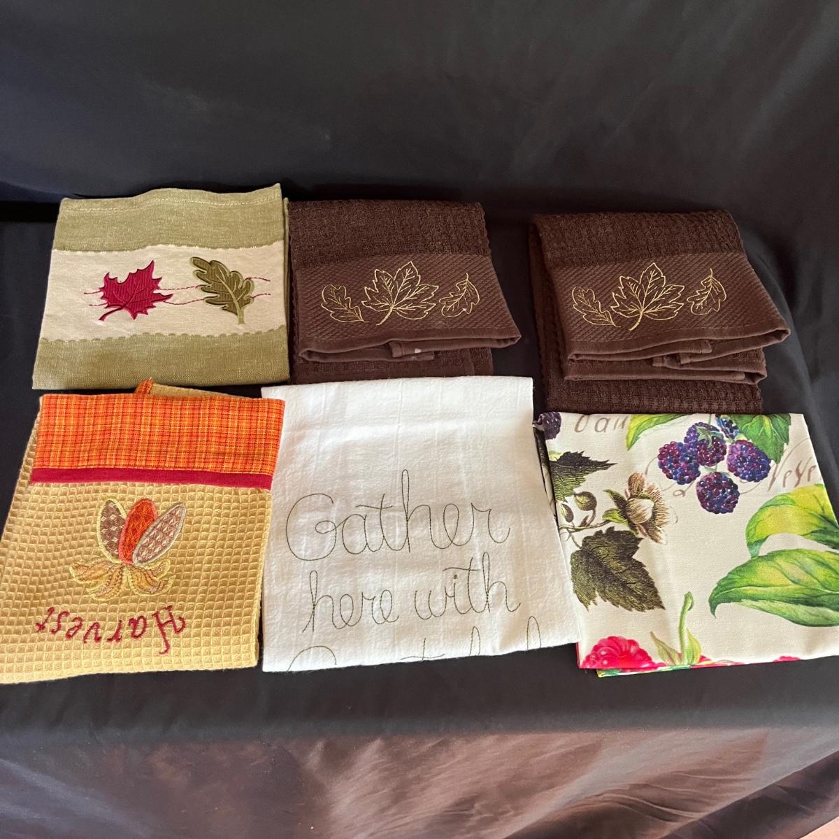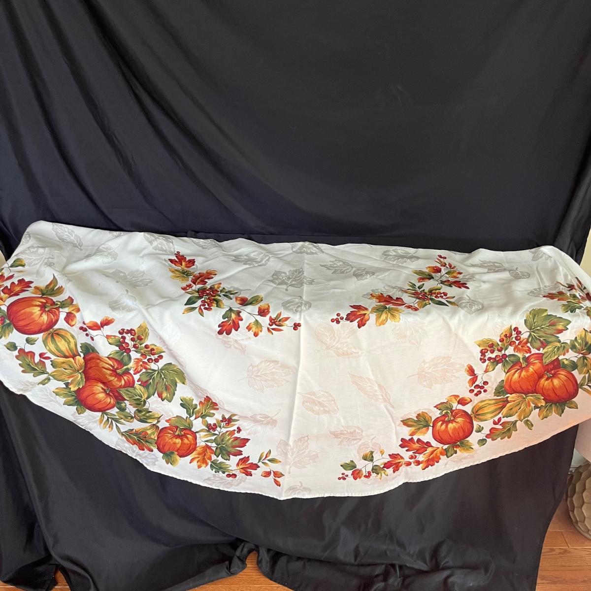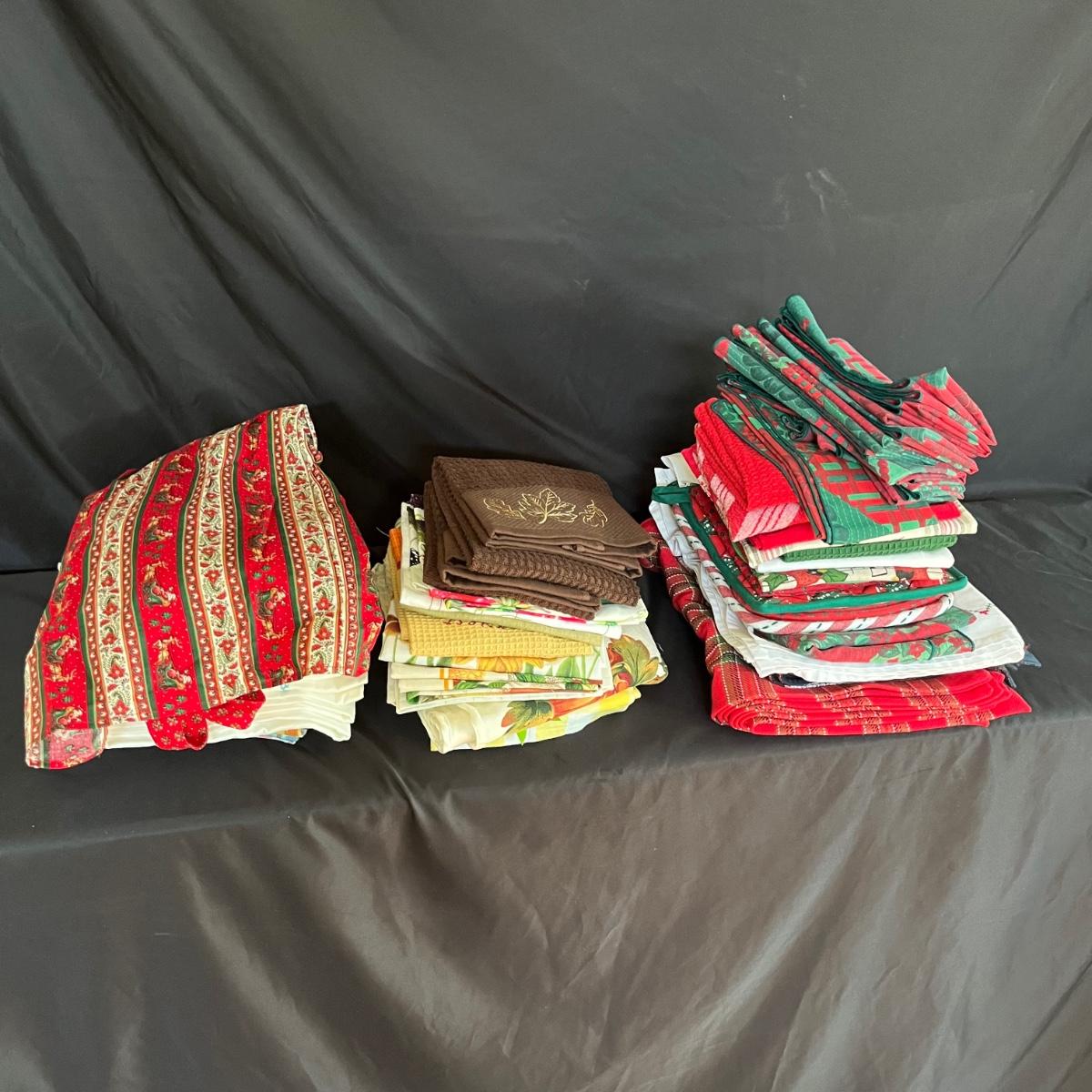 Lot includes a large collection of linens and placemats in a variety of colors and styles also includes one autumn tablecloth that measures 68”D.