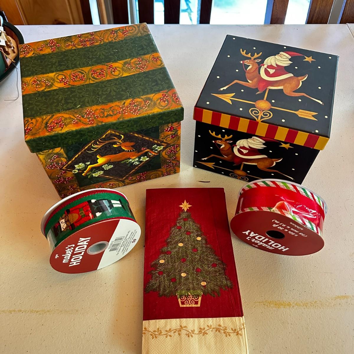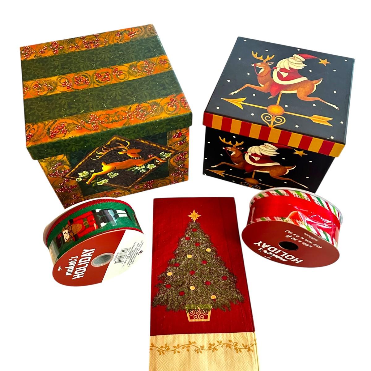 Holiday Lot - 2 Rolls of New Ribbon, 2 Stacking Boxes, and Napkins