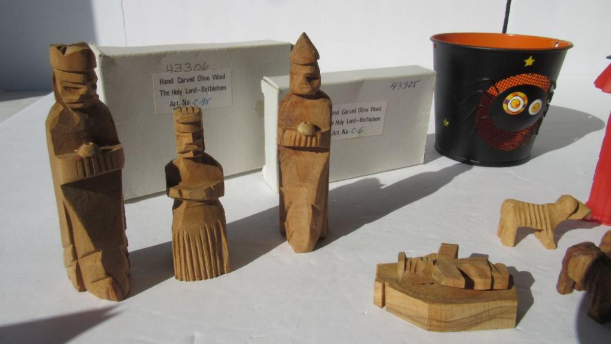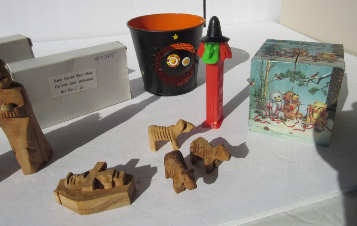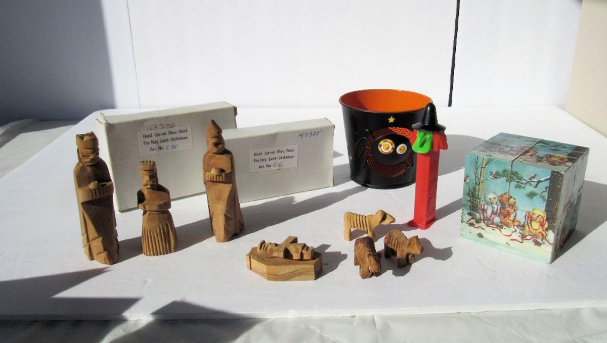 Holiday Lot: Halloween Small Bucket, Pez Witch, Christmas Nativity Pieces from Isreal, Block Toy
