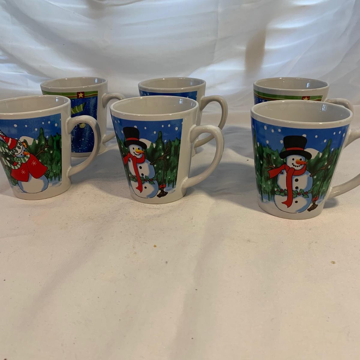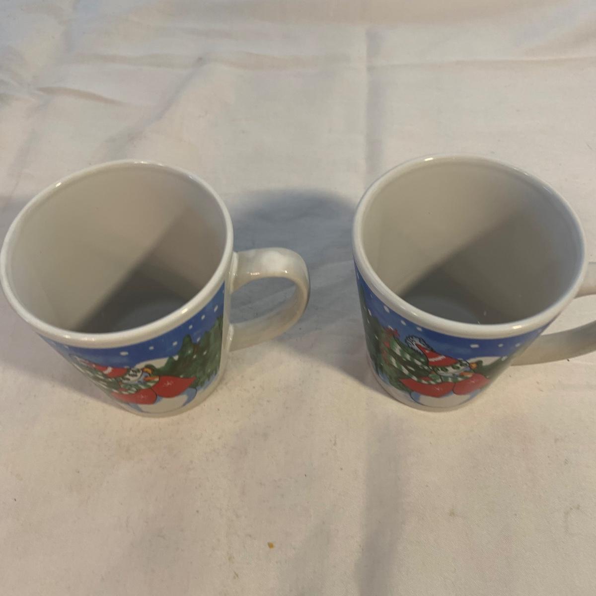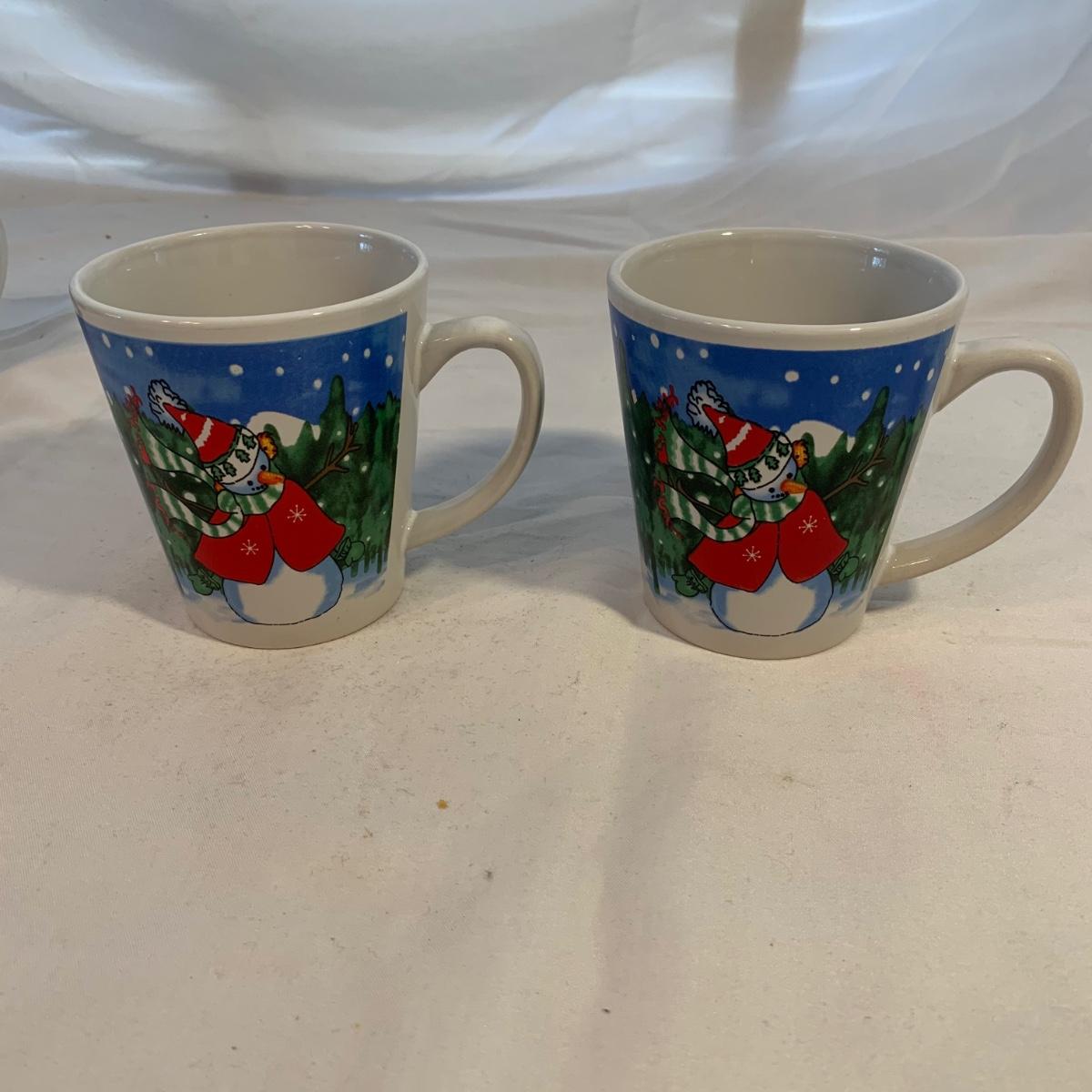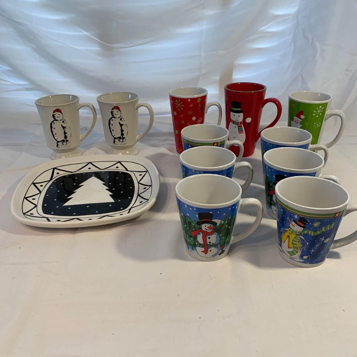 This lot includes 11 Christmas mugs and one plate. Included is a set of 6 snowmen mugs, 3 taller mugs, and a pair of Mesa mugs. One of the Mesa mugs has a chip in it (see photos). The largest mug measures about 6.5in tall. Shipping available.