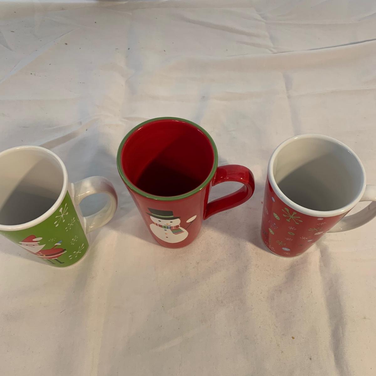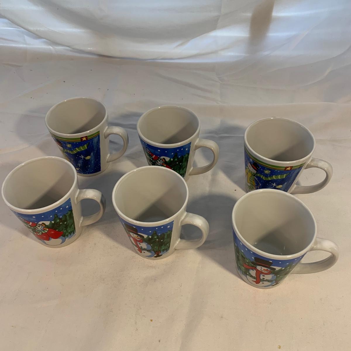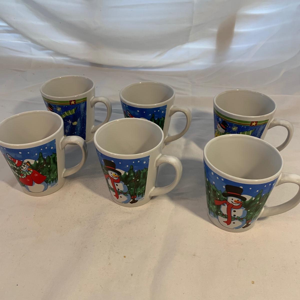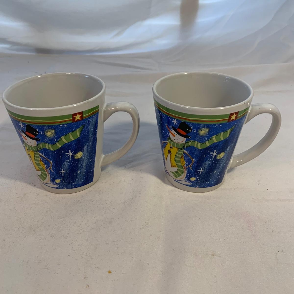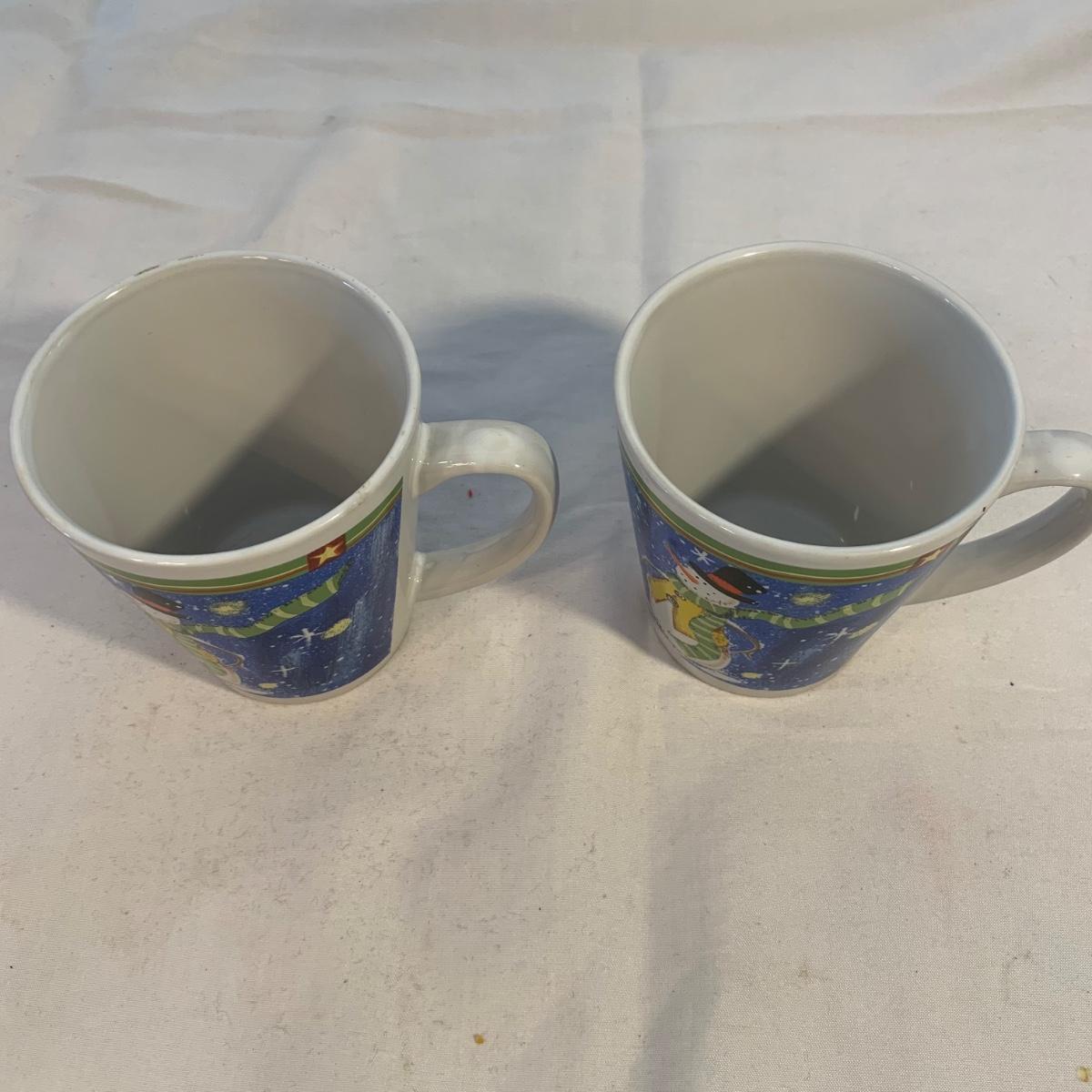 This lot includes 11 Christmas mugs and one plate. Included is a set of 6 snowmen mugs, 3 taller mugs, and a pair of Mesa mugs. One of the Mesa mugs has a chip in it (see photos). The largest mug measures about 6.5in tall. Shipping available.