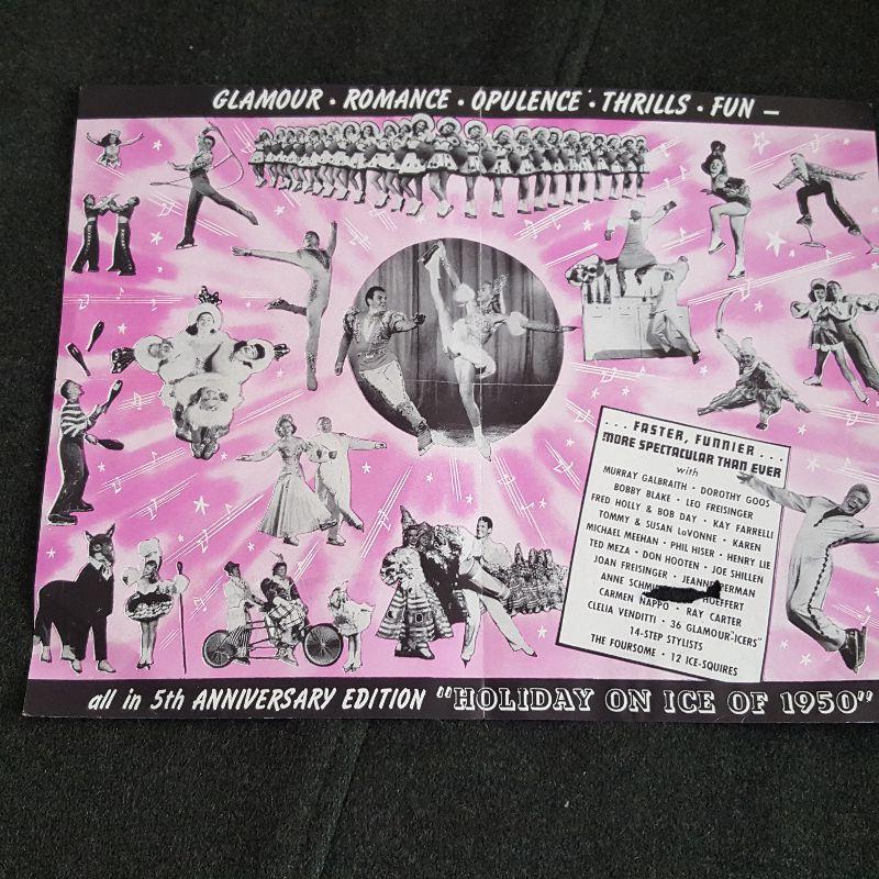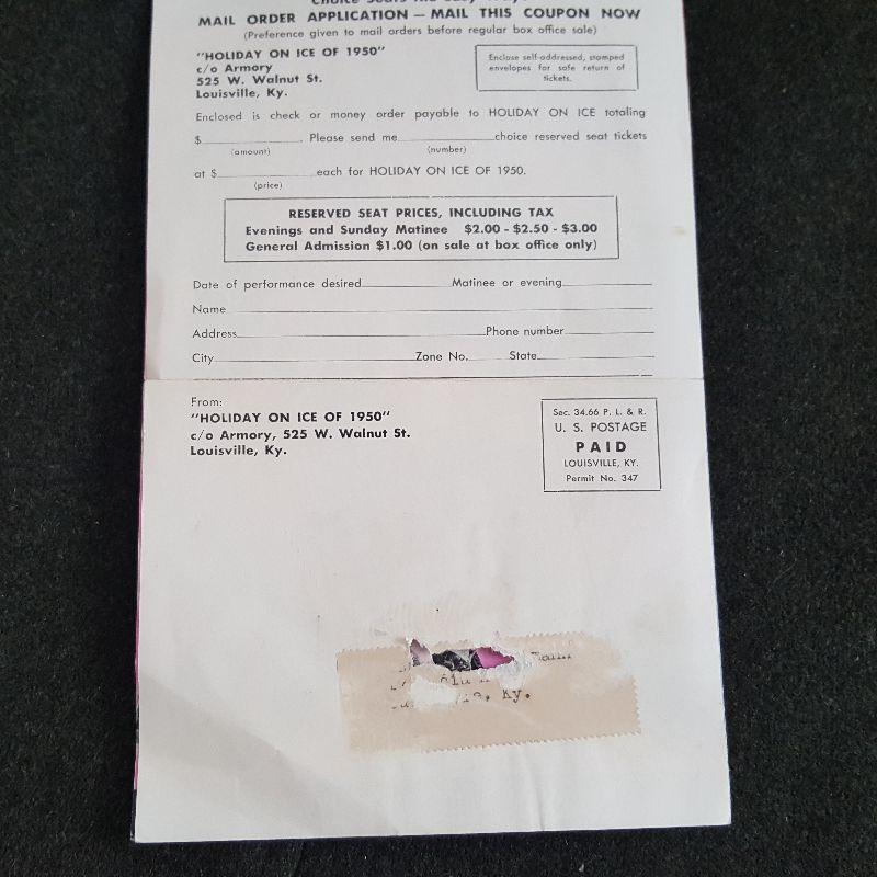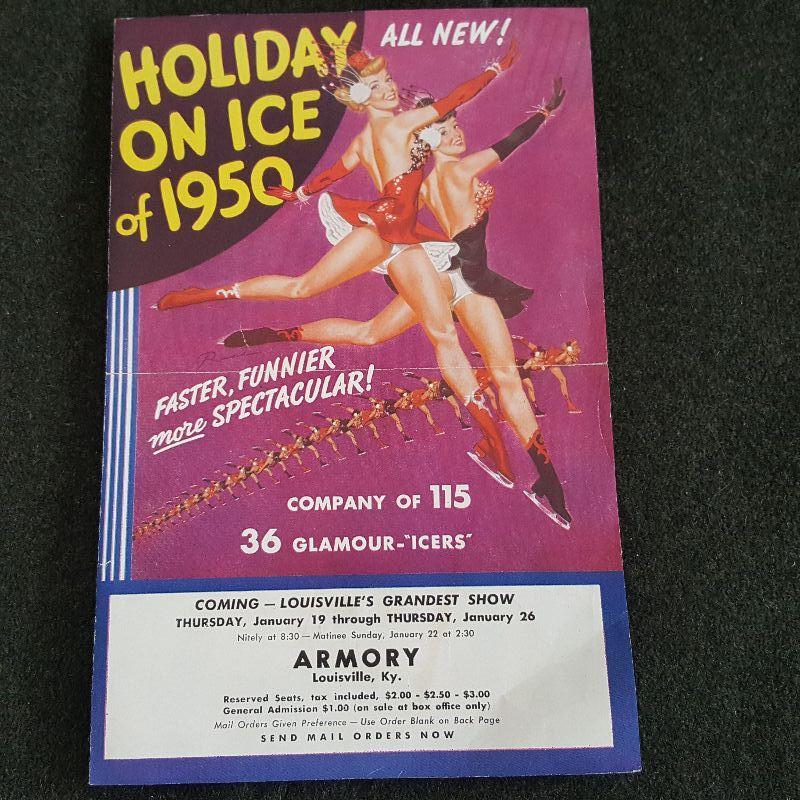 This lot is for a Holiday On Ice of 1950 Program. In the 1950s troops of skaters - filled with many Olympic Champions, would tour the country giving shows to the delight of many. This nice piece of ephemera recalls the show at the old Armory in Louisville, KY