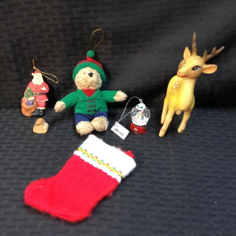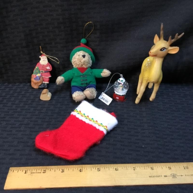 Items in lot are as-pictured. You’ll receive three Christmas ornaments, one plastic reindeer toy, one carved wooden heart, and one miniature felt stocking; see pictures.