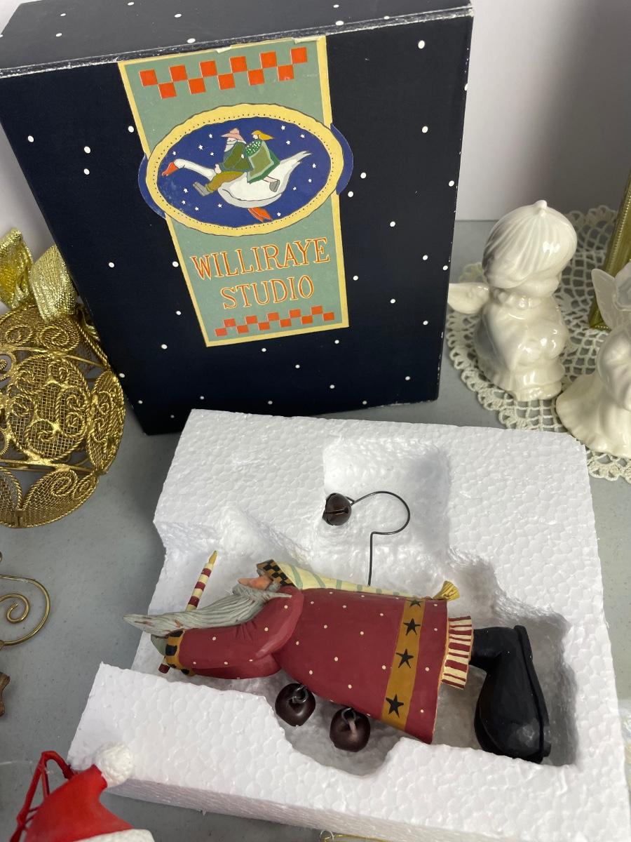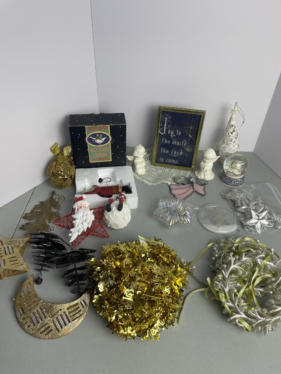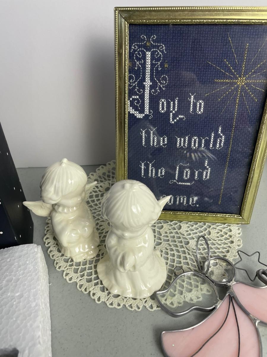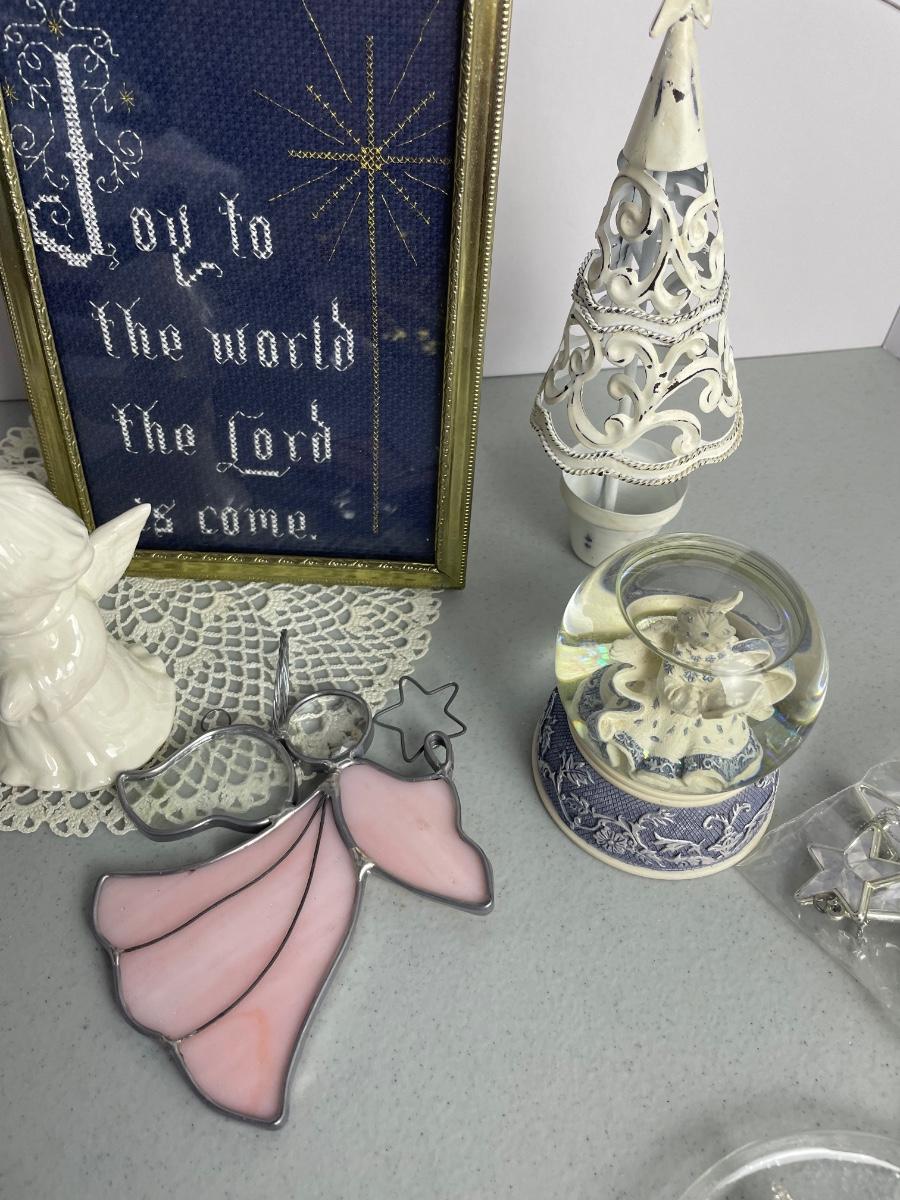 Nice assortment including cross stitch in frame, Williraye Studio, ceramic angels, window ornaments, snow globe and more.