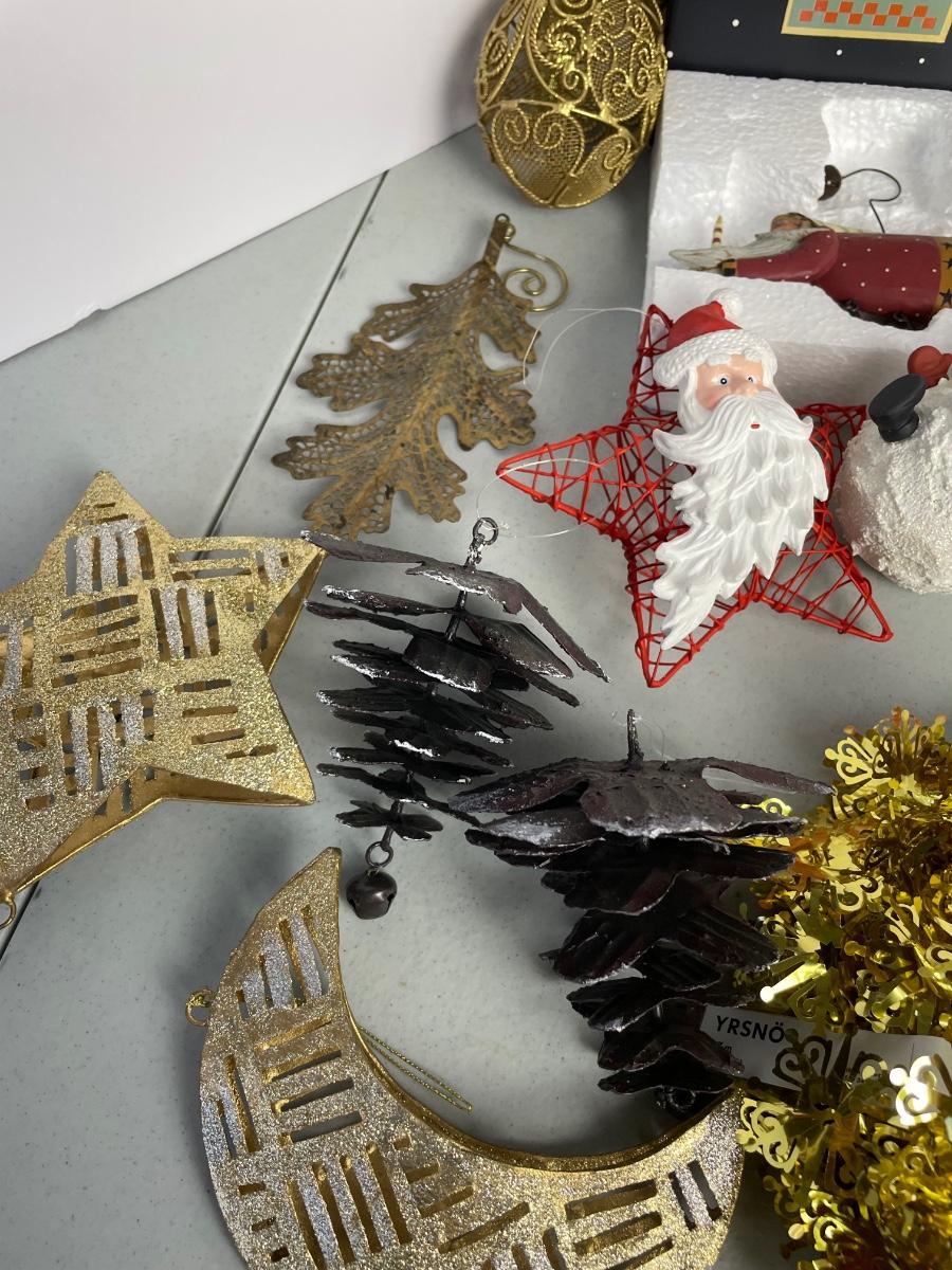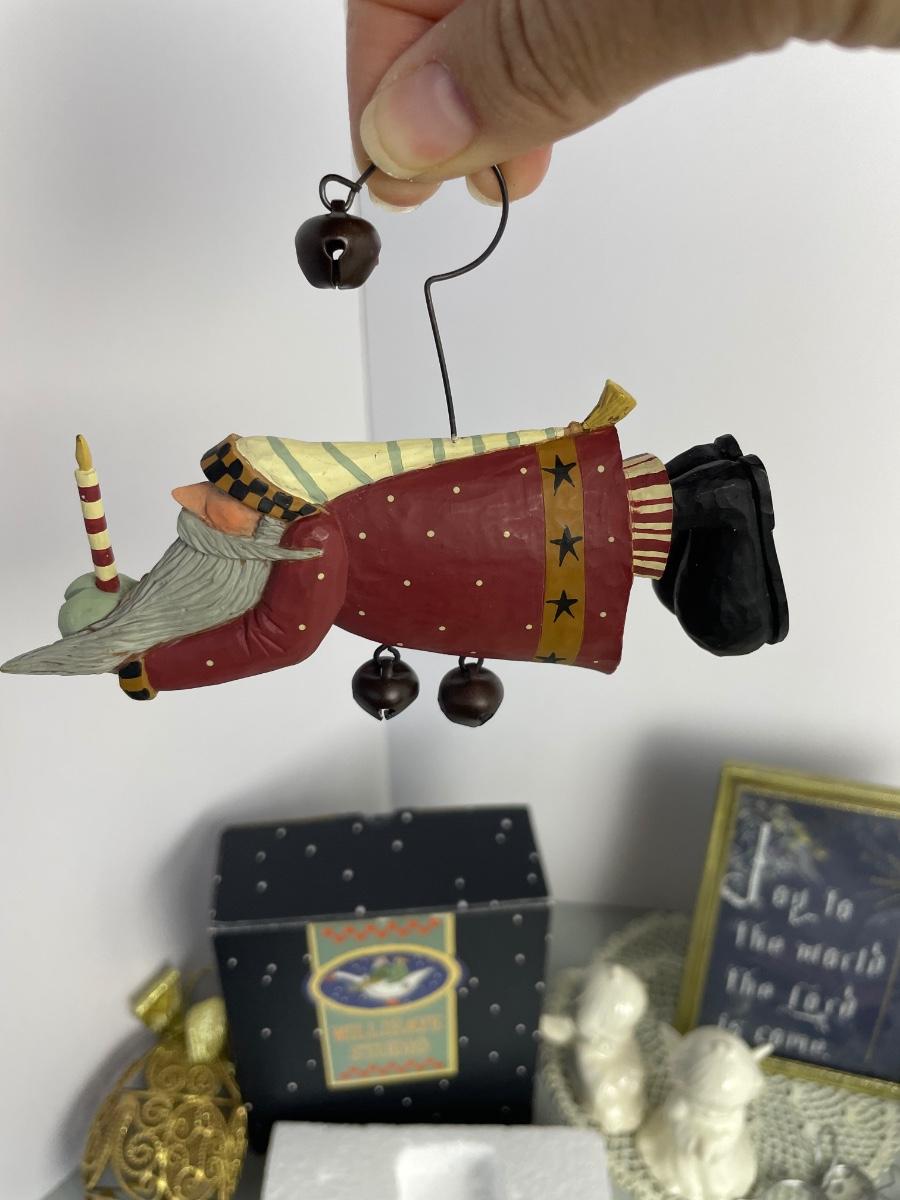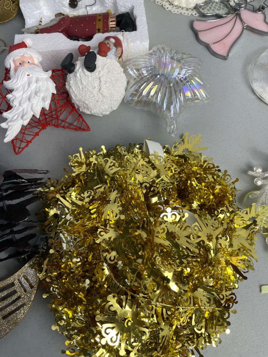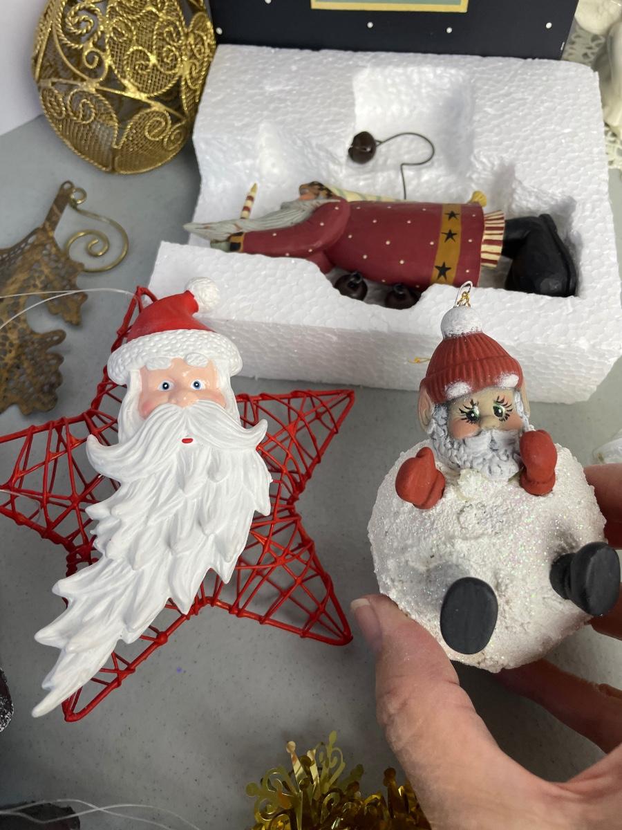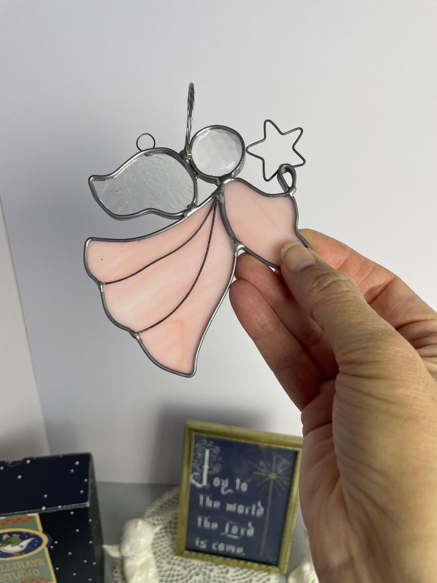 Nice assortment including cross stitch in frame, Williraye Studio, ceramic angels, window ornaments, snow globe and more.