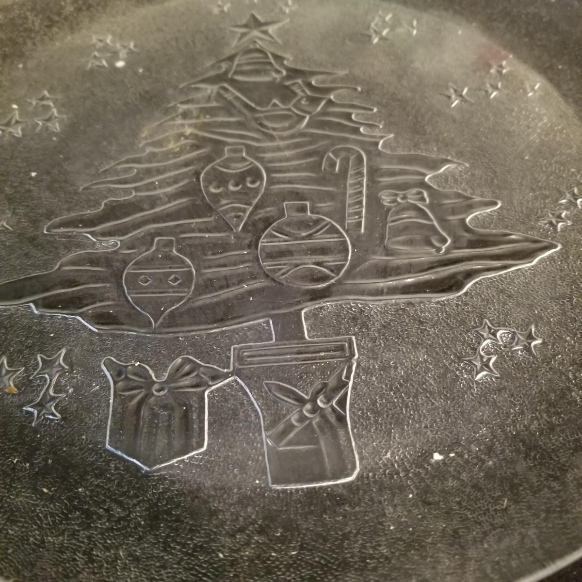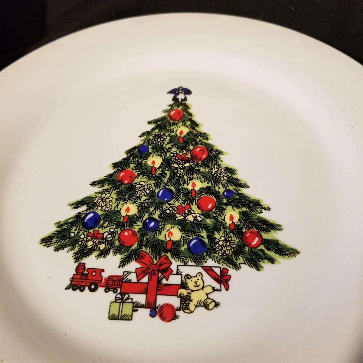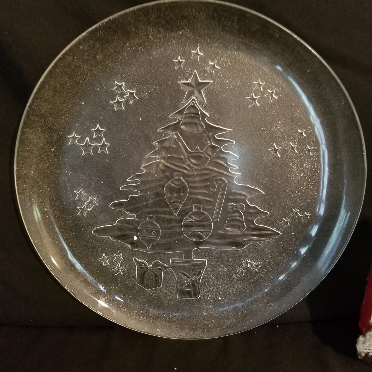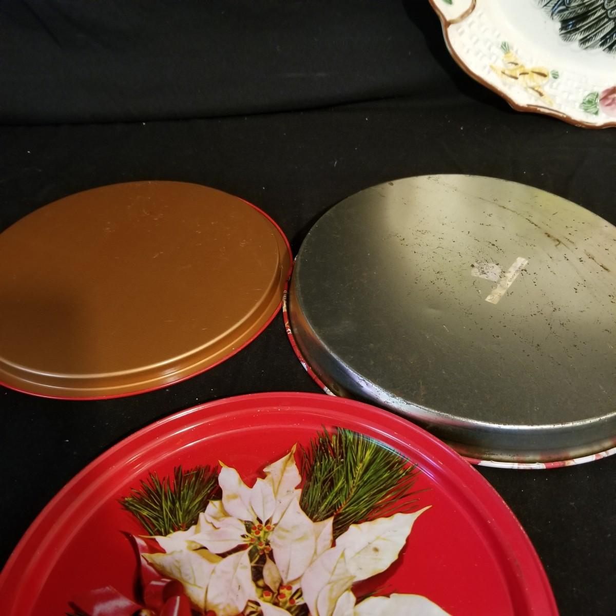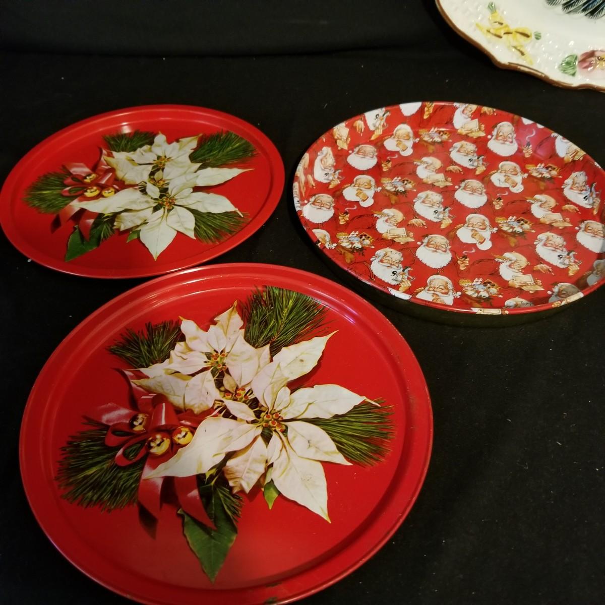Holiday themed serving pieces and more. One large Thanksgiving turkey platter, 18"x14.5". All other items Christmas themed. Tins, trays, cups, mugs, coasters, plates and one Christmas cat brick door stop. Glass plate is 13"d, tree plates are 10.5" and 7.5". Shipping available.