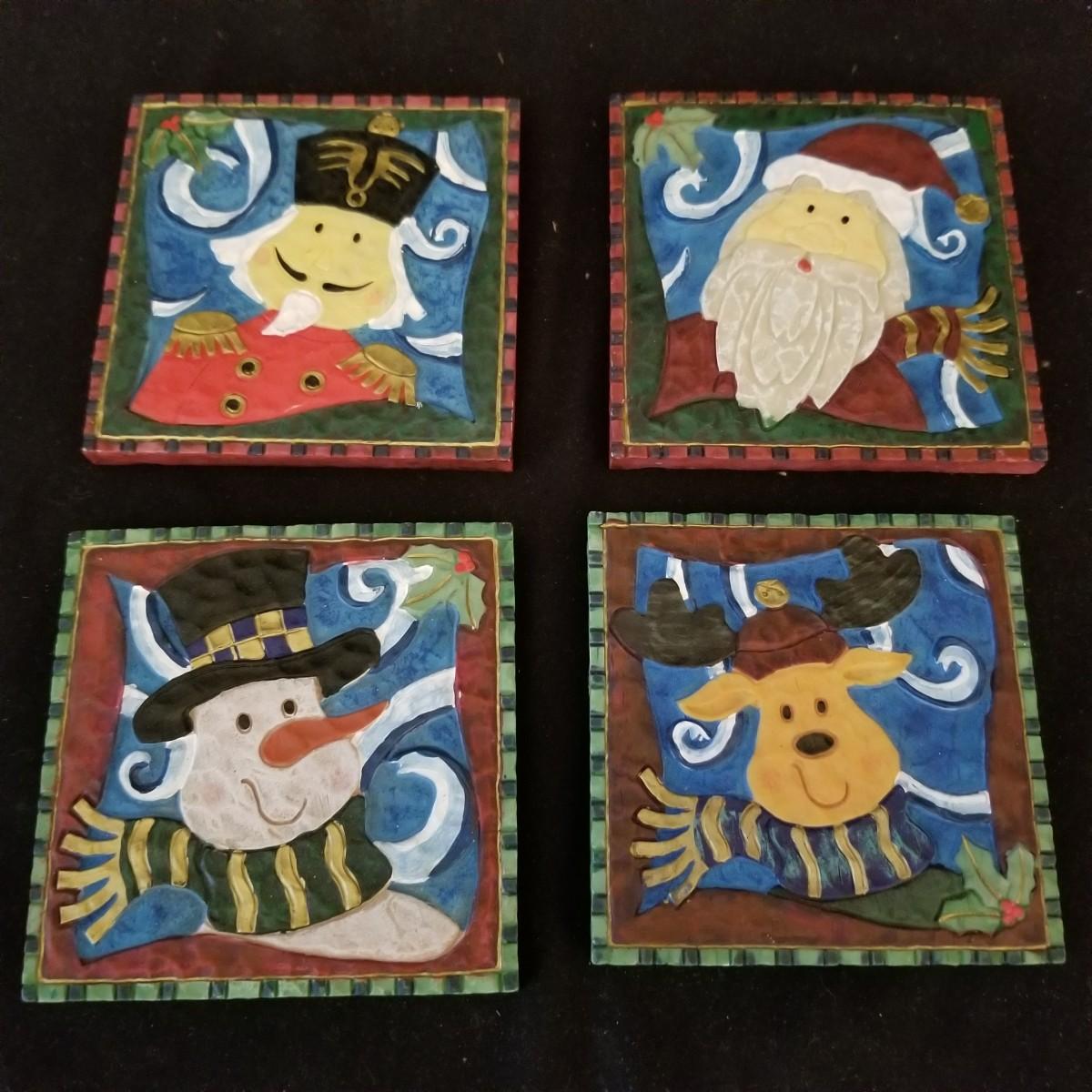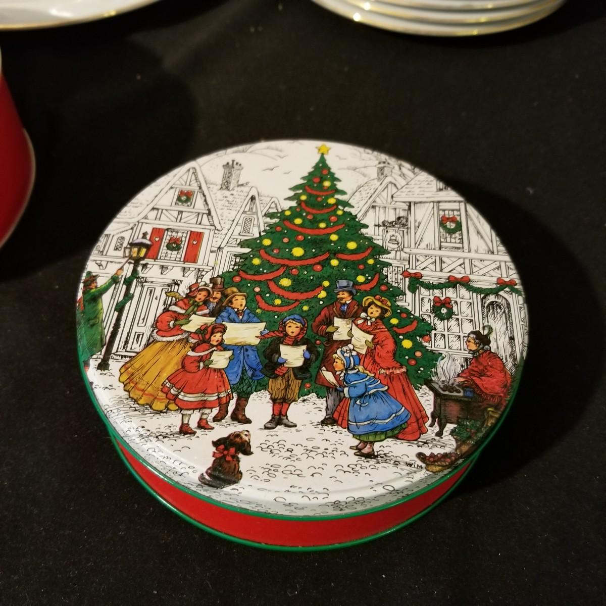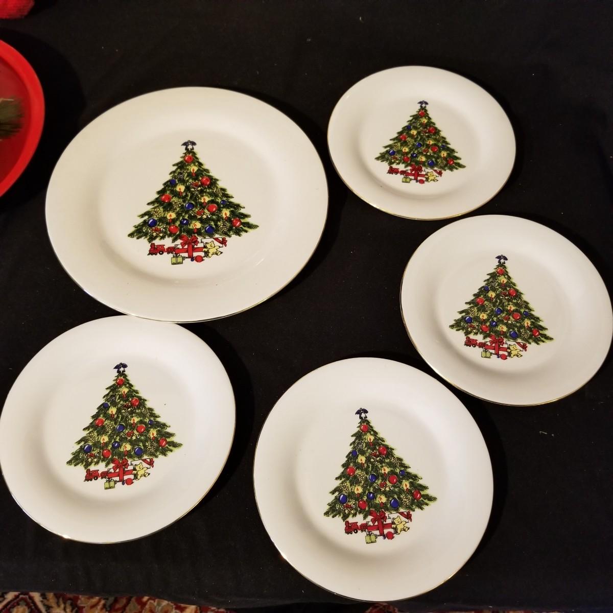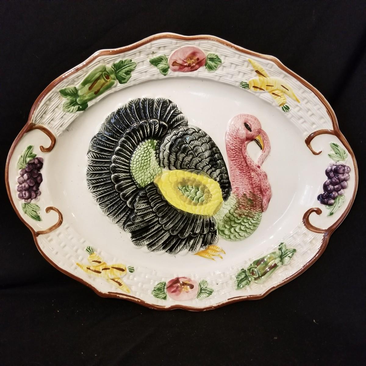 Holiday themed serving pieces and more. One large Thanksgiving turkey platter, 18"x14.5". All other items Christmas themed. Tins, trays, cups, mugs, coasters, plates and one Christmas cat brick door stop. Glass plate is 13"d, tree plates are 10.5" and 7.5". Shipping available.