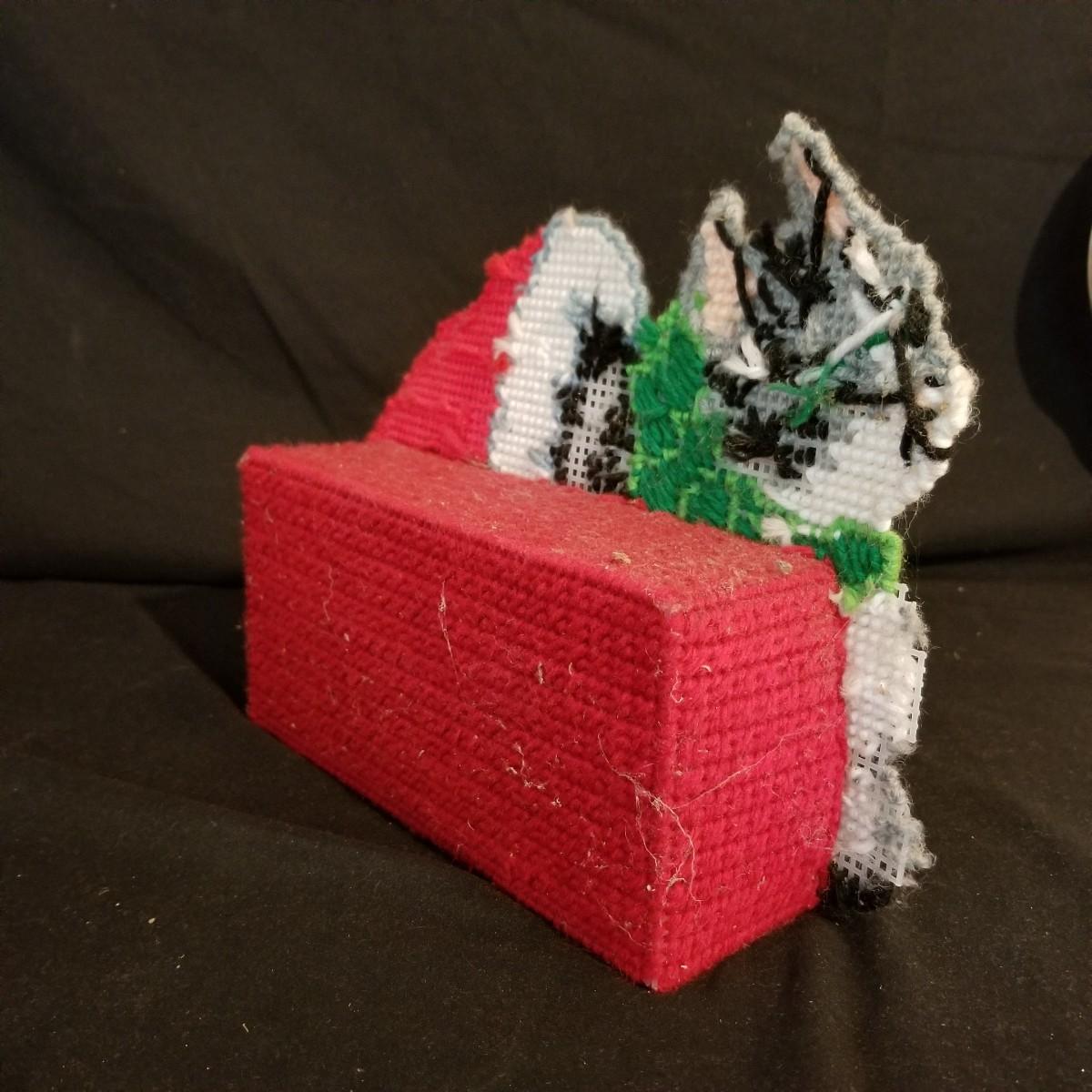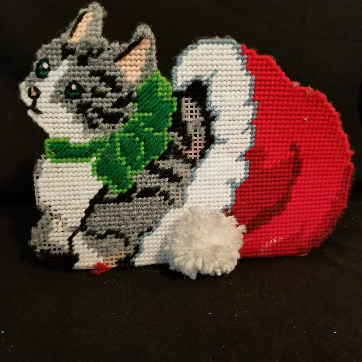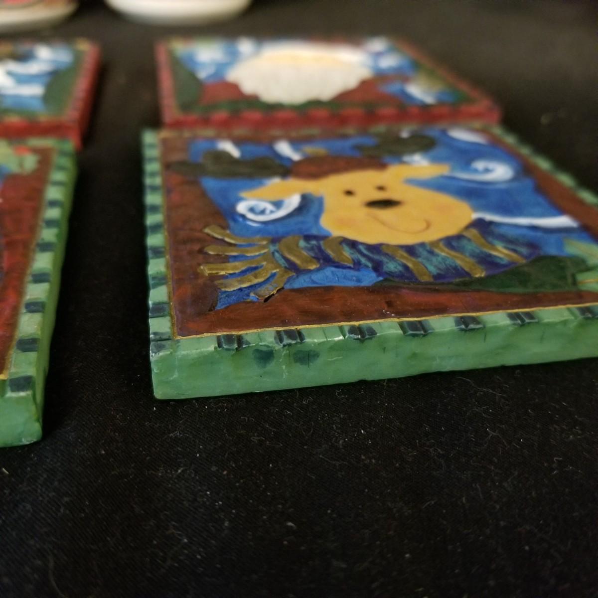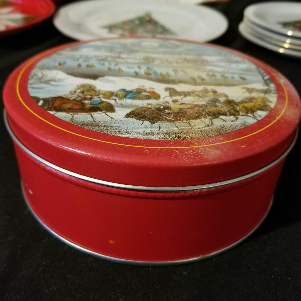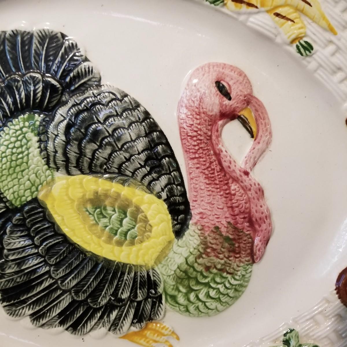 Holiday themed serving pieces and more. One large Thanksgiving turkey platter, 18"x14.5". All other items Christmas themed. Tins, trays, cups, mugs, coasters, plates and one Christmas cat brick door stop. Glass plate is 13"d, tree plates are 10.5" and 7.5". Shipping available.