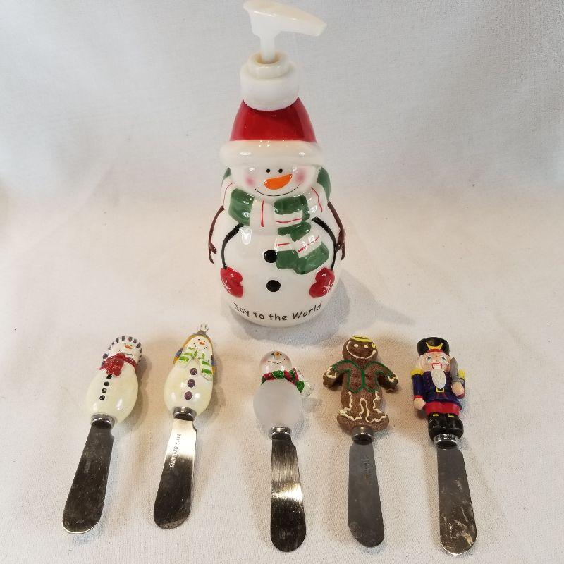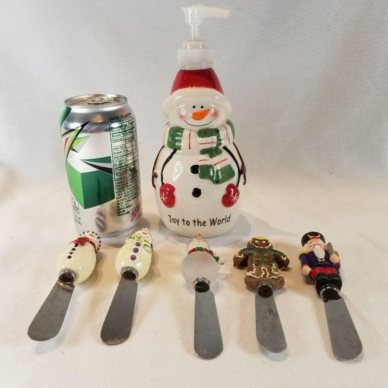 This lot is an odd-duck combination of a nice-sized Snowman hand soap dispenser and 5 holiday spreaders. The Soap Dispenser looks to have never been used, the 5 spreaders were used but in very good condition consistent with that use.