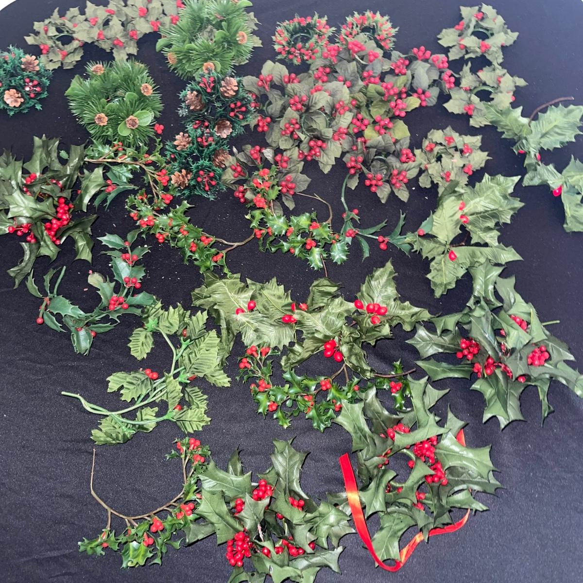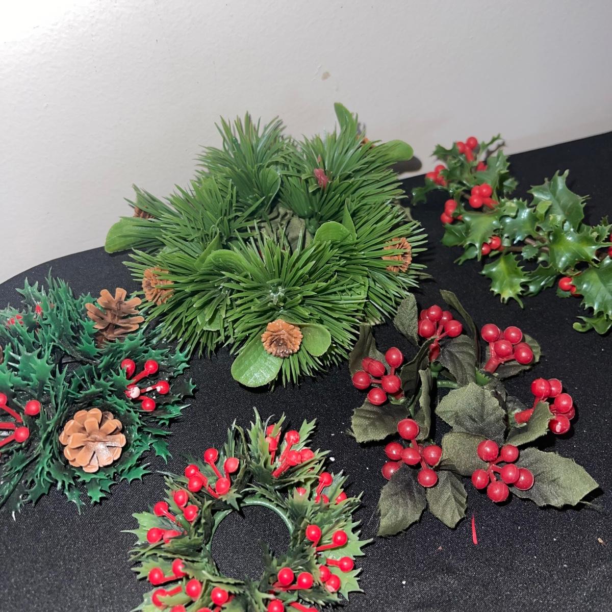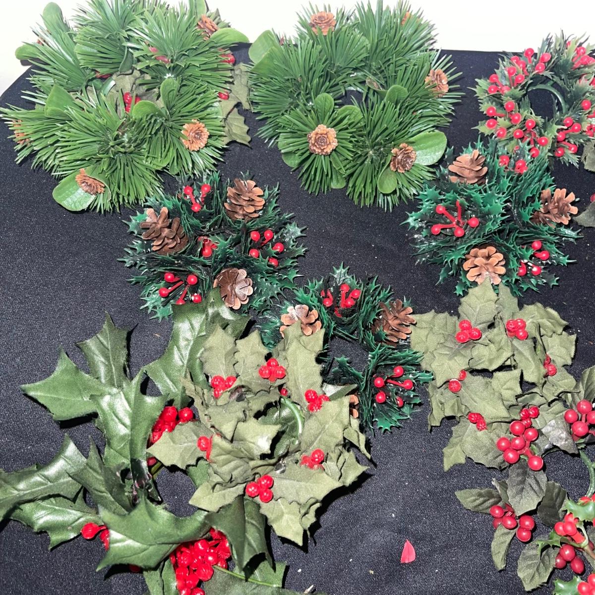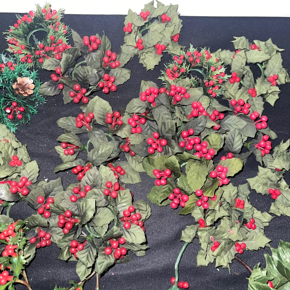 Variety of plastic holiday flora for table decoration, an ornament, a decorative hook, and fabric snowballs. The holly/ leaves include just pieces for decoration as well as multiple different types of wreath-like candlestick rings.