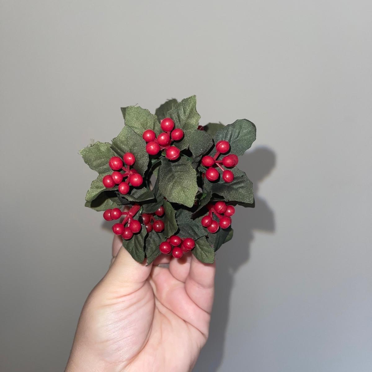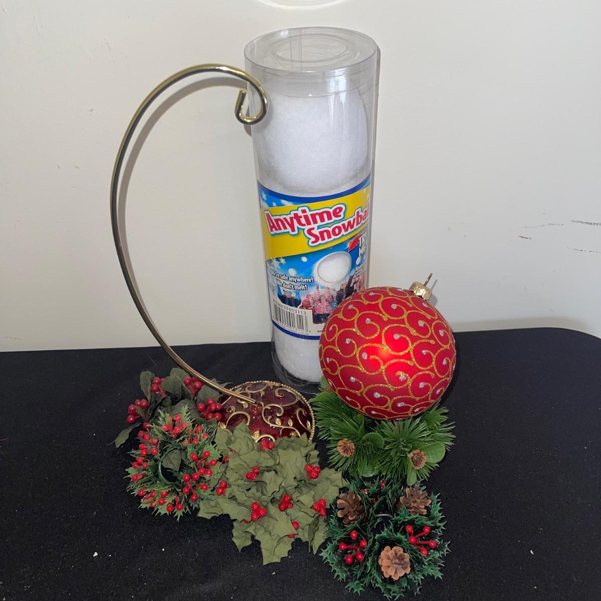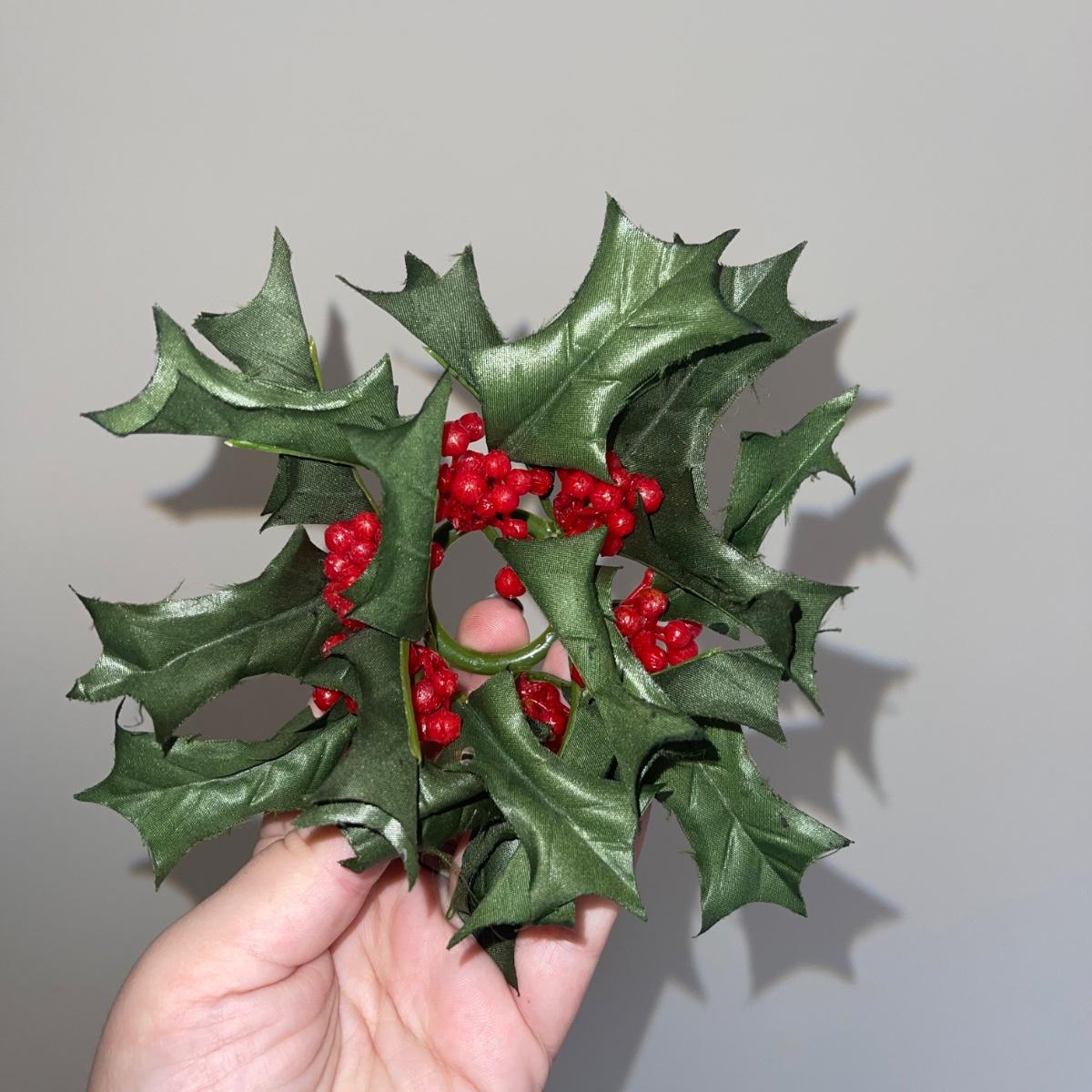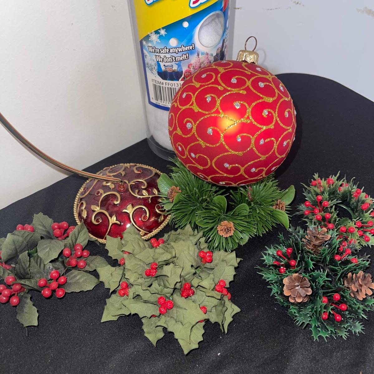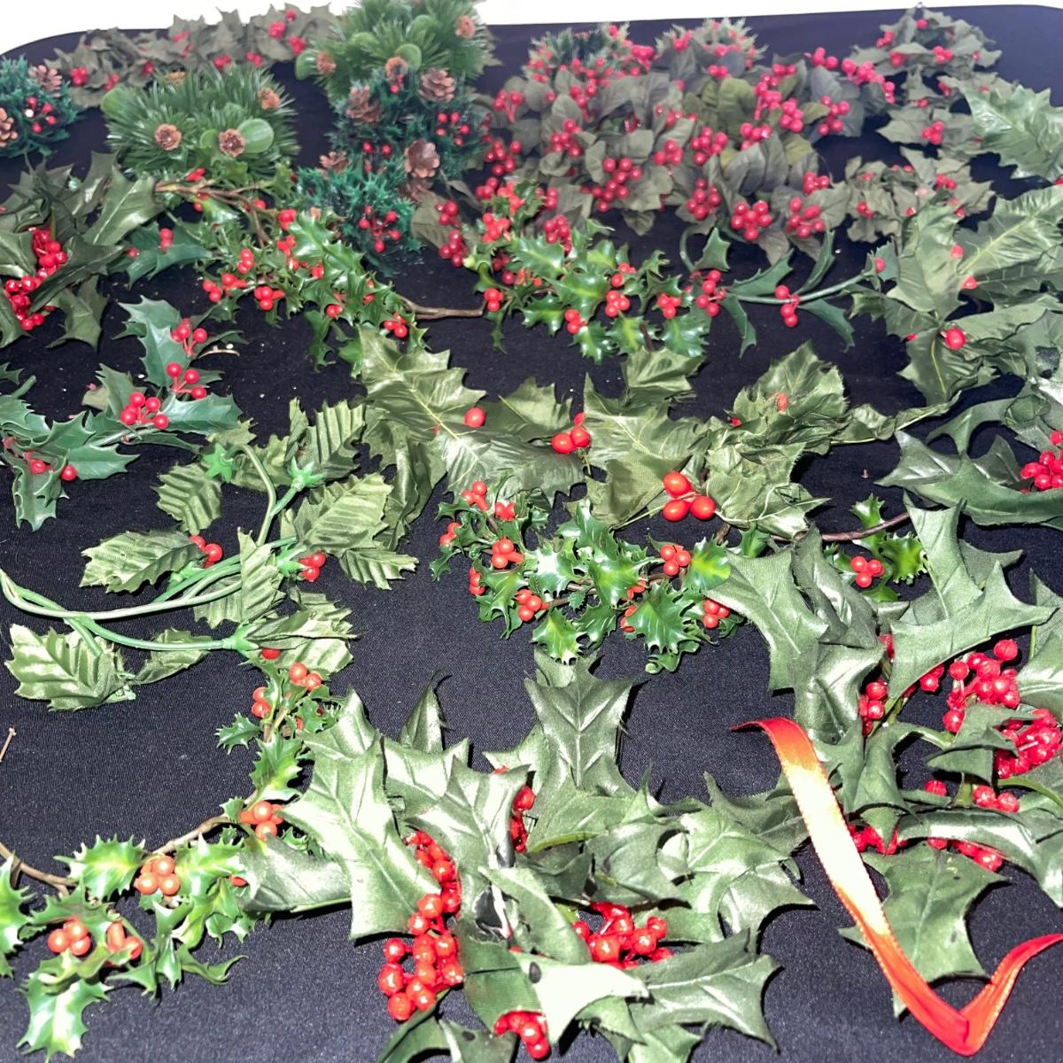 Variety of plastic holiday flora for table decoration, an ornament, a decorative hook, and fabric snowballs. The holly/ leaves include just pieces for decoration as well as multiple different types of wreath-like candlestick rings.