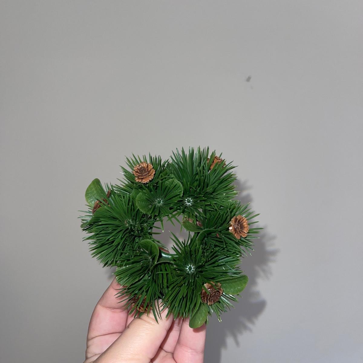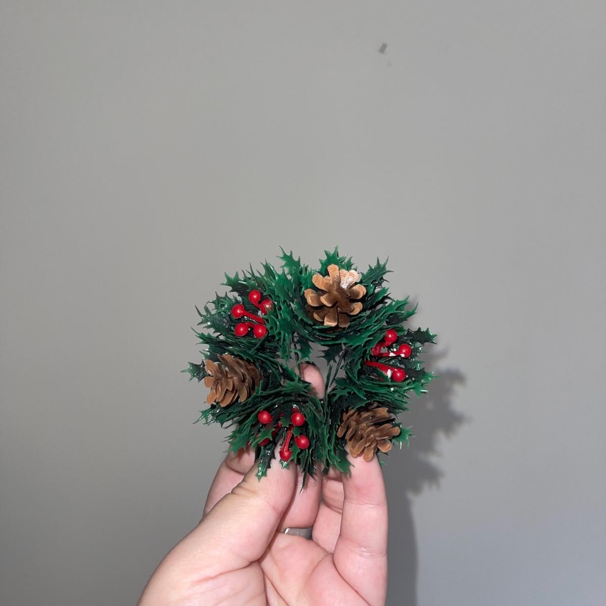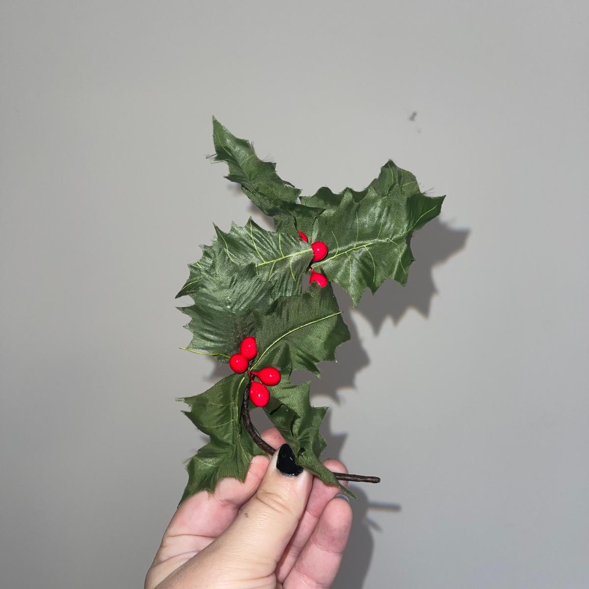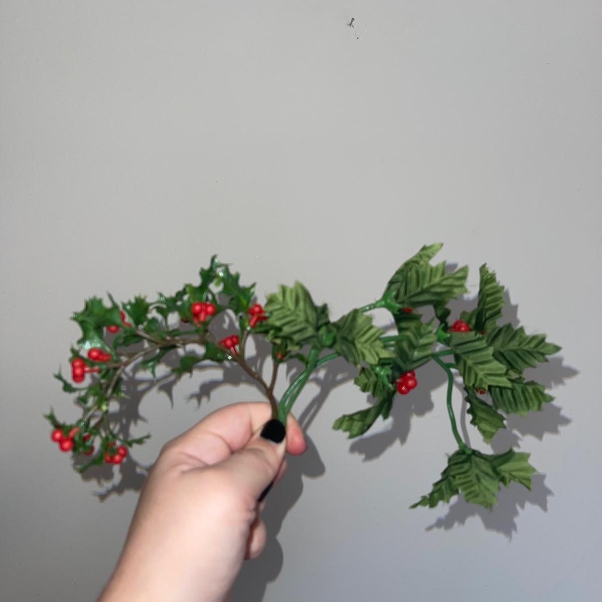Variety of plastic holiday flora for table decoration, an ornament, a decorative hook, and fabric snowballs. The holly/ leaves include just pieces for decoration as well as multiple different types of wreath-like candlestick rings.