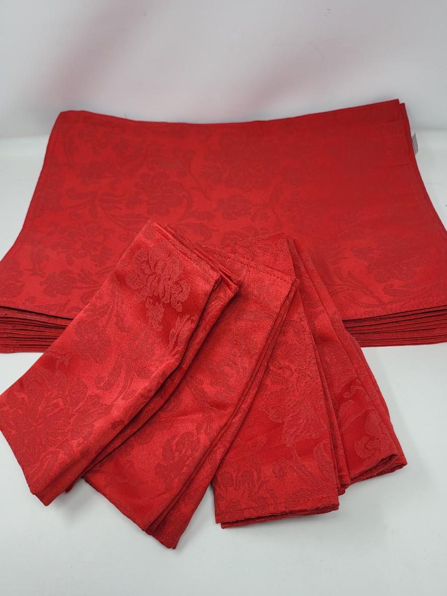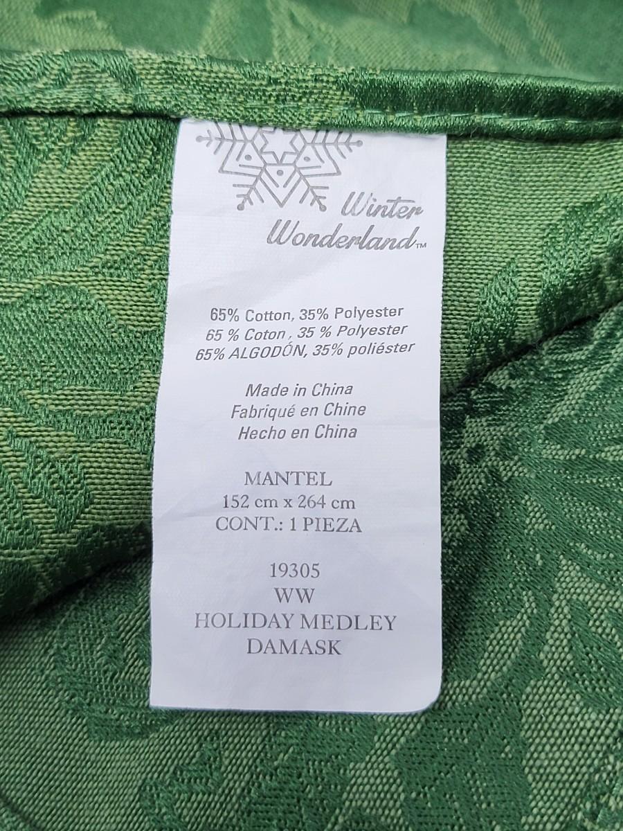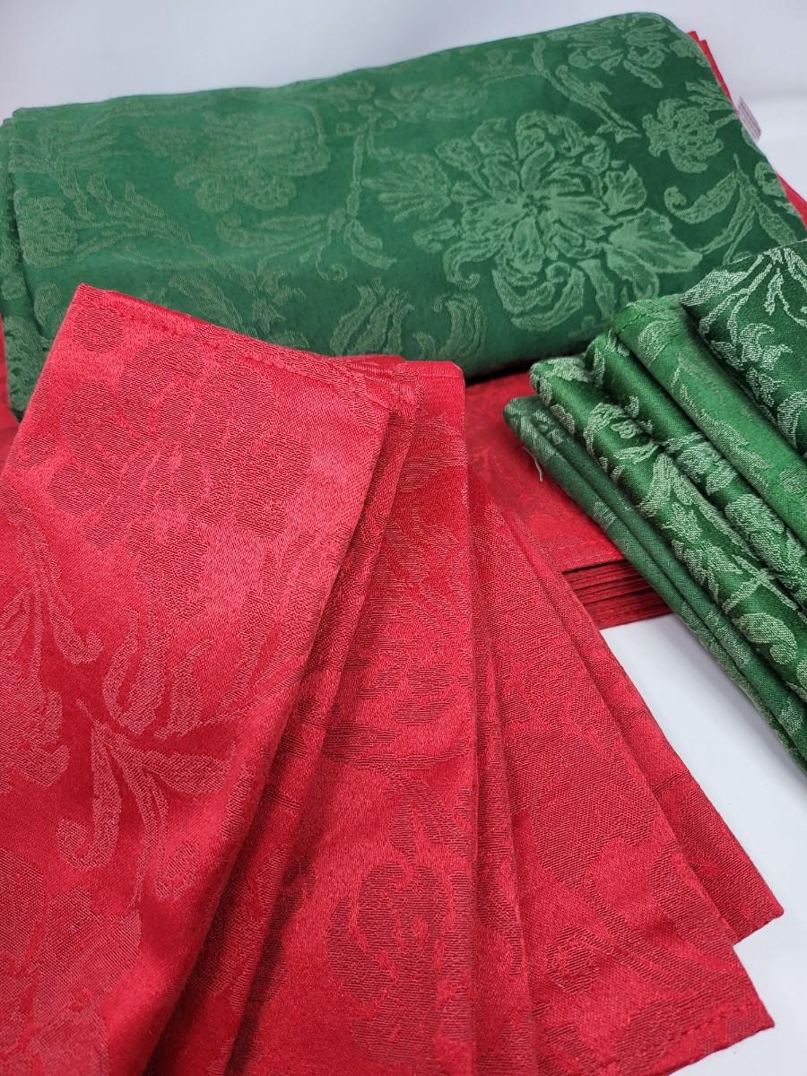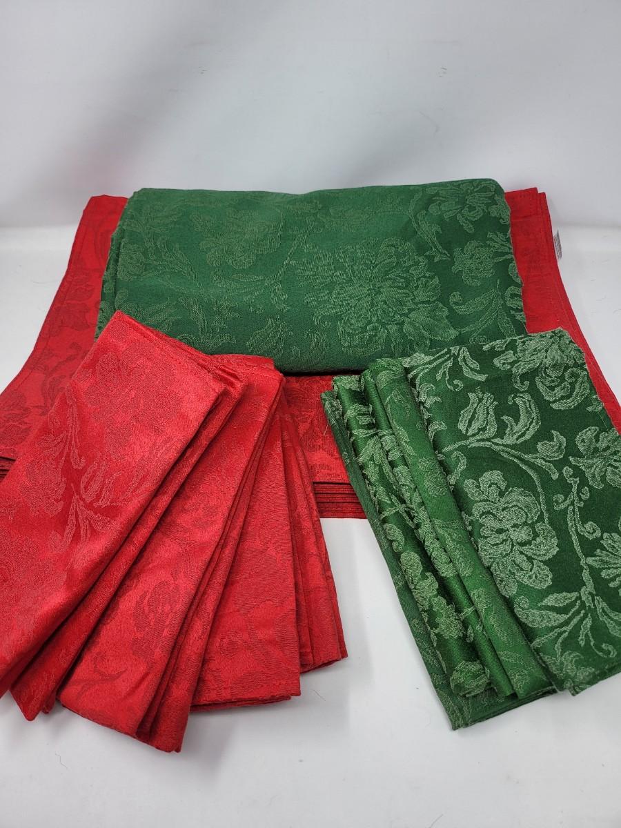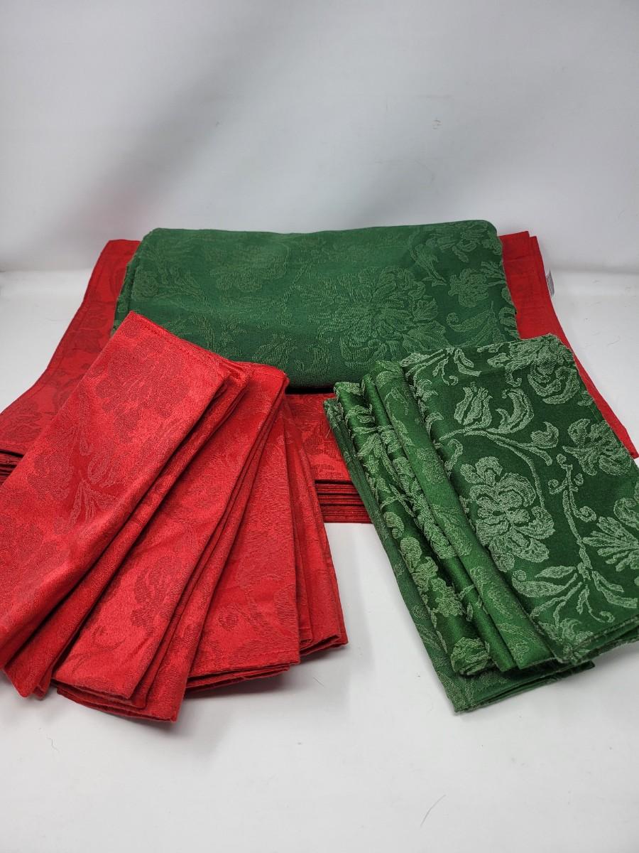 Winter wonderland holiday table linen: Red (10) & green (8) napkins & 17" x 12" placemats (12), and green tablecloth 56" x 102".