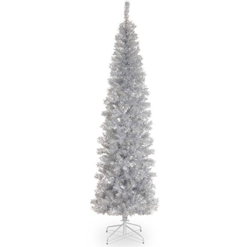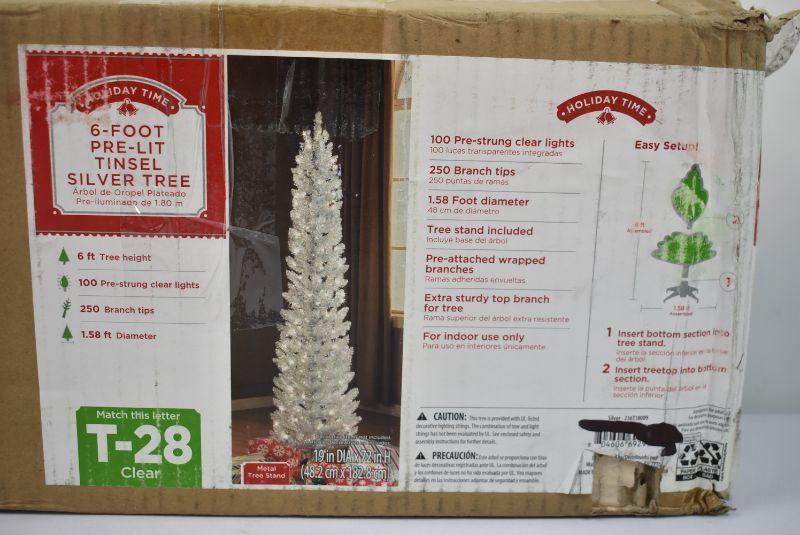 Holiday Time Pre-Lit Silver Tinsel Christmas Tree, 6', Clear, Retail $40 - New