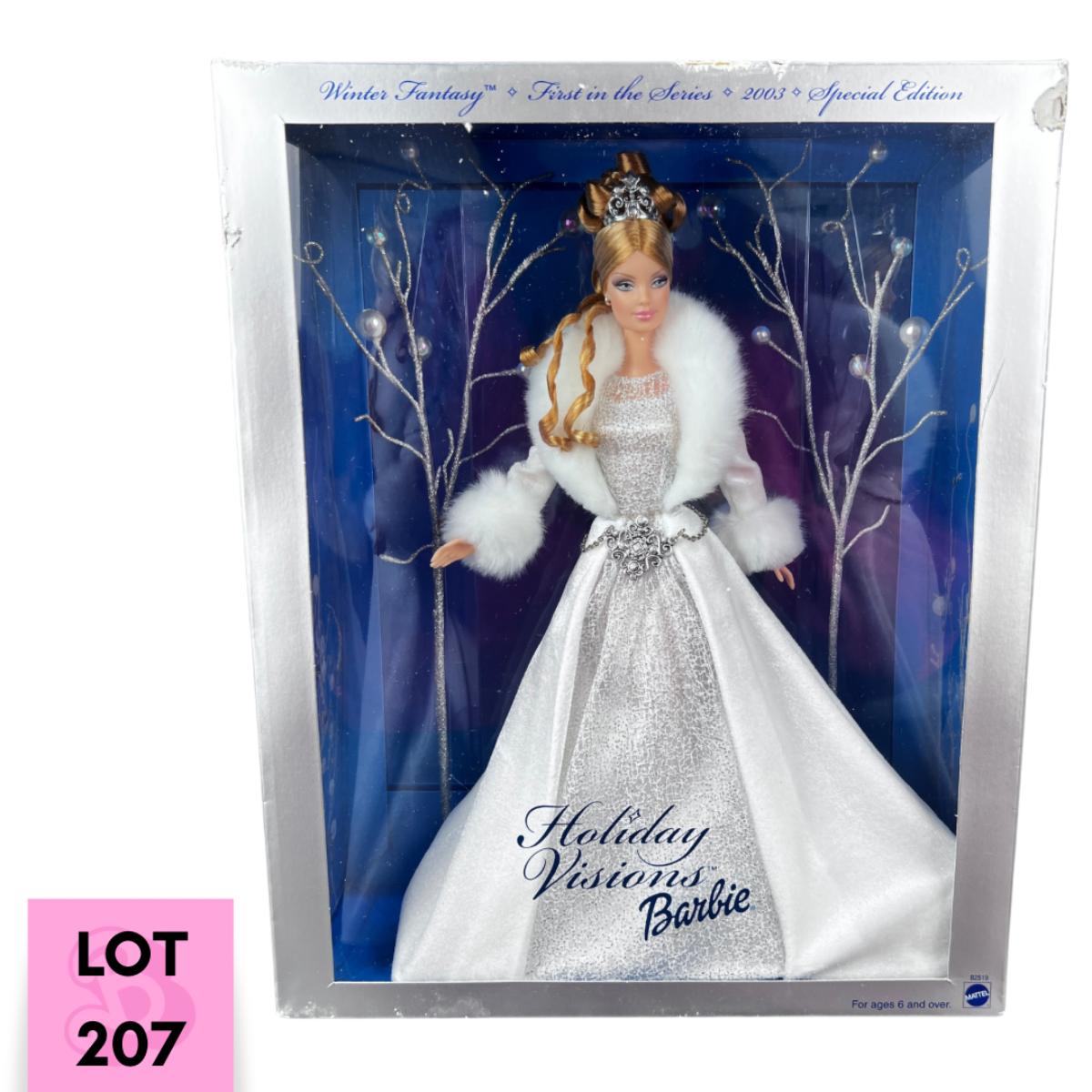The first in the Series, Winter Fantasy. Released in 2003 this doll, Holiday Visions Barbie, looks great in white, don't you think?! This doll has not been out of its box. The box does have some damage to it. **|** Please see photos for details and condition. ::: Shipping is available on this lot. If you require shipping you must let us know at the close of the auction. We will coordinate with you after the item has been won. Shipping fees will include insurance up to or exceeding the value of all items being mailed. If you have any questions regarding this lot please contact the auctioneer either via this website, by direct email or by phone. PICK UP TIMES and other important information can be found in the TERMS and DESCRIPTION of the auction. Please take a look for pertinent information. Thanks!