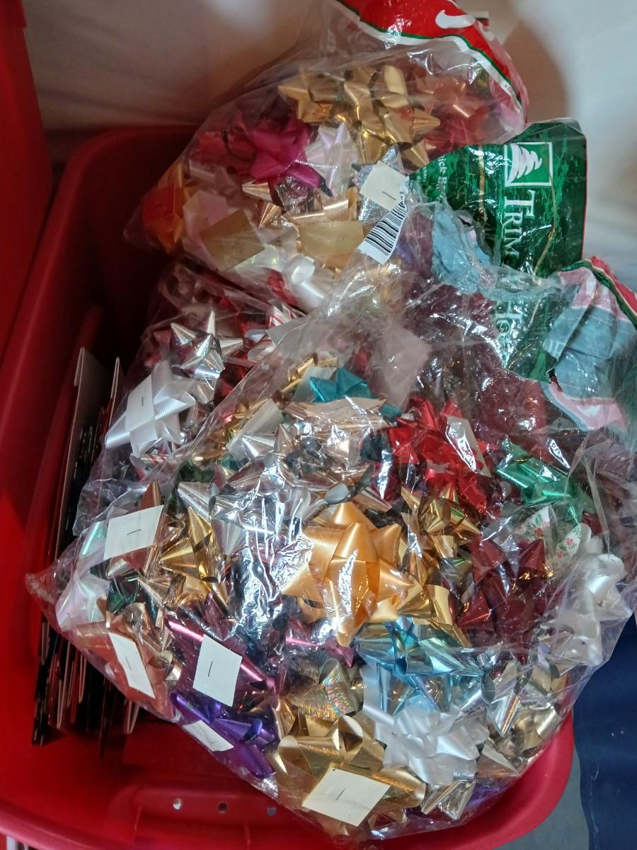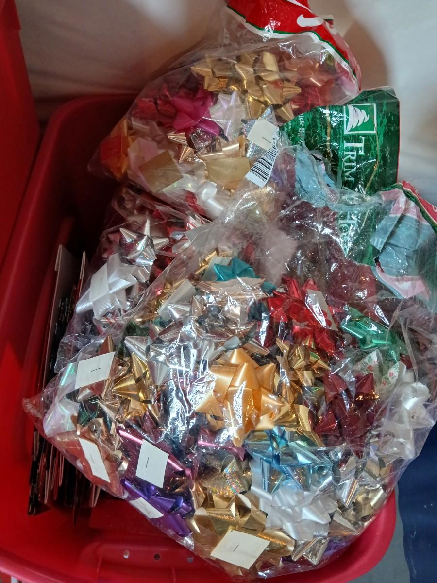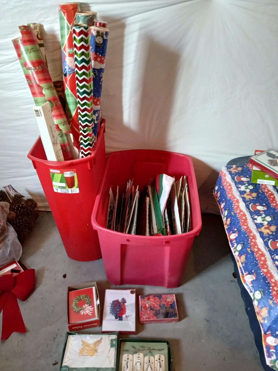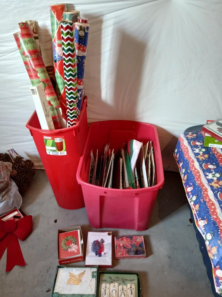 Everything you need to wrap and send holiday cheer! This lot includes two red totes packed with seasonal supplies: