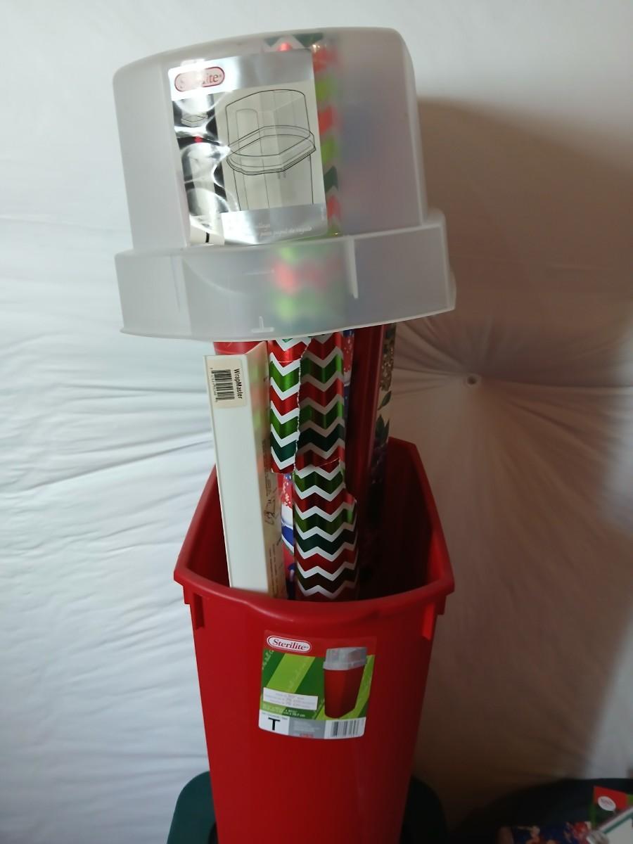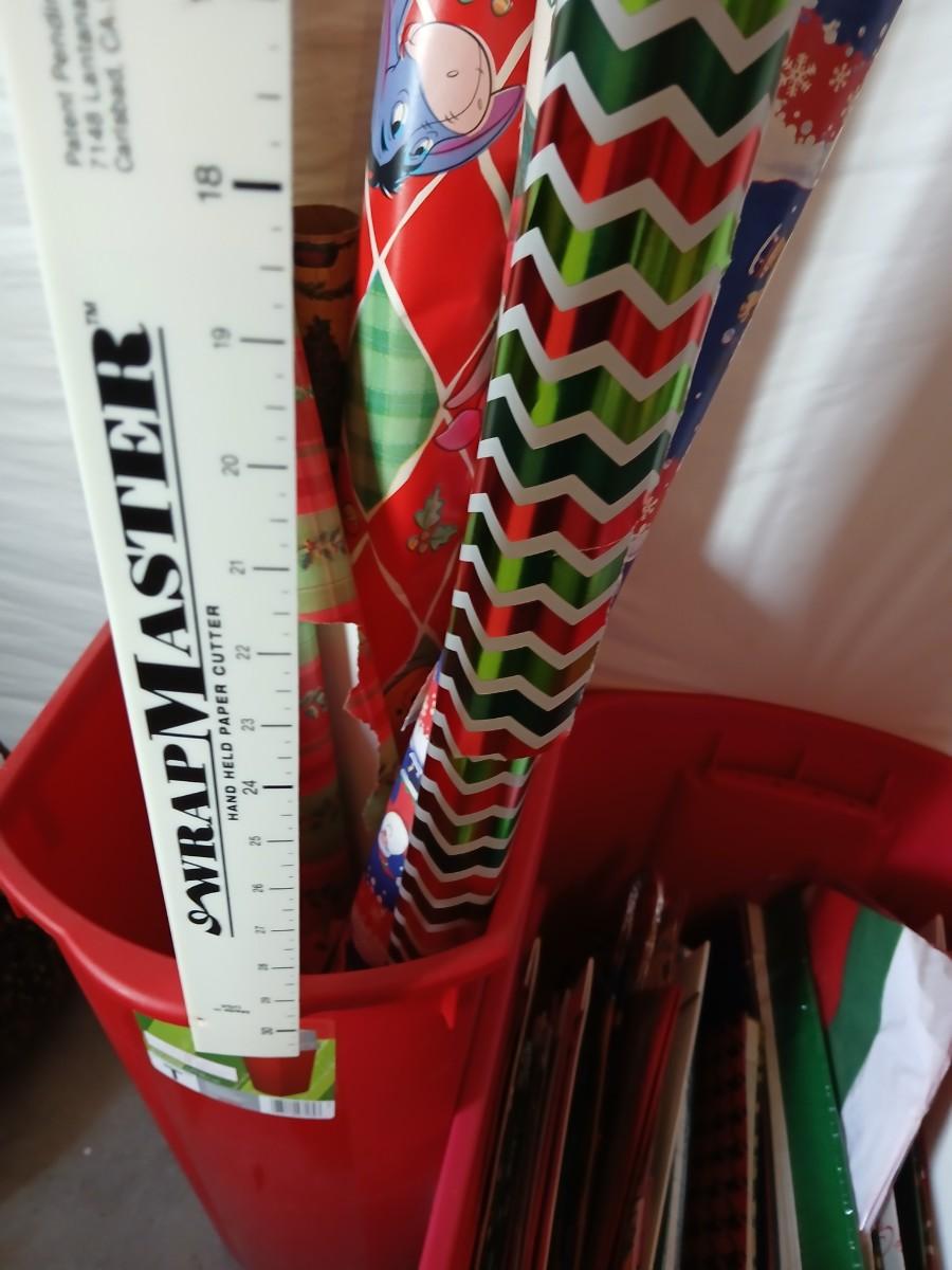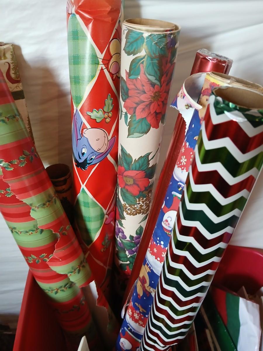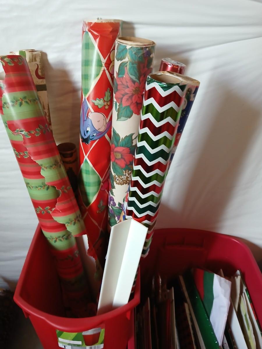 One tall Rubbermaid tote filled with assorted rolls of Christmas wrapping paper (festive prints including Santa, chevron, ornaments, and more)