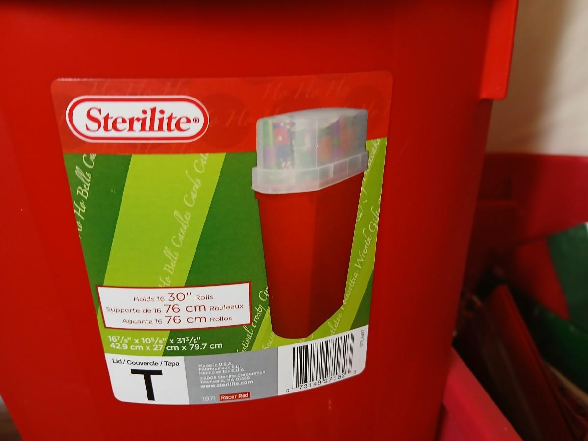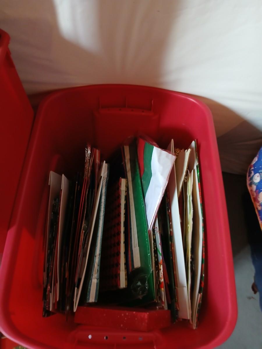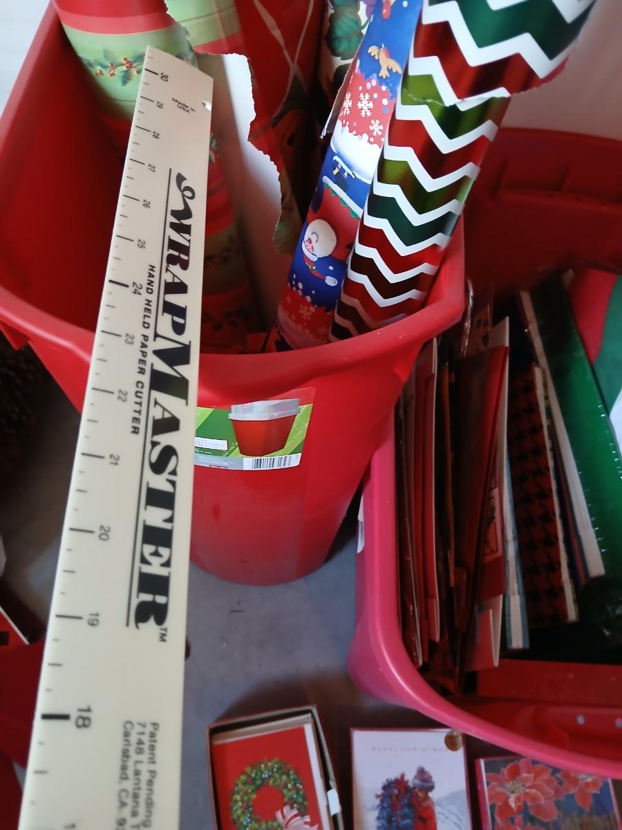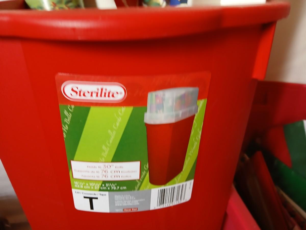 One tall Rubbermaid tote filled with assorted rolls of Christmas wrapping paper (festive prints including Santa, chevron, ornaments, and more)